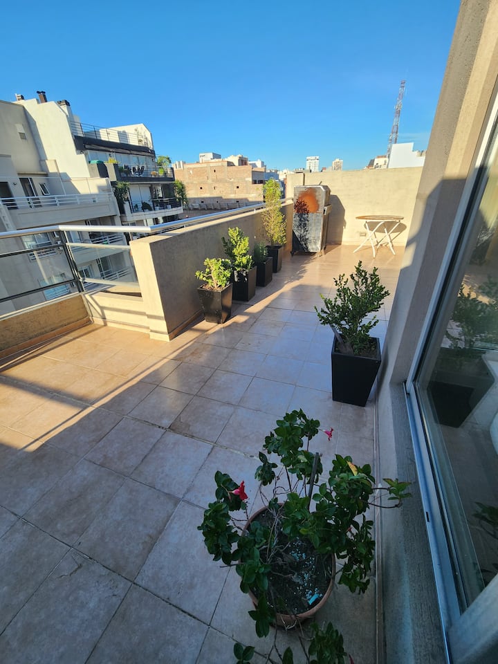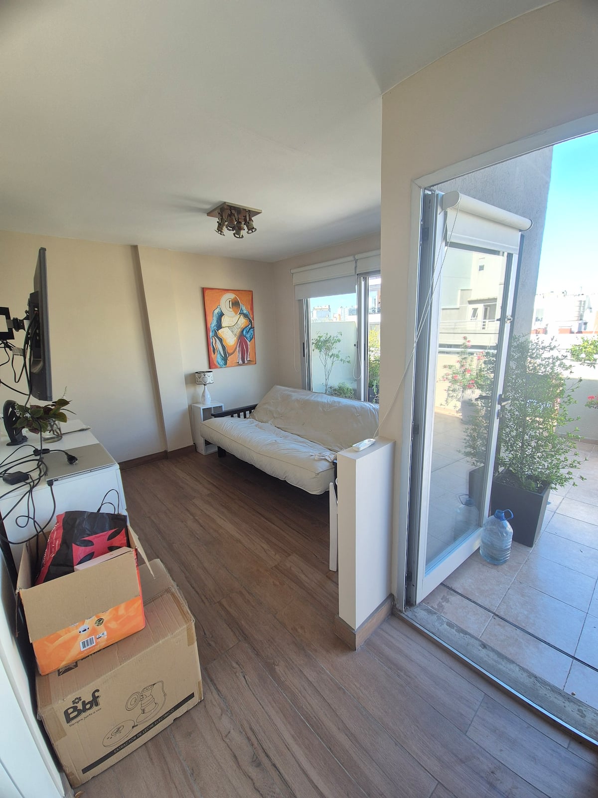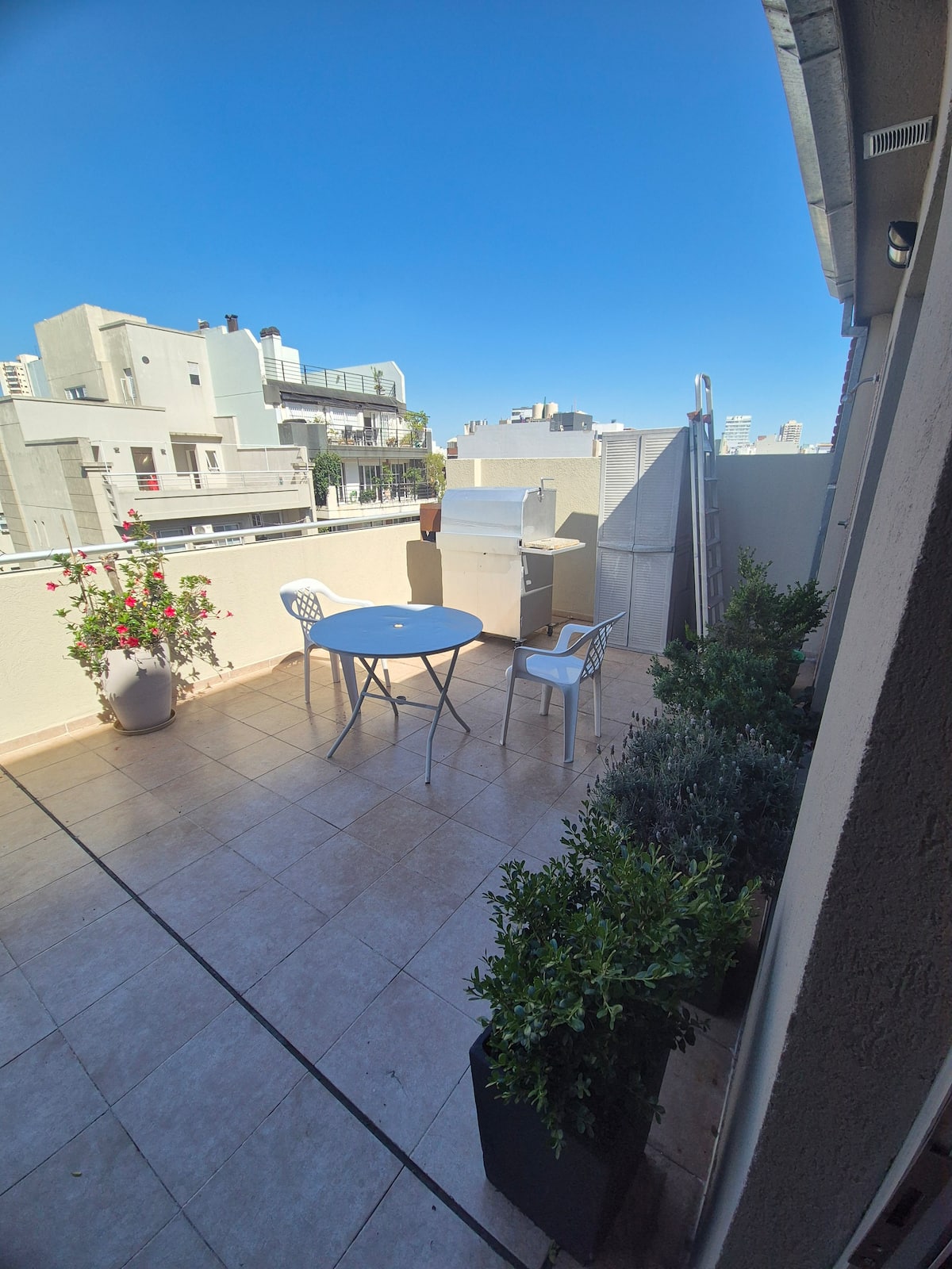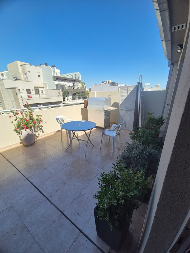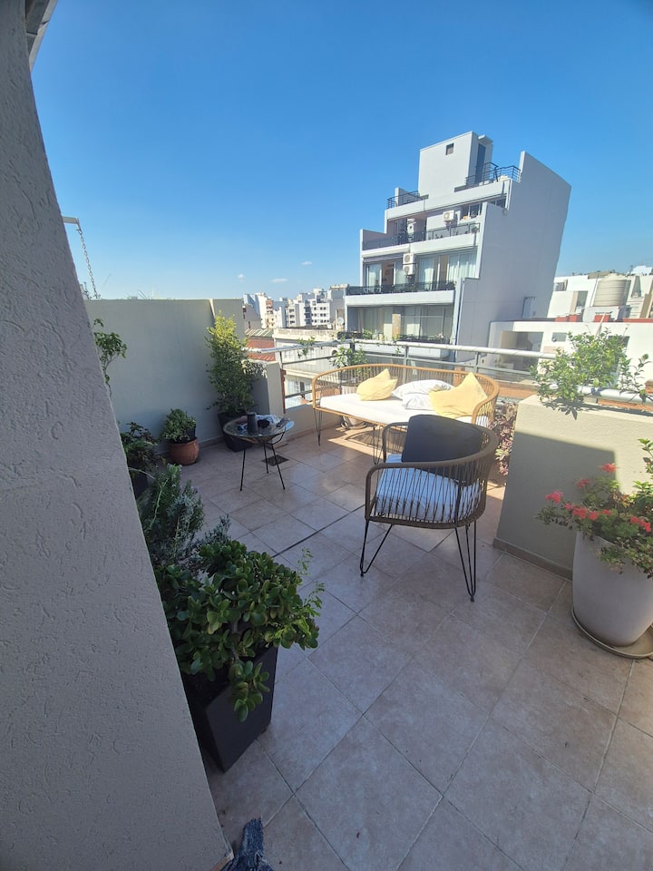 Bright studio apartment with 34 m², on the top floor. Includes space for a two-person bed, a kitchen, and a work desk or studio area. The unit has a 25 m² balcony terrace with open views.