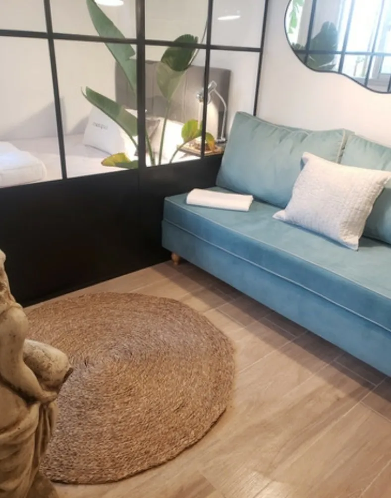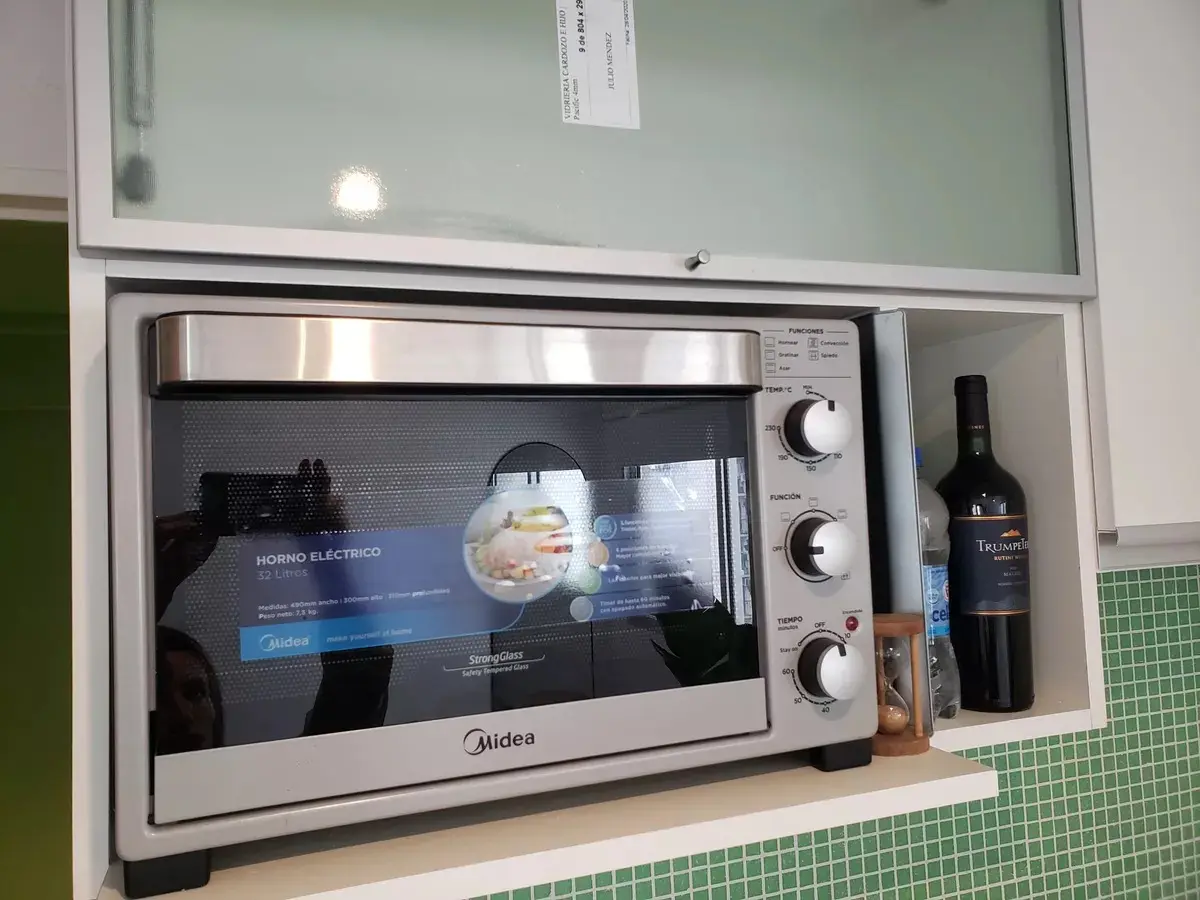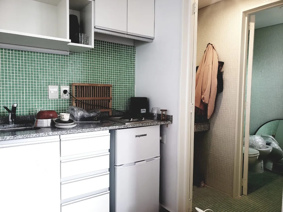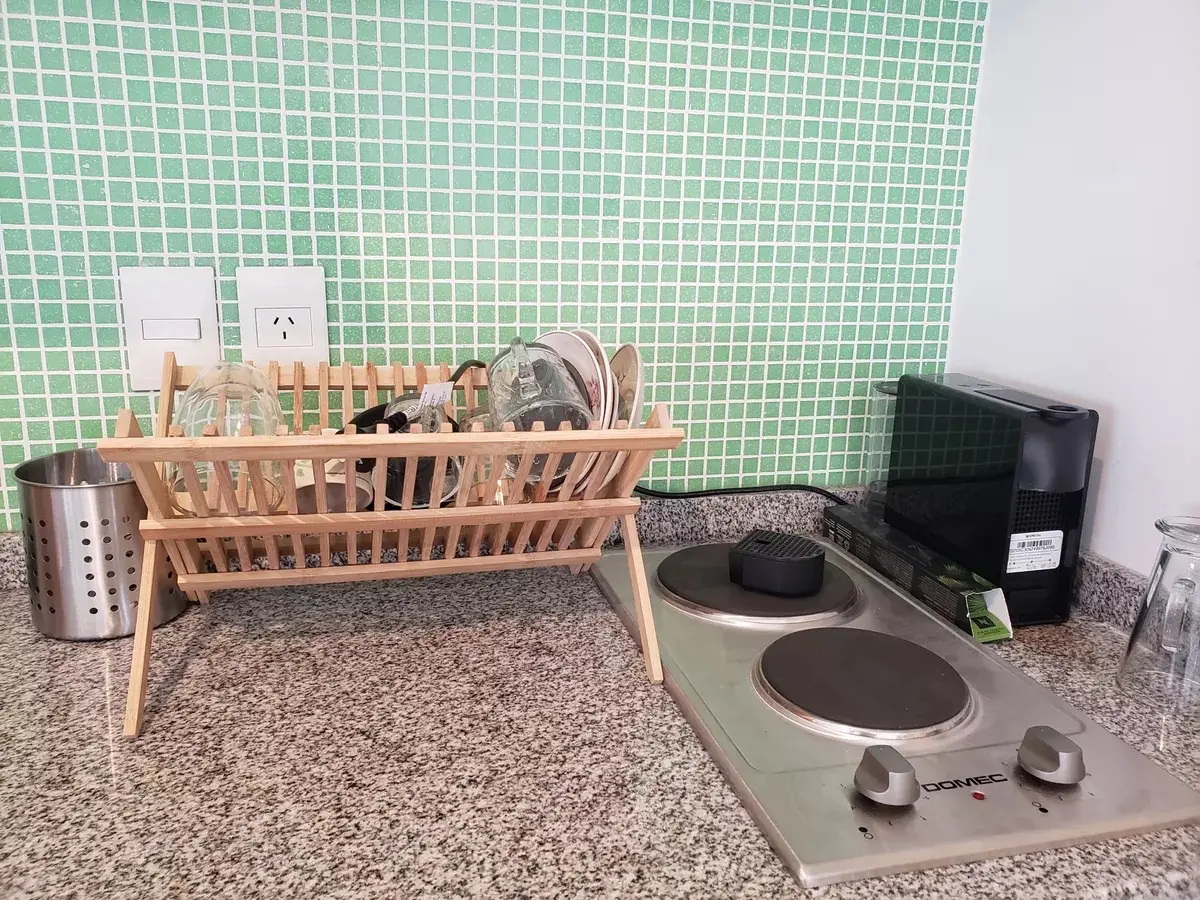 Studio apartment in Caballito, between Caballito and Villa Crespo, available from 4 June 2026. The unit is divided, with street noise reduction and lateral-facing windows, equipped with a double bed, built-in wardrobe, and air conditioning. The kitchen is fitted with upper and base cabinets and includes an electric hot plate, electric oven, Nespresso coffee machine, fridge-freezer, and cookware and tableware; bathroom has a full shower. The building has ramps for reduced mobility, security, a po