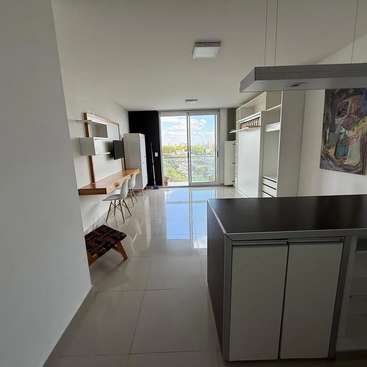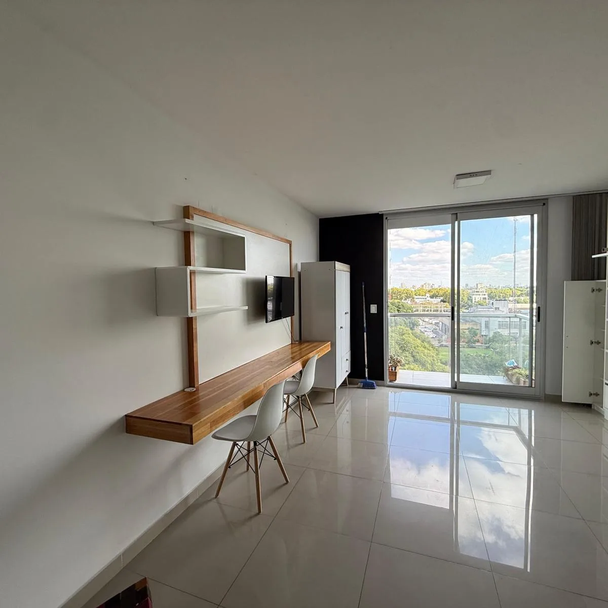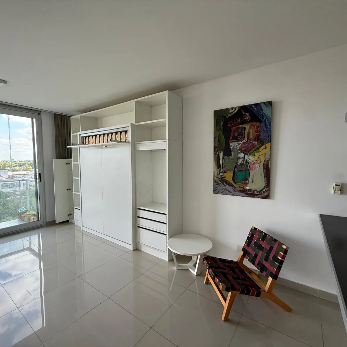 Furnished studio apartment in Chacarita at the corner of Av. Corrientes and Concepción Arenal. The room has a fold-up bed (bed that raises and lowers), a kitchenette with a refrigerator and microwave, and a desk with chairs. There is a closet and storage space, space for two bar stools, and no connection for a clothes washer or laundry facilities in the building. Building fees are low, with BBQ grills on the ground-floor level (PBL) and storage for bicycles.