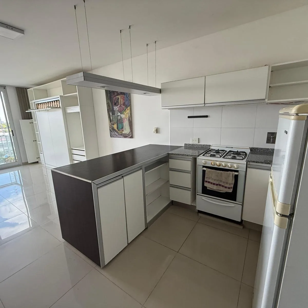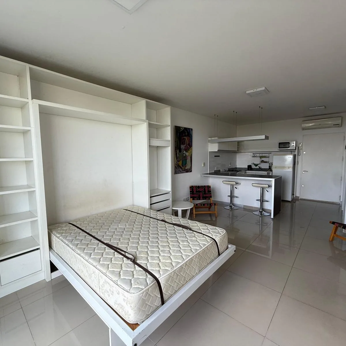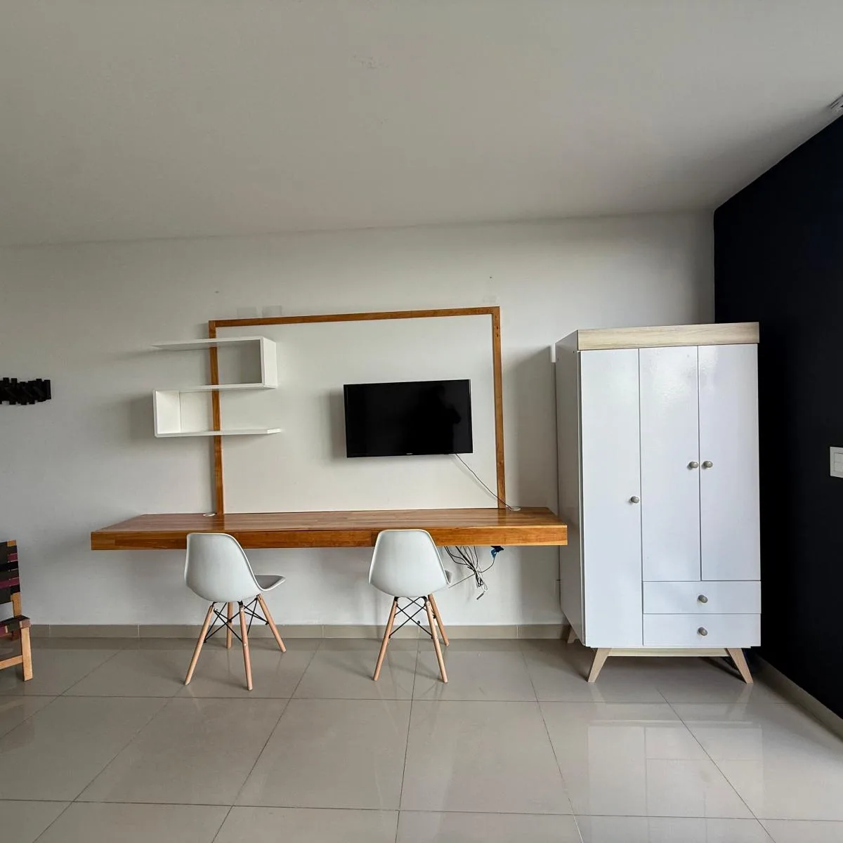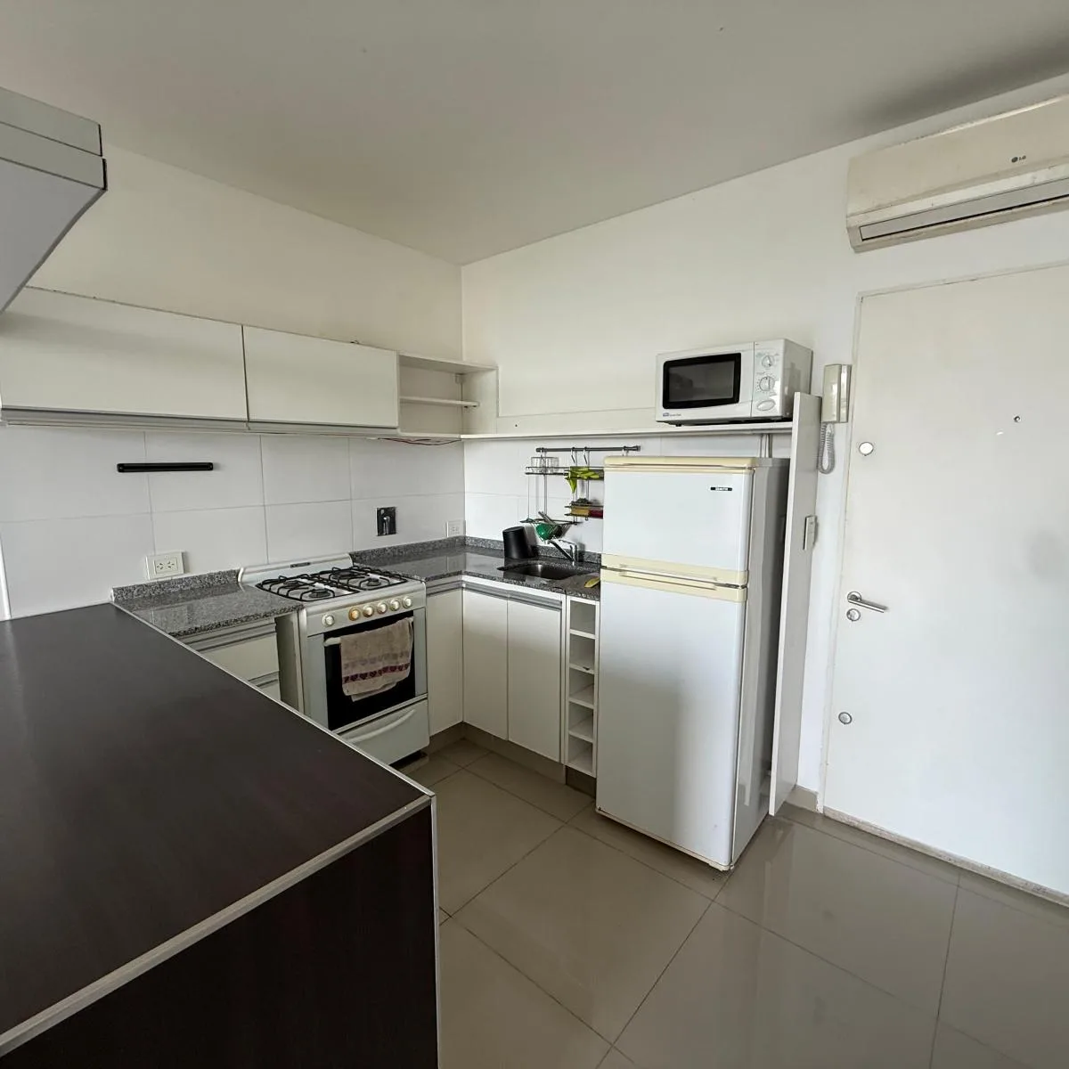 Furnished studio apartment in Chacarita at the corner of Av. Corrientes and Concepción Arenal. The room has a fold-up bed (bed that raises and lowers), a kitchenette with a refrigerator and microwave, and a desk with chairs. There is a closet and storage space, space for two bar stools, and no connection for a clothes washer or laundry facilities in the building. Building fees are low, with BBQ grills on the ground-floor level (PBL) and storage for bicycles.