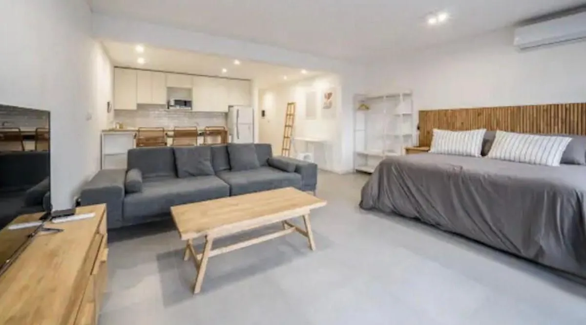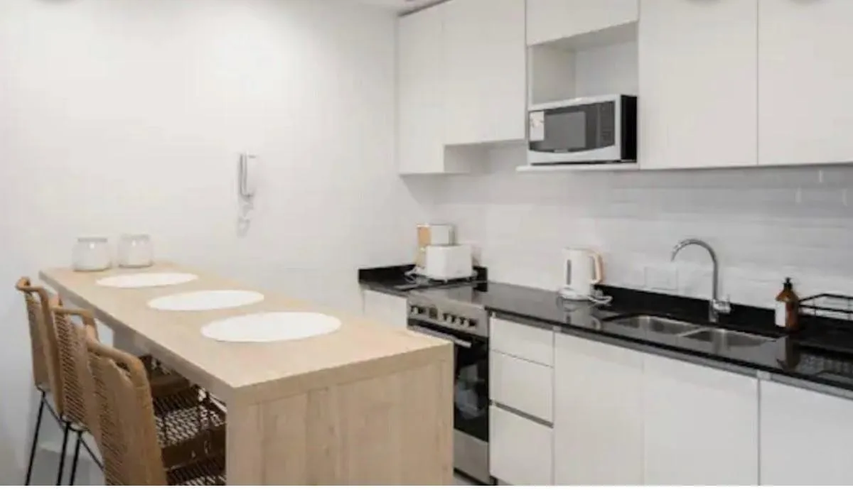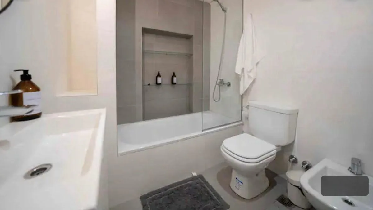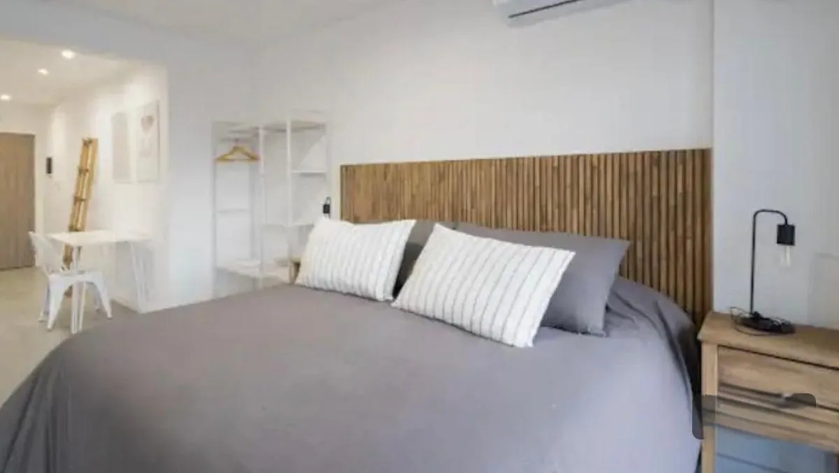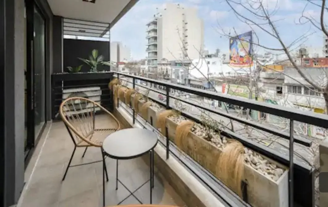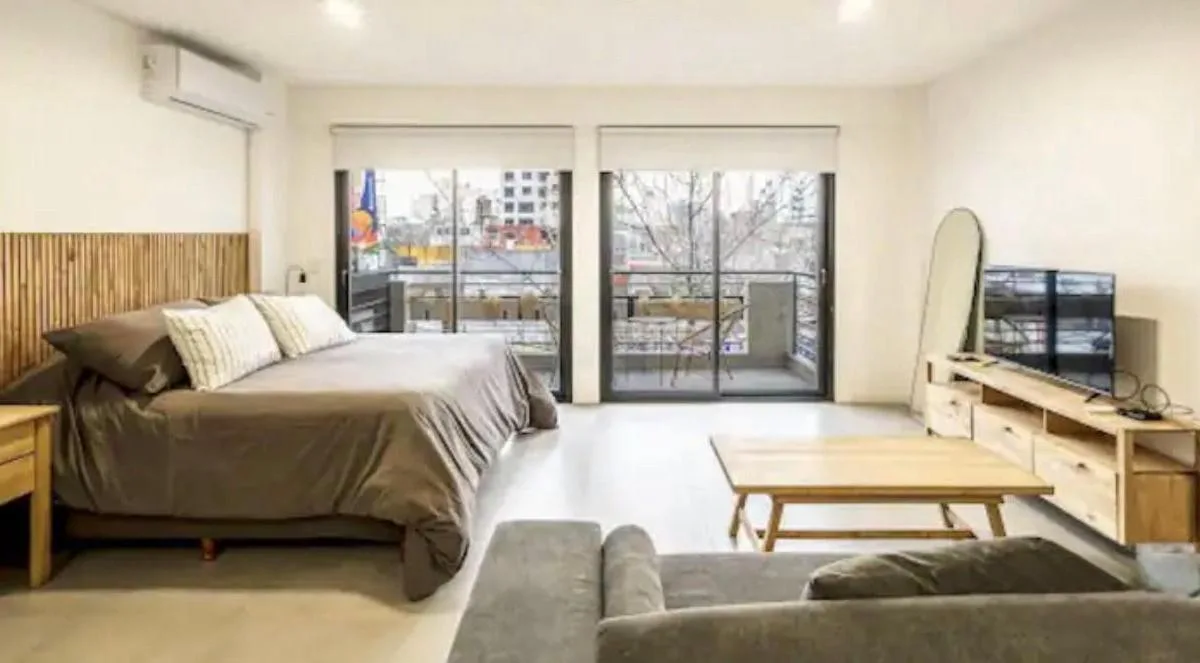 Studio apartment with a balcony in Chacarita, located at Córdoba and Ravignani. The unit has an integrated kitchen with a breakfast bar, a full bathroom, king bed, air conditioning and radiant floor heating. Building amenities include laundry, a rooftop terrace with solarium and a grill, plus a sauna, and the rent includes internet and cable. Monthly rent is USD 750 plus building fees of $210,000; electricity consumption is paid by the tenant.