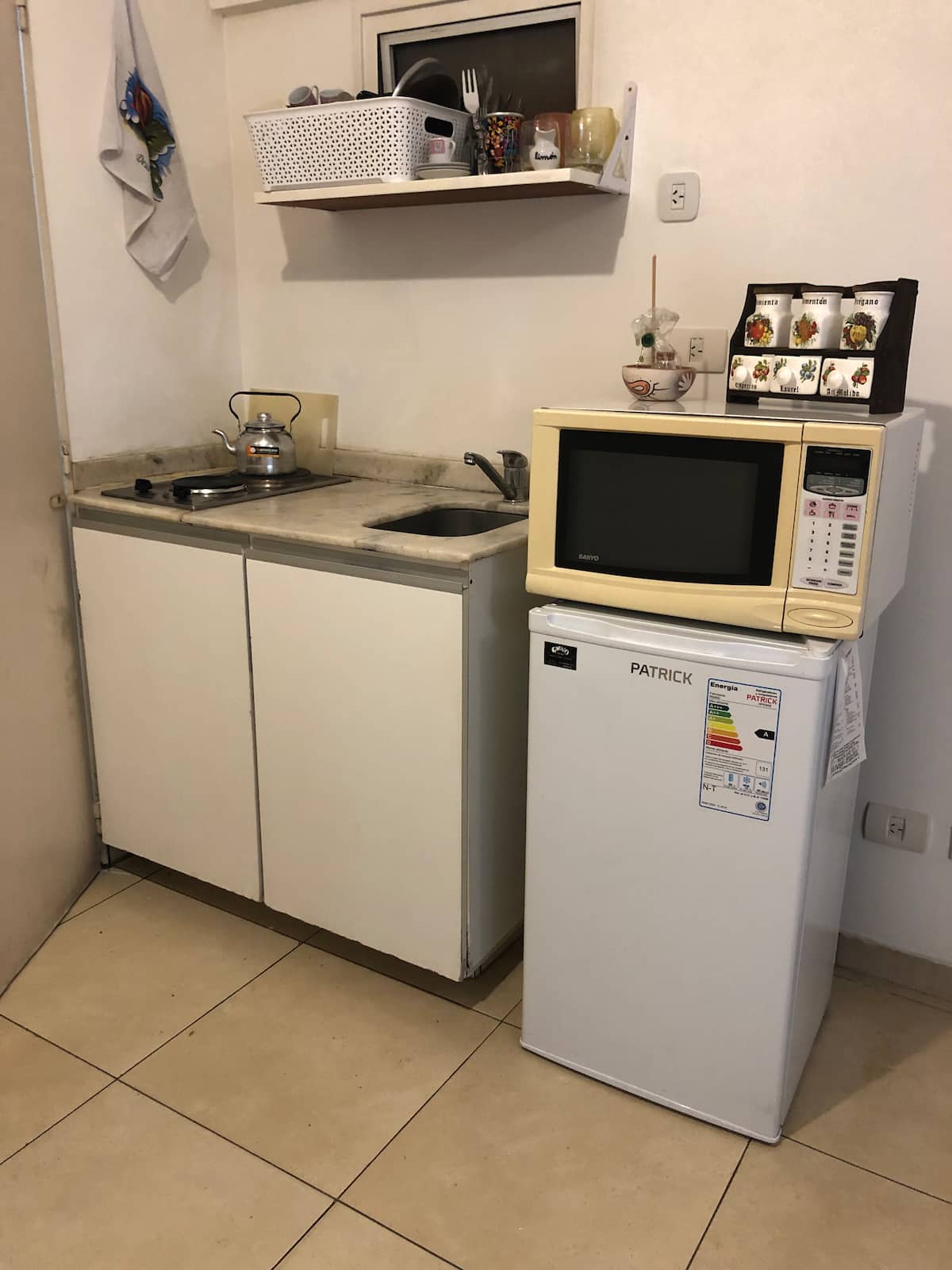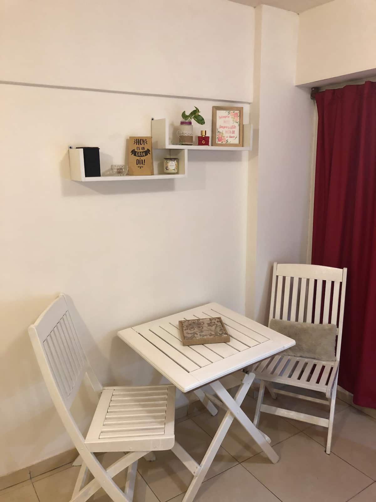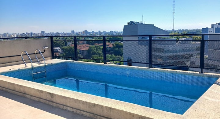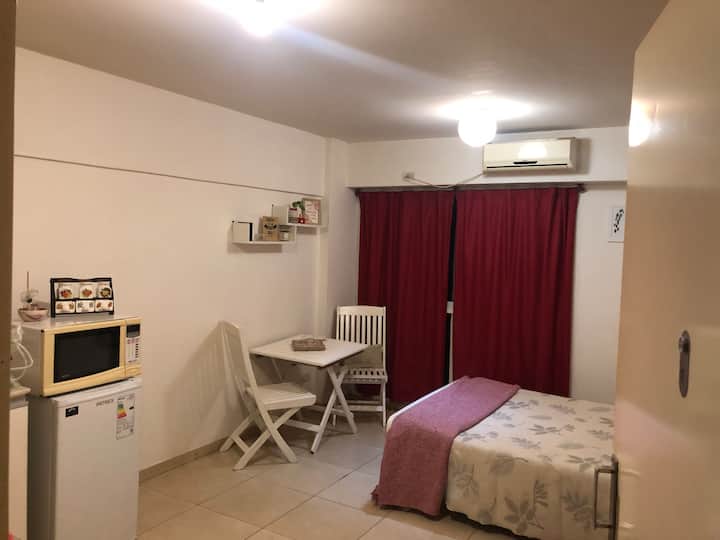 Studio apartment of 18 m² in an internal courtyard-facing setting in Chacarita. The building has a pool and residents can use commonly used washer and dryers on the top floor. No smoking inside the apartment. The listing states access to Subte Line B and several bus lines.