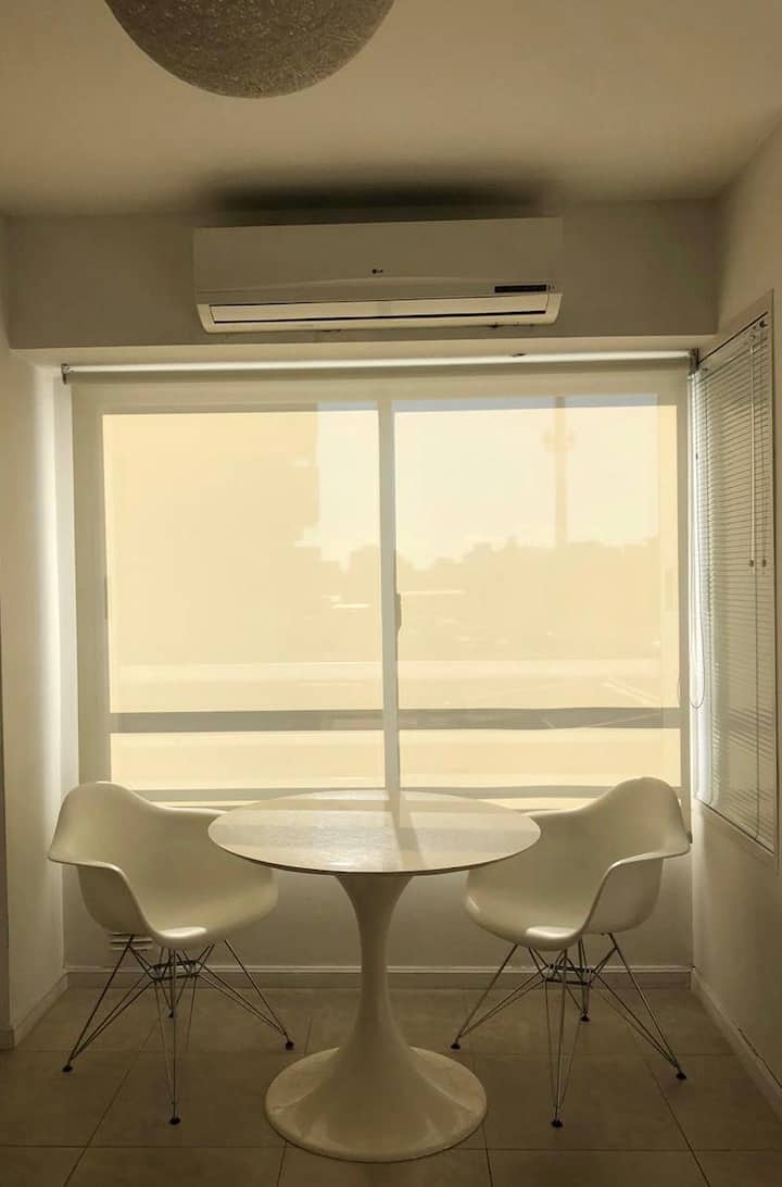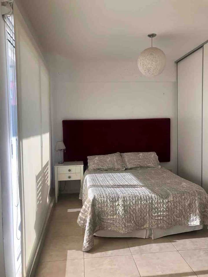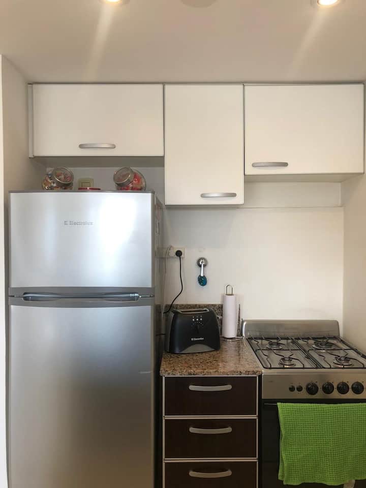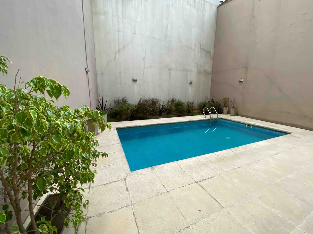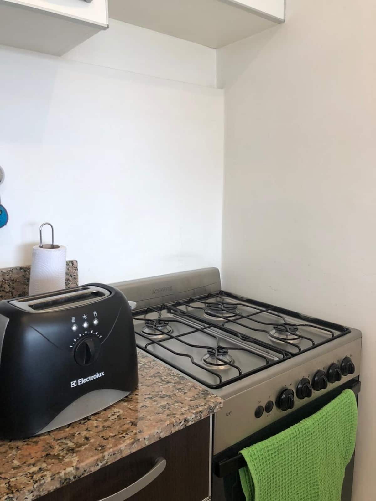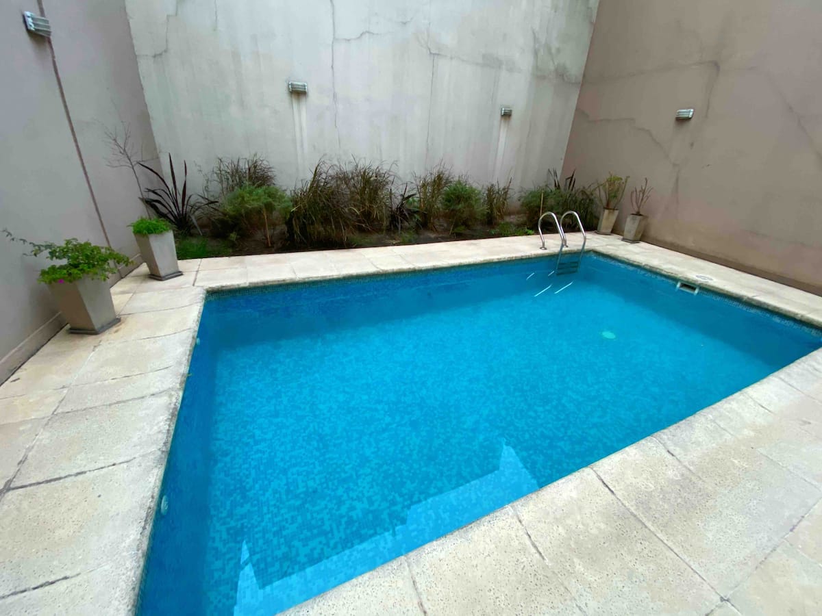 Fifth-floor studio apartment in Chacarita with large windows and a balcony. Fully furnished with a double bed, blackout curtains, air conditioning (hot/cold), a smart TV, and WiFi. Kitchen includes an oven, stove, microwave, refrigerator/freezer, toaster, and electric kettle. The building has a shared pool on the ground floor, and the apartment has a full bathroom with hair dryer and bathroom extractor.