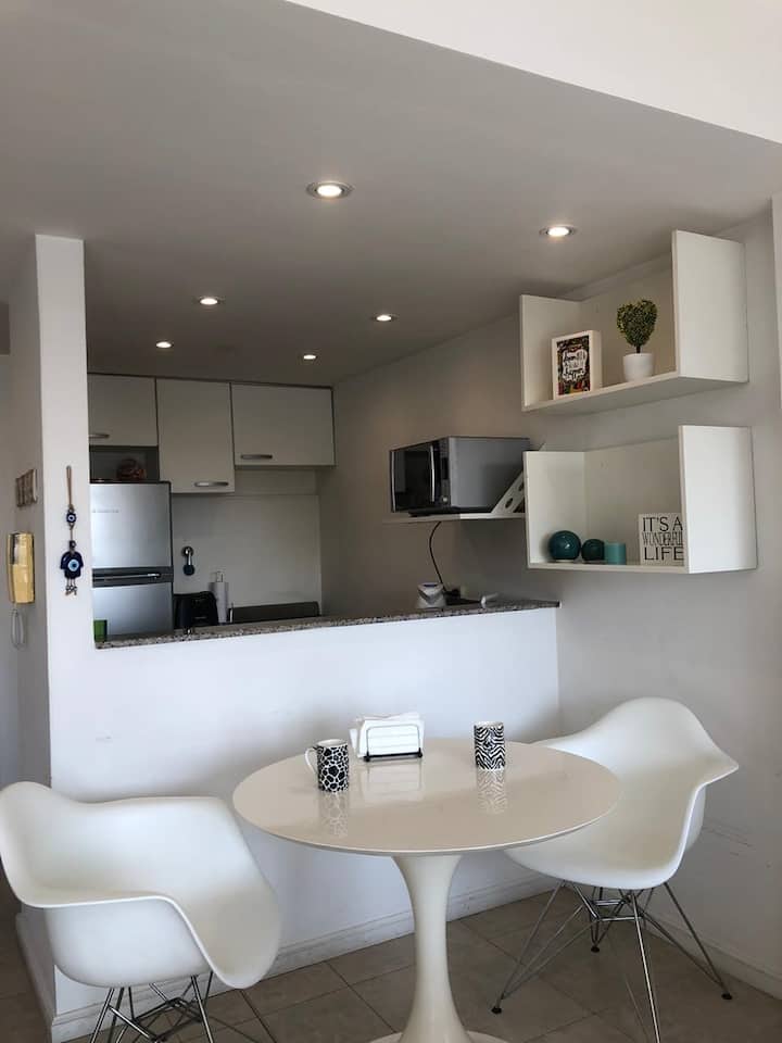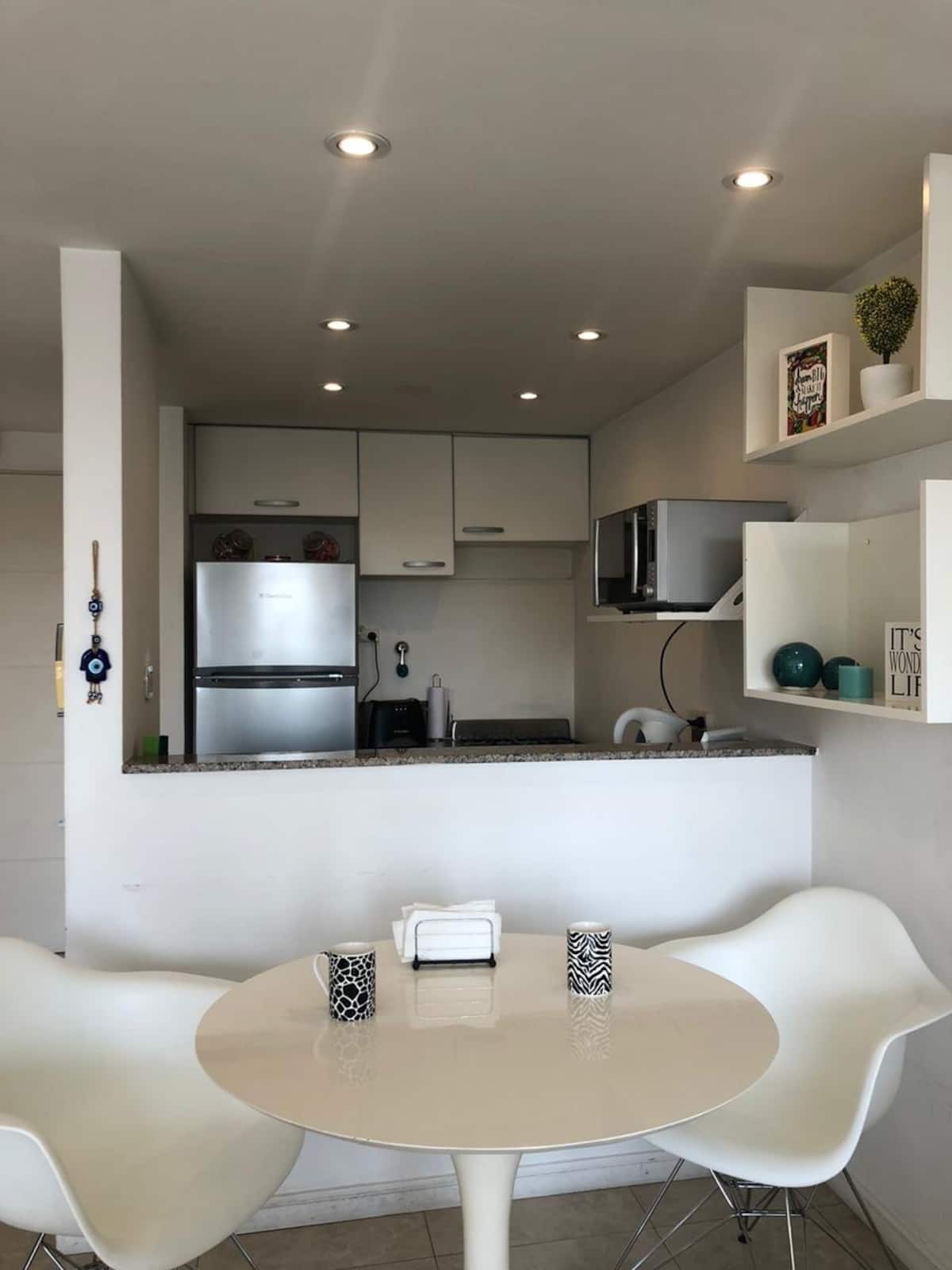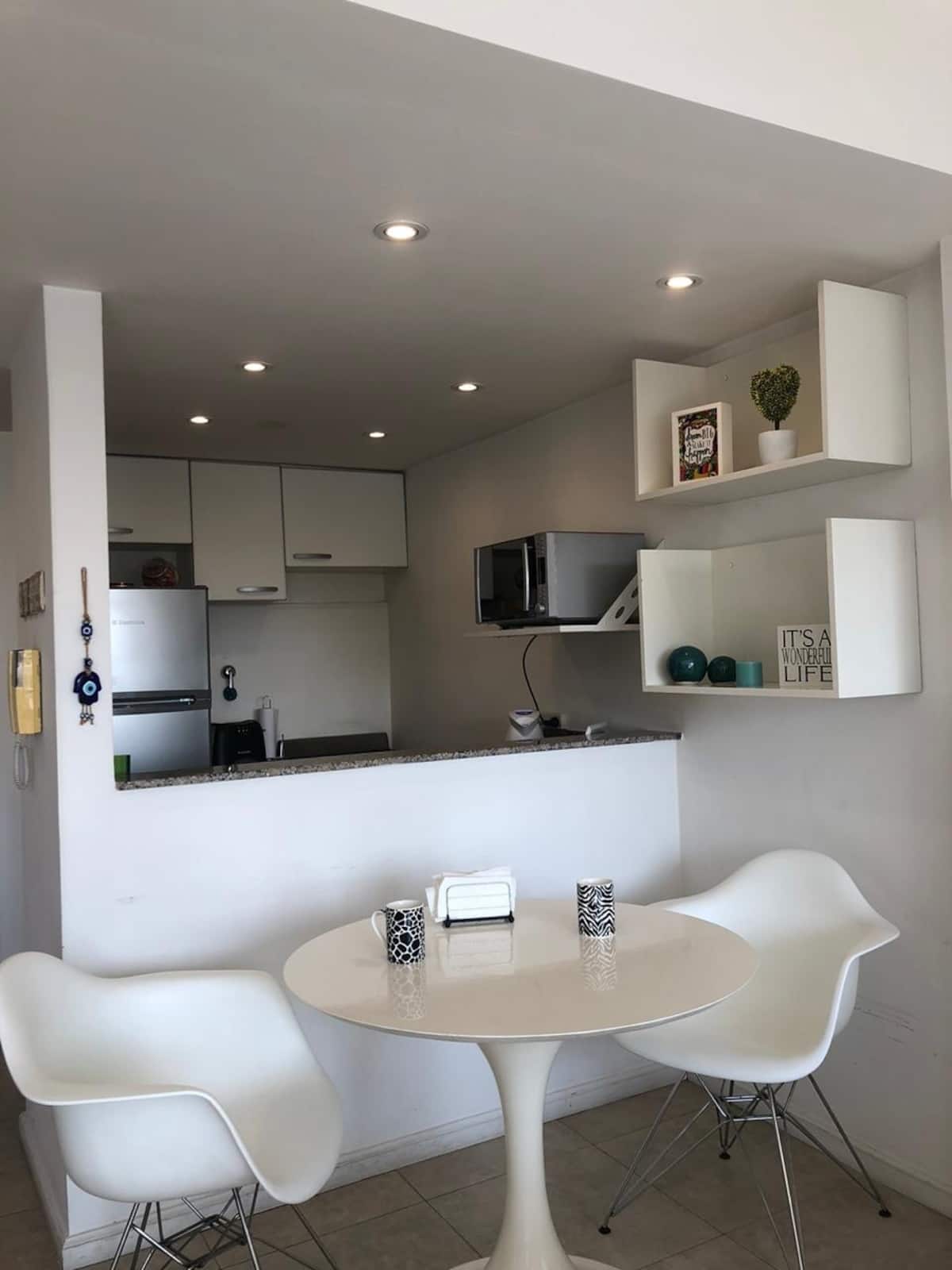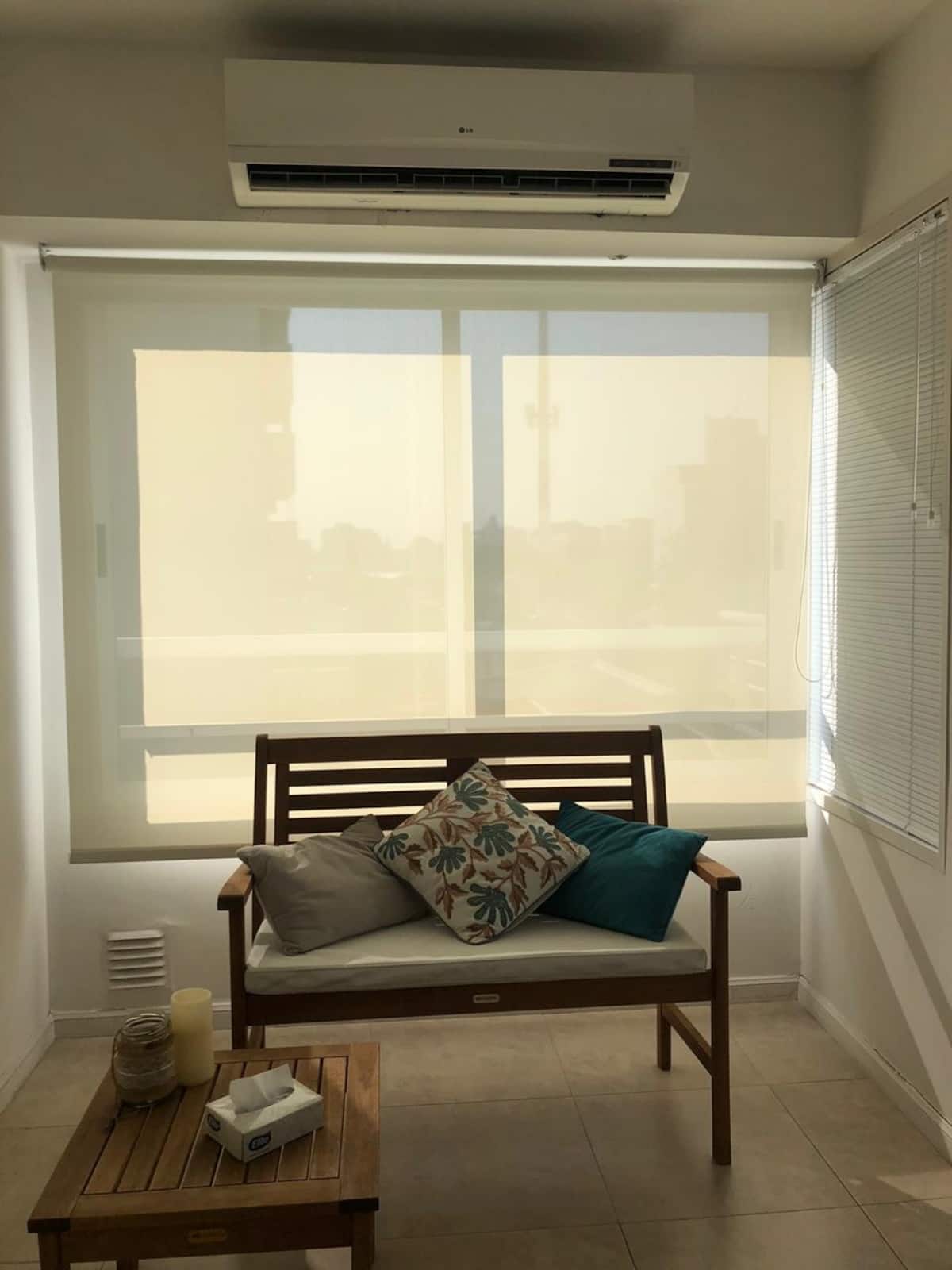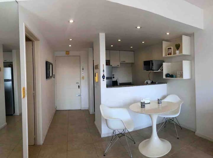 Fifth-floor studio apartment in Chacarita with large windows and a balcony. Fully furnished with a double bed, blackout curtains, air conditioning (hot/cold), a smart TV, and WiFi. Kitchen includes an oven, stove, microwave, refrigerator/freezer, toaster, and electric kettle. The building has a shared pool on the ground floor, and the apartment has a full bathroom with hair dryer and bathroom extractor.