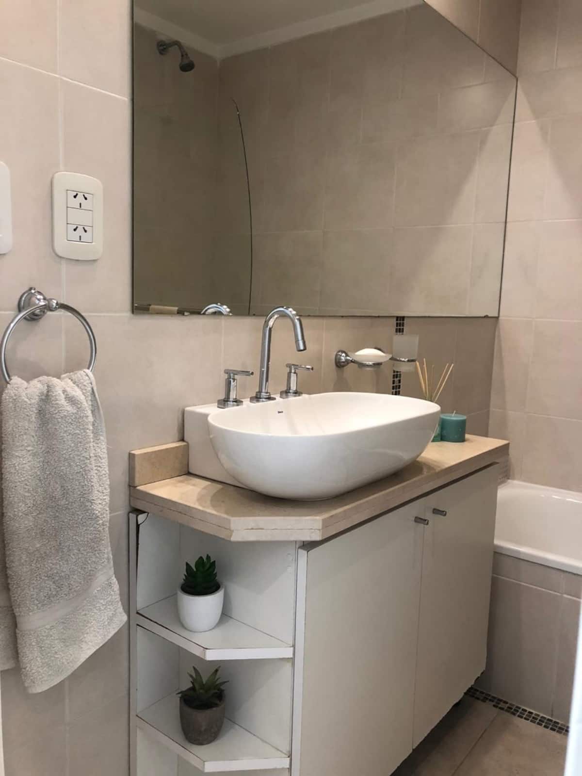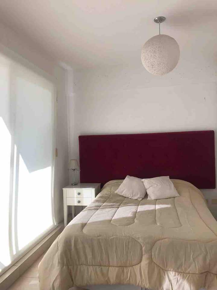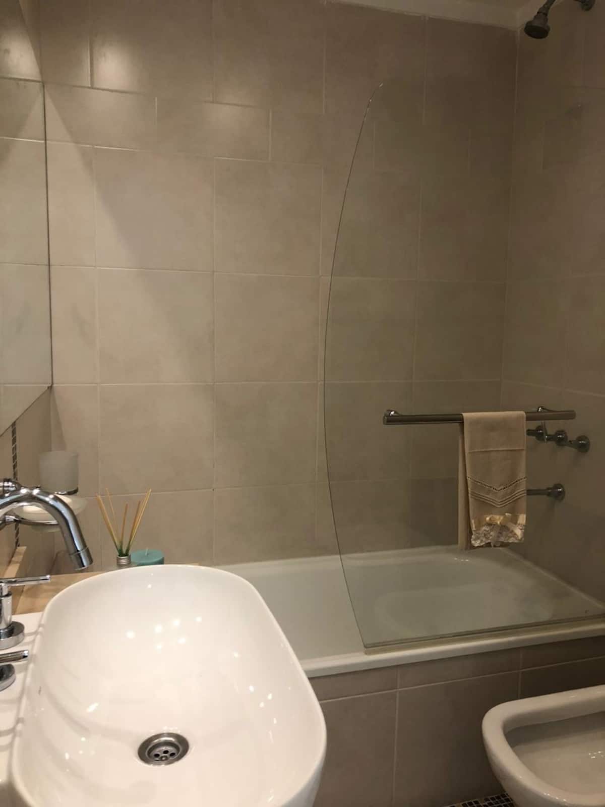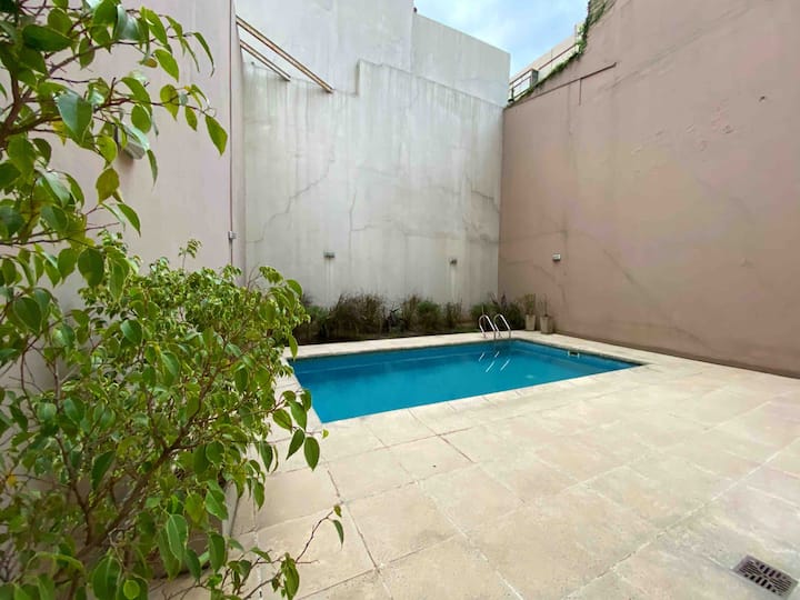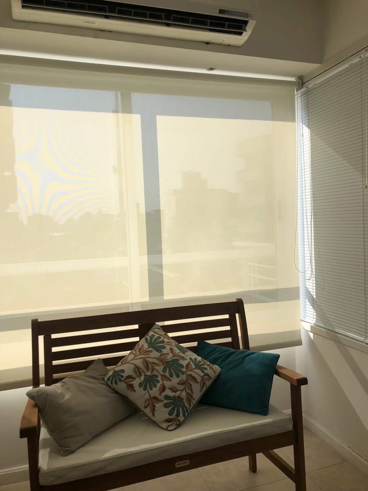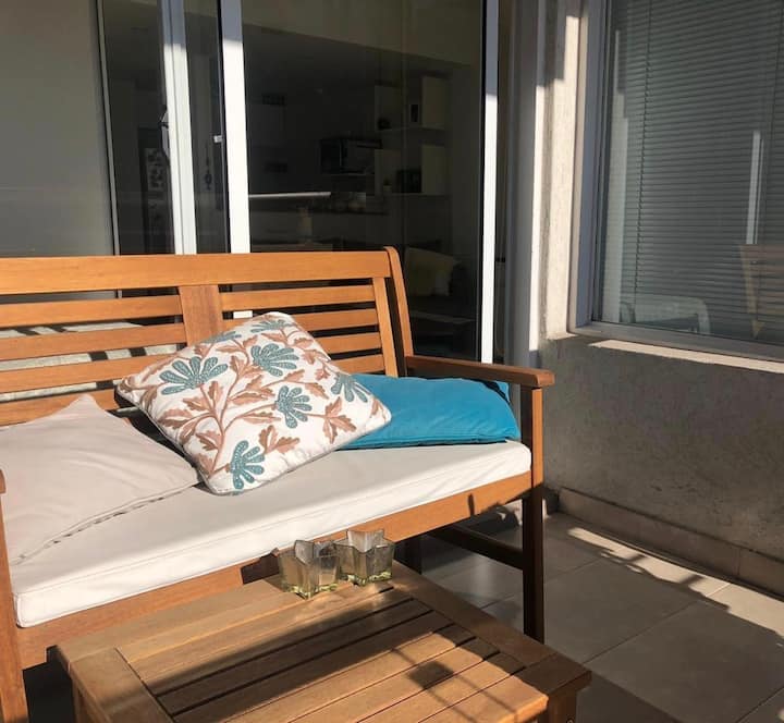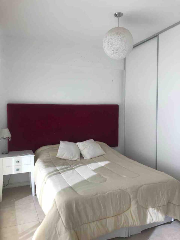 Fifth-floor studio apartment in Chacarita with large windows and a balcony. Fully furnished with a double bed, blackout curtains, air conditioning (hot/cold), a smart TV, and WiFi. Kitchen includes an oven, stove, microwave, refrigerator/freezer, toaster, and electric kettle. The building has a shared pool on the ground floor, and the apartment has a full bathroom with hair dryer and bathroom extractor.