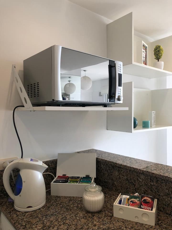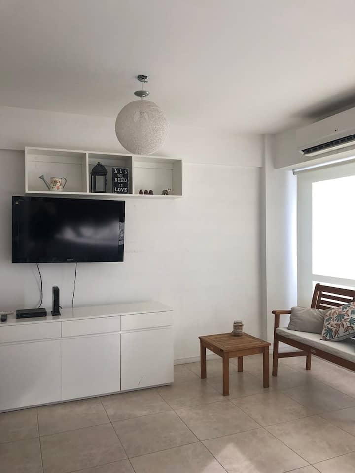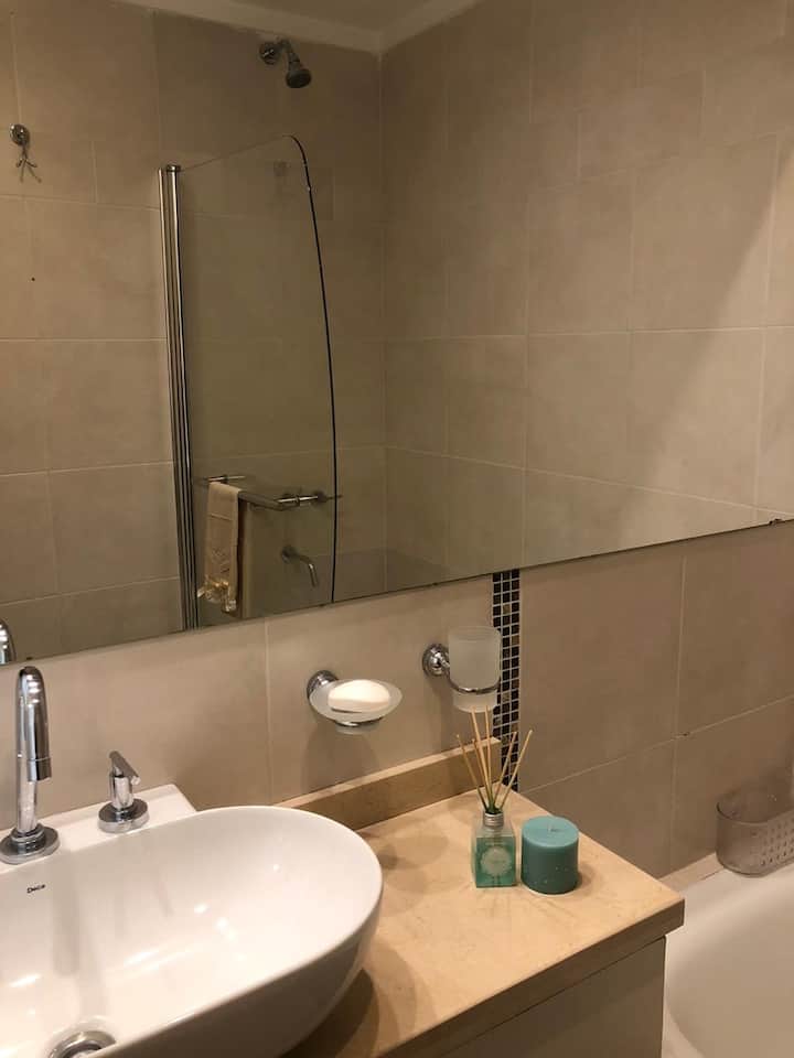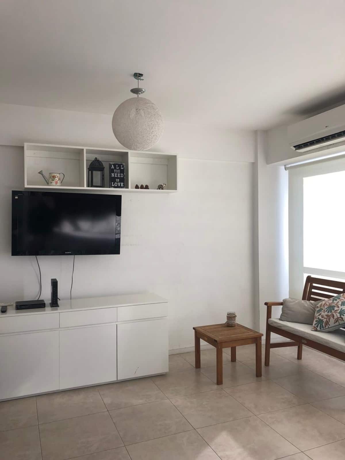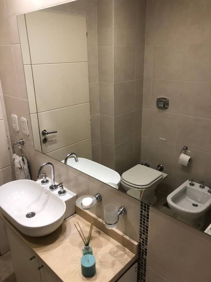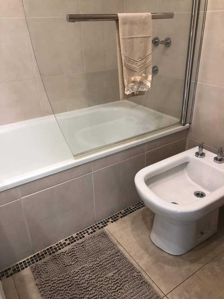 Fifth-floor studio apartment in Chacarita with large windows and a balcony. Fully furnished with a double bed, blackout curtains, air conditioning (hot/cold), a smart TV, and WiFi. Kitchen includes an oven, stove, microwave, refrigerator/freezer, toaster, and electric kettle. The building has a shared pool on the ground floor, and the apartment has a full bathroom with hair dryer and bathroom extractor.