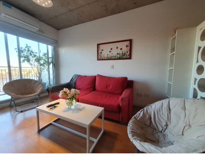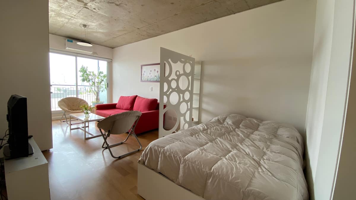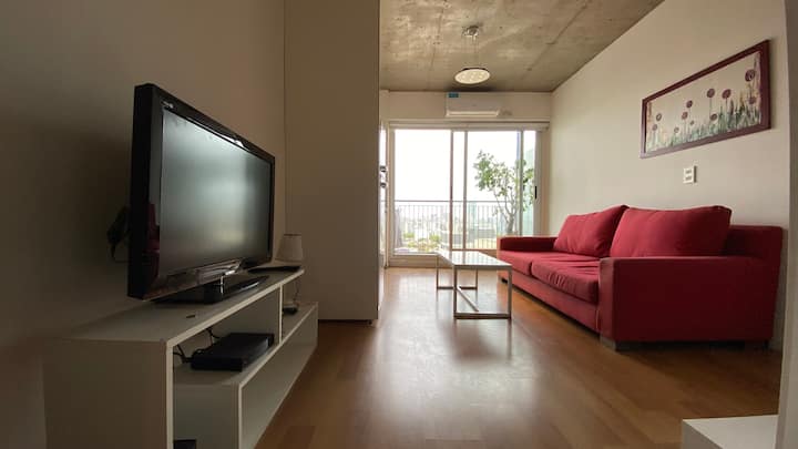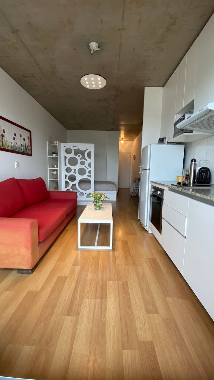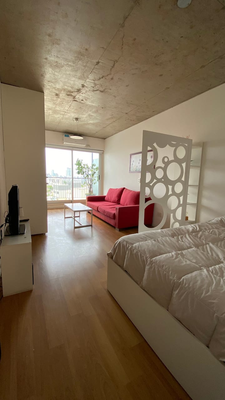 Studio apartment on the 13th floor in a building with a pool. Fully equipped with hot/cold air conditioning, smart TV (with Chromecast), cable and WiFi, and a kitchen with oven, stove, microwave and electric kettle. Full bathroom with a bathtub and a balcony with an open view.