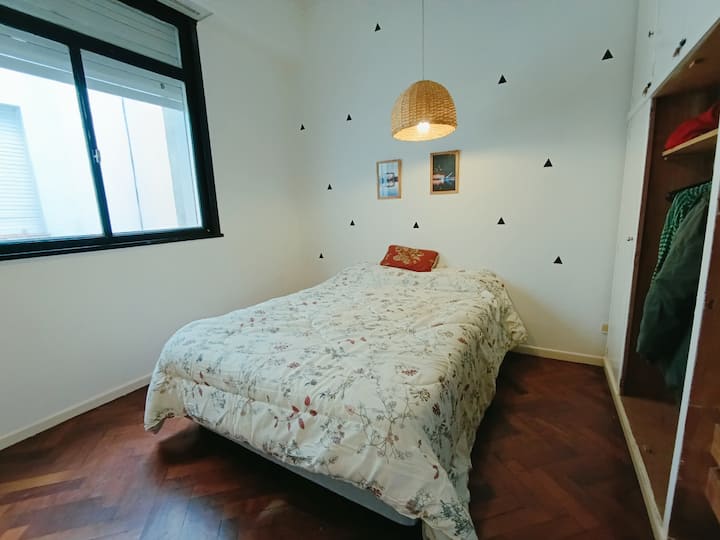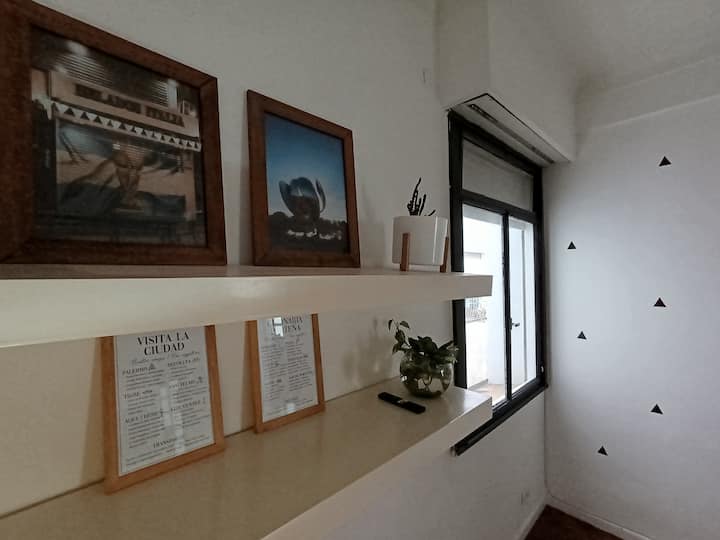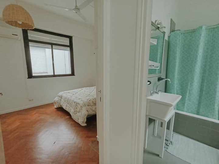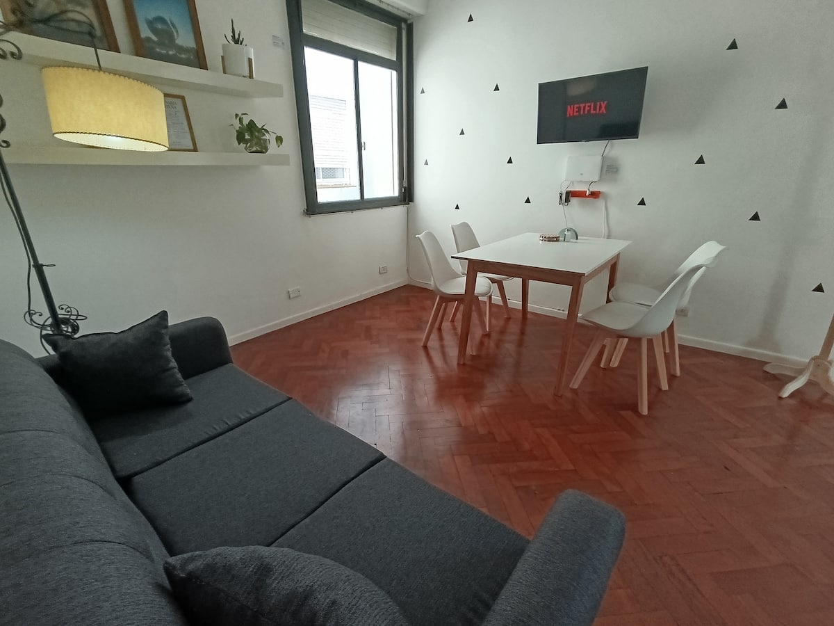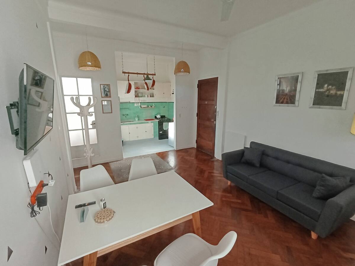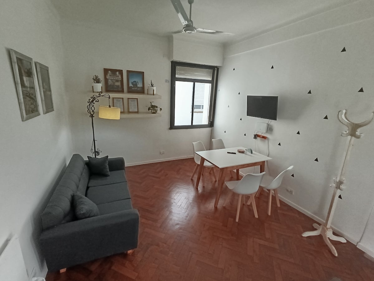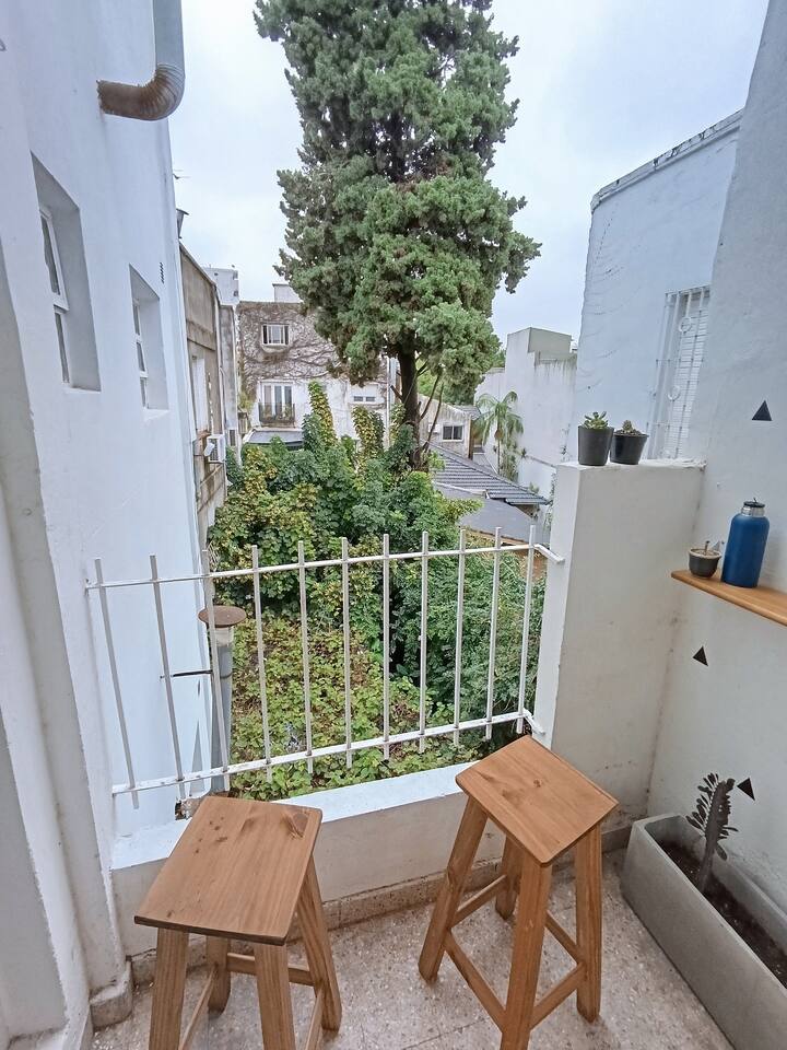 Two-room studio apartment in Colegiales. It is a PH requiring stairs up two floors. It has a double bed, a full bathroom, large closets, a living/dining area with a 32-inch Smart TV and a work area, and a fully equipped kitchen with fridge, freezer and oven. It includes high-speed Wi-Fi and air conditioning. Capacity for 2 people.
