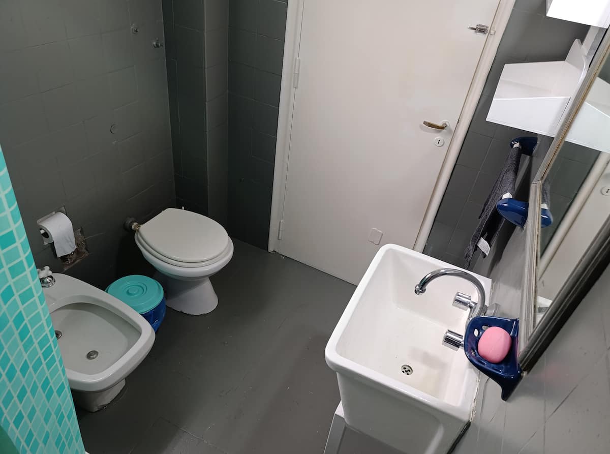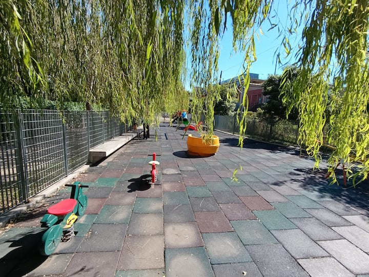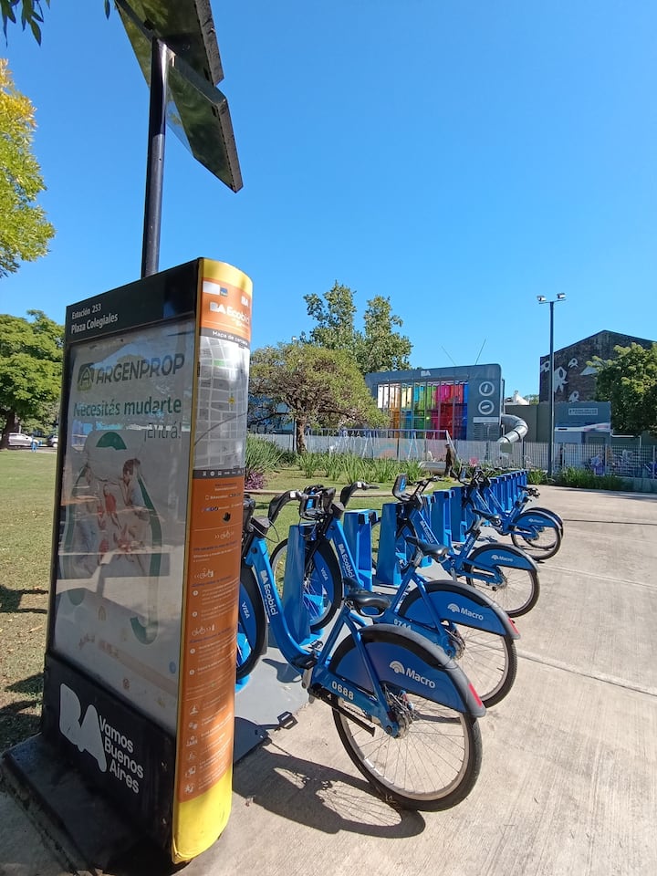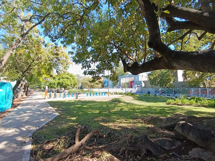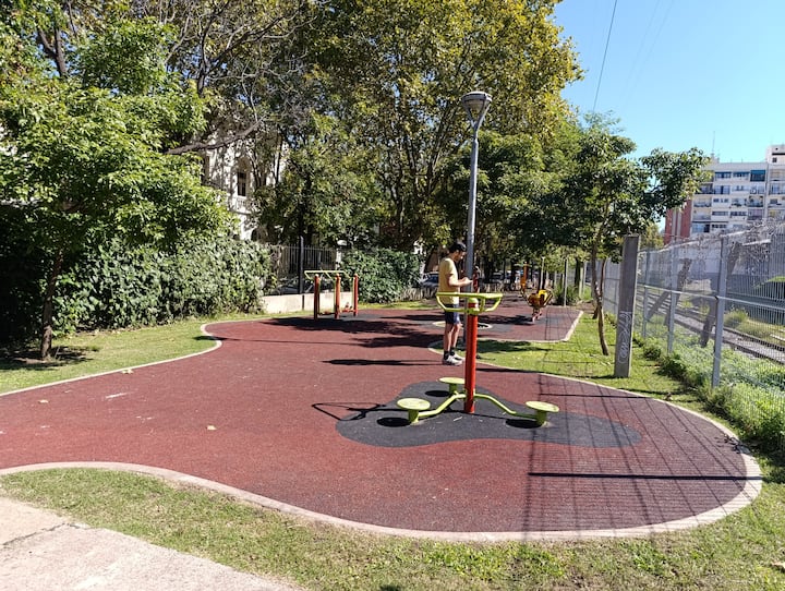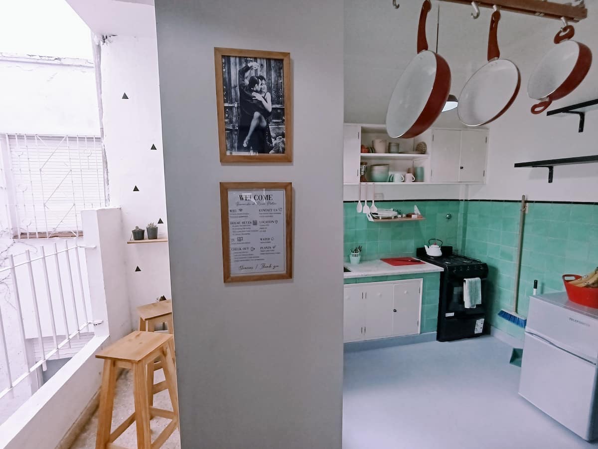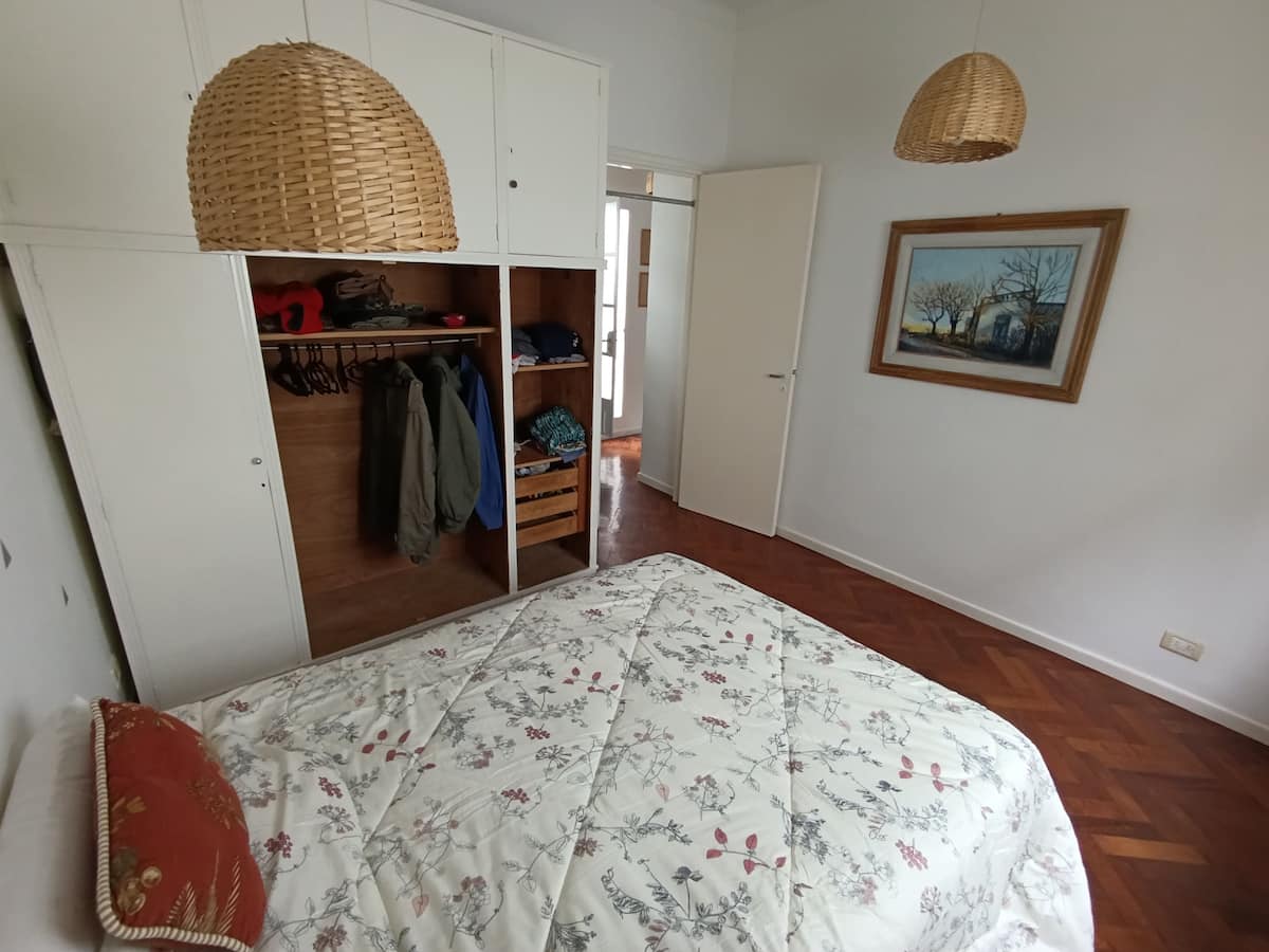 Two-room studio apartment in Colegiales. It is a PH requiring stairs up two floors. It has a double bed, a full bathroom, large closets, a living/dining area with a 32-inch Smart TV and a work area, and a fully equipped kitchen with fridge, freezer and oven. It includes high-speed Wi-Fi and air conditioning. Capacity for 2 people.