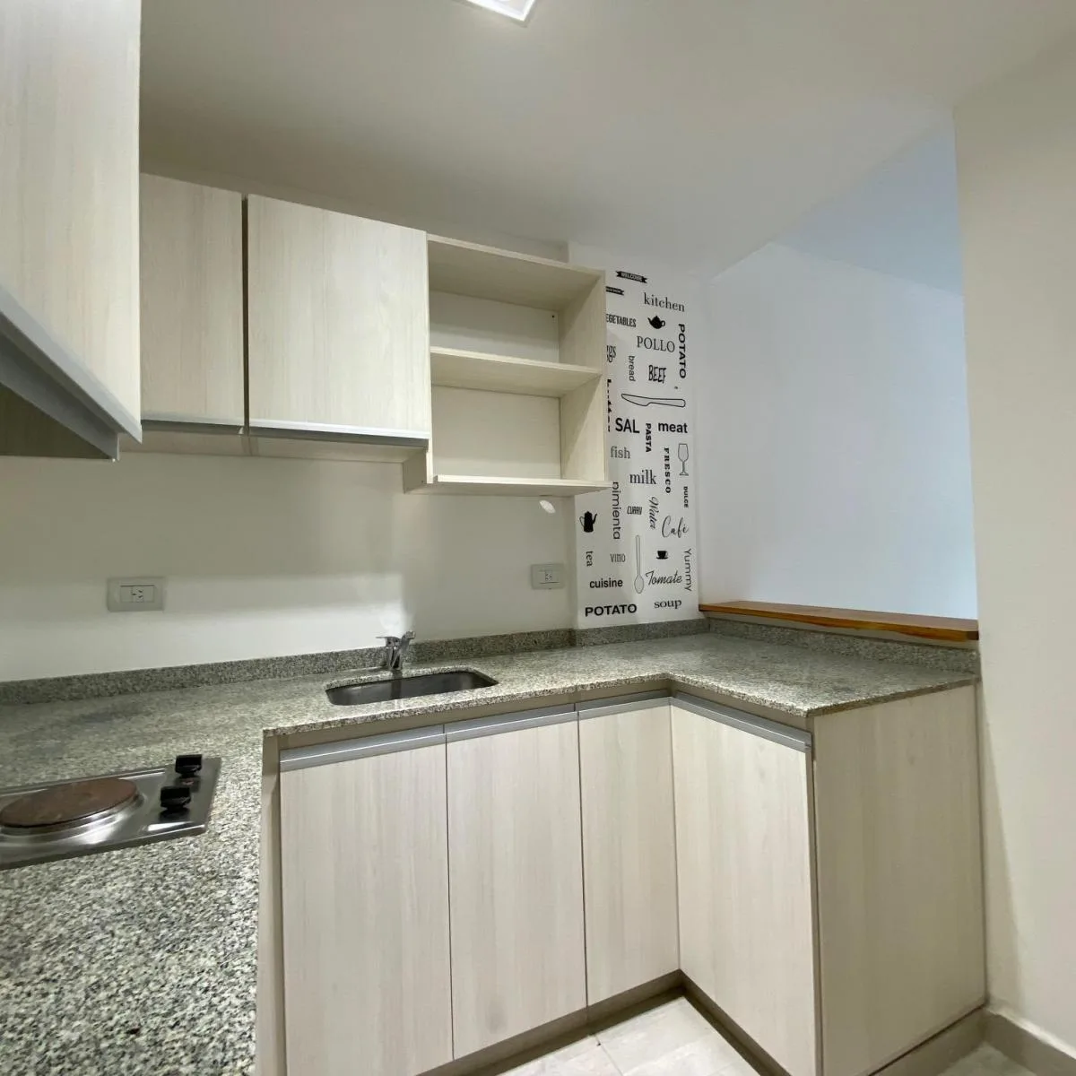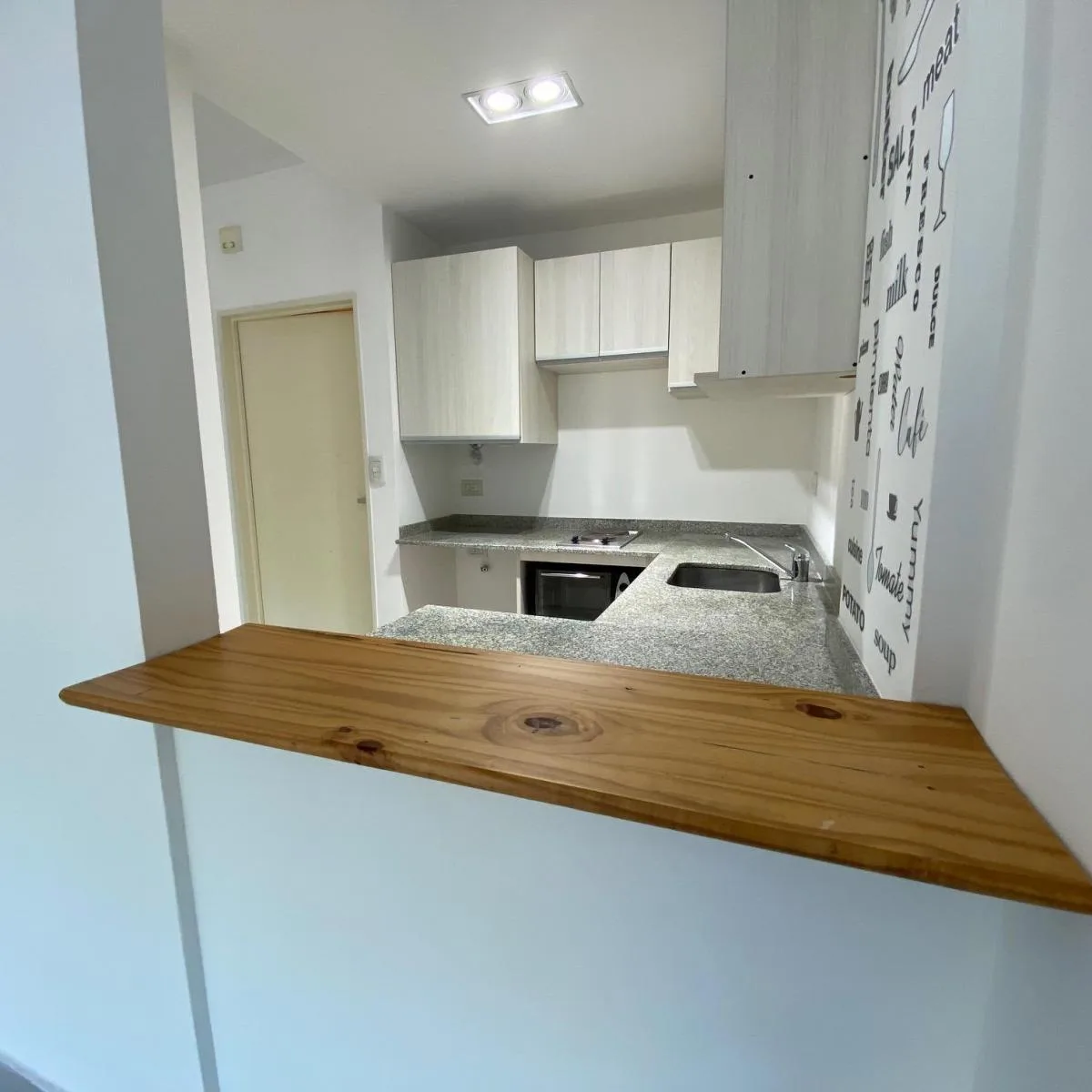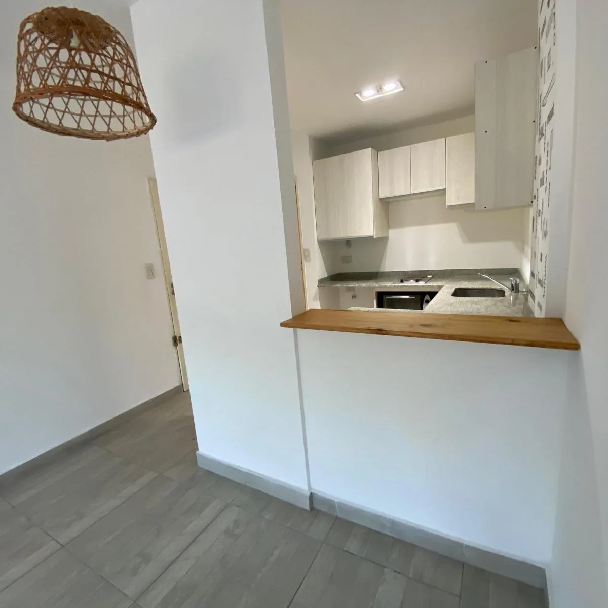 Studio apartment with a front-facing balcony, street-facing, with views of Plaza Álvarez Thomas and Elcano in Colegiales. The unit is in good condition and includes a fitted kitchen with a breakfast bar, storage space, a connection for a washing machine, and a full bathroom with a vanity. Porcelain tile floors are installed.