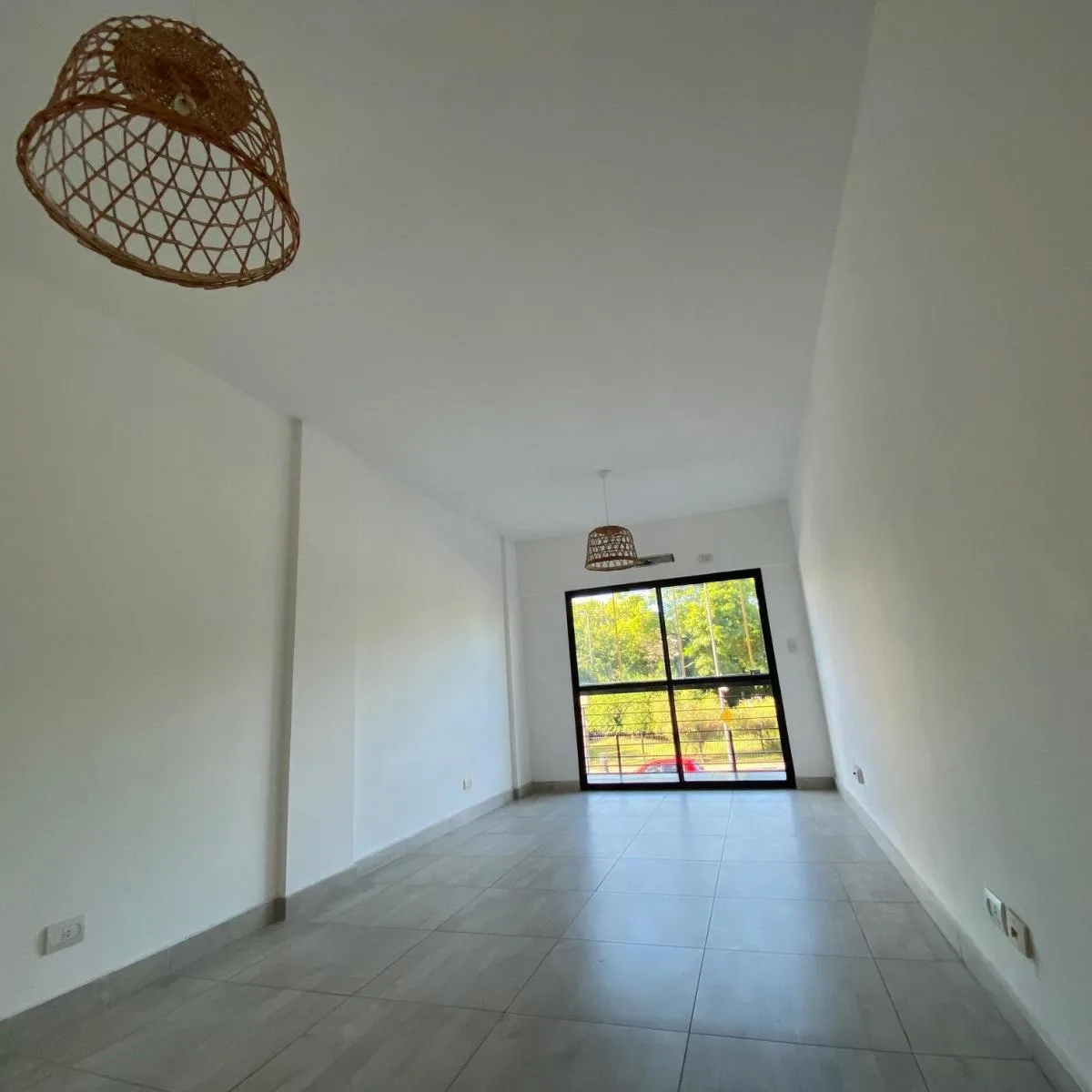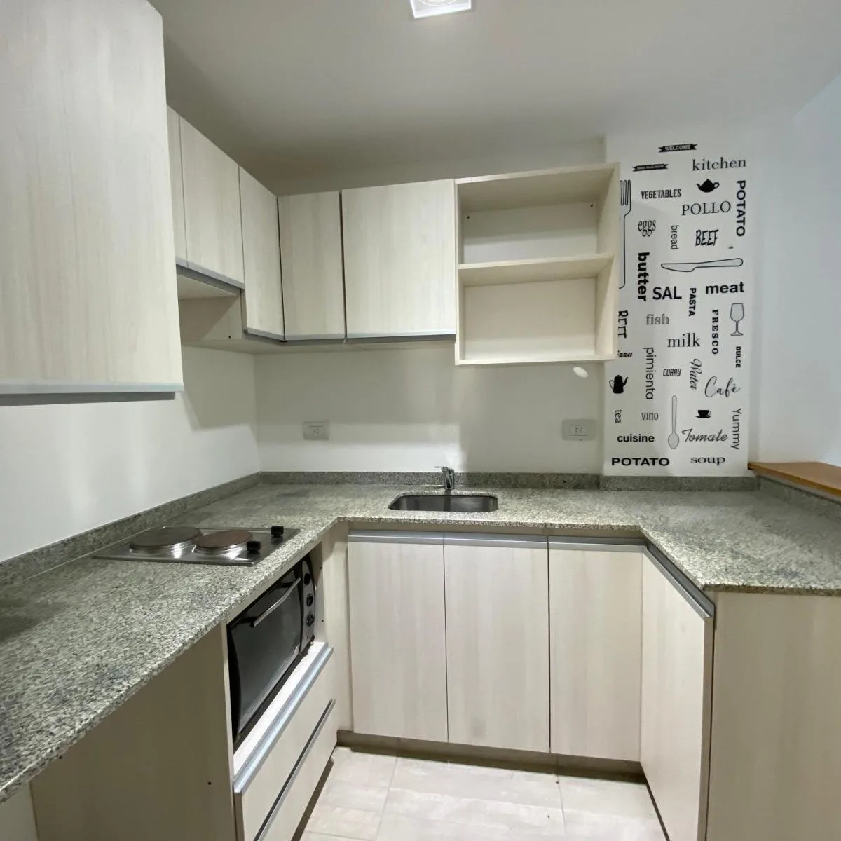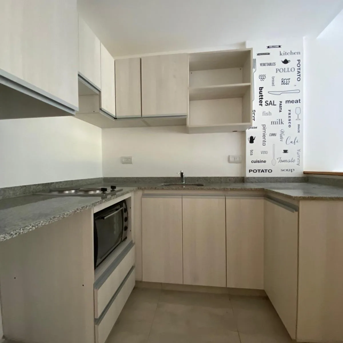 Studio apartment with a front-facing balcony, street-facing, with views of Plaza Álvarez Thomas and Elcano in Colegiales. The unit is in good condition and includes a fitted kitchen with a breakfast bar, storage space, a connection for a washing machine, and a full bathroom with a vanity. Porcelain tile floors are installed.
