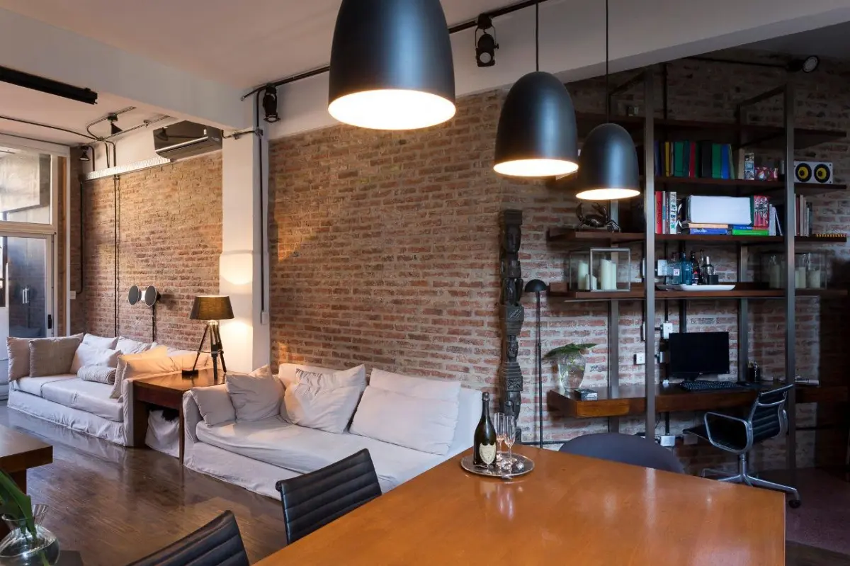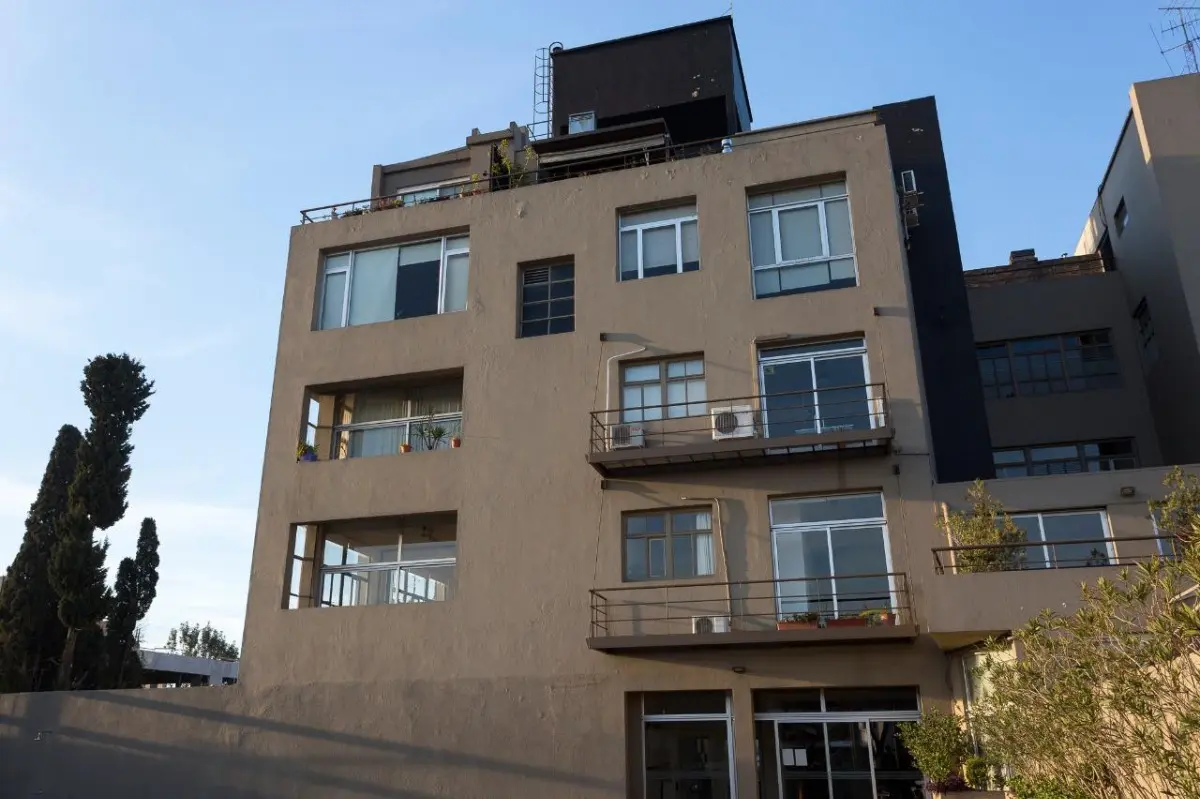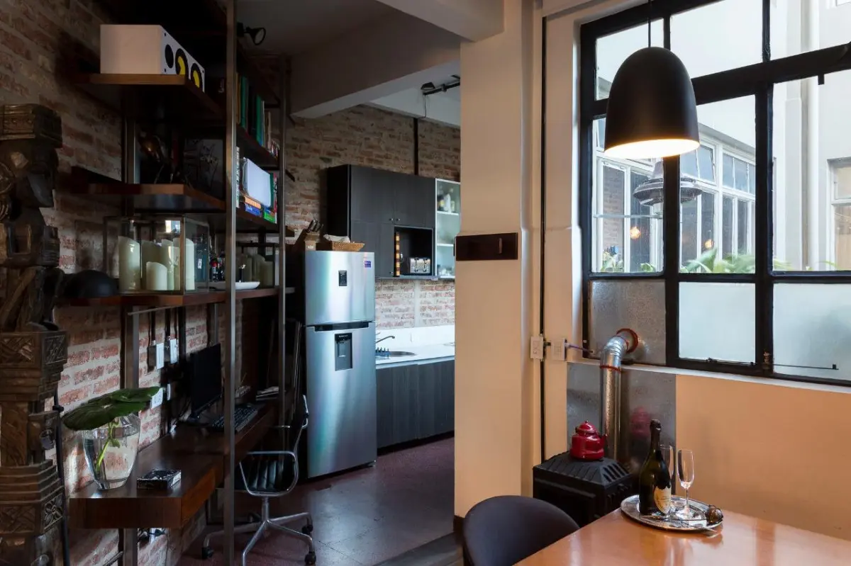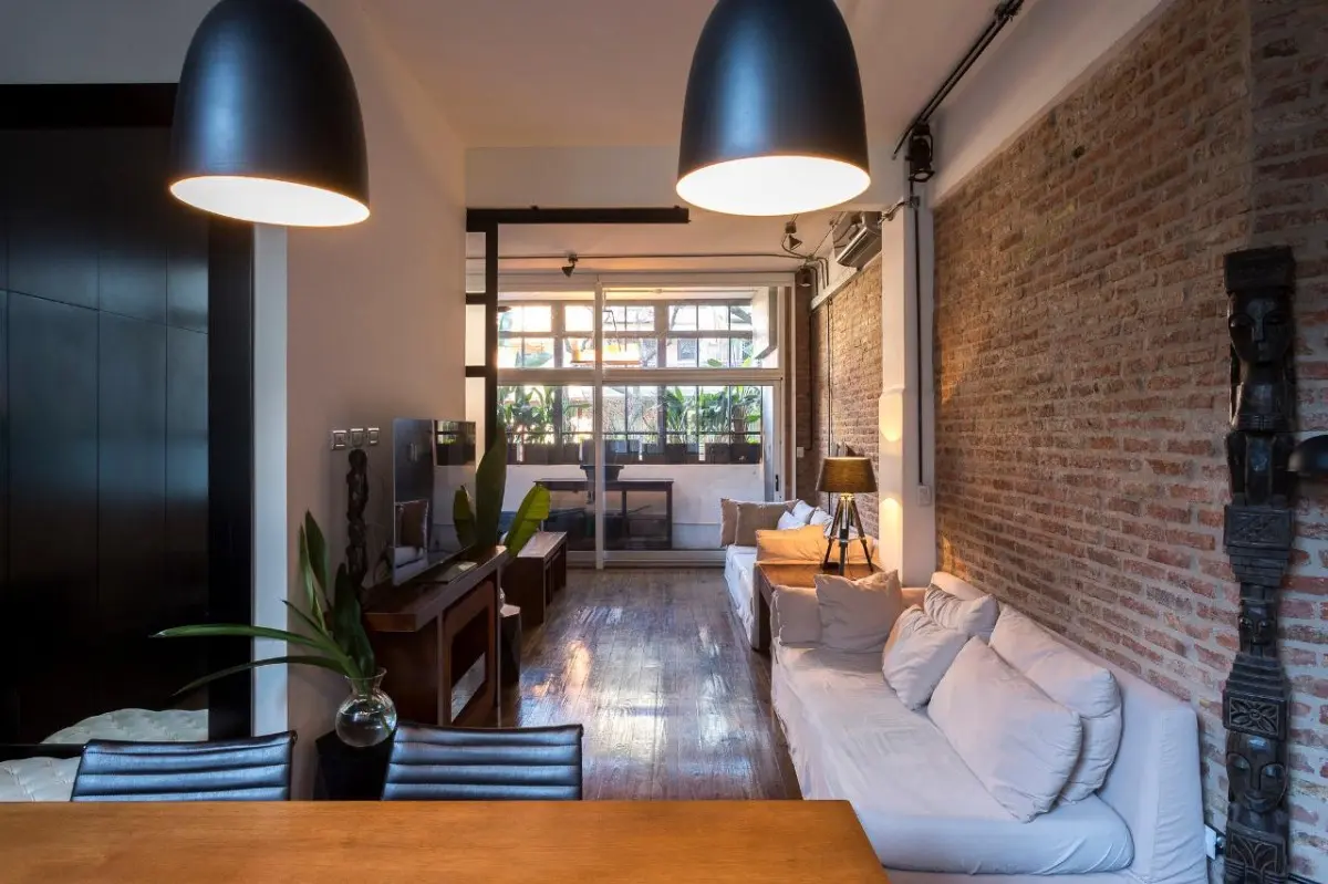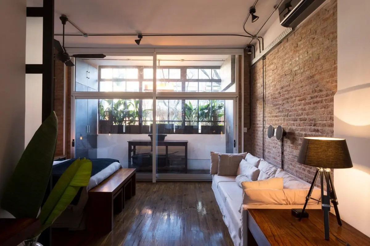 Furnished studio apartment loft of 75 m² in Colegiales, with a remodelled layout. The monthly rent includes building fees, ABL, water, WiFi internet, and electricity and gas with a consumption cap. The unit has a kitchen fully equipped with appliances, a dining area with a conference table for about 10 people, a double bed, remote-controlled blinds in the living area and bedroom, and a renovated bathroom with a Brazilian rain shower.