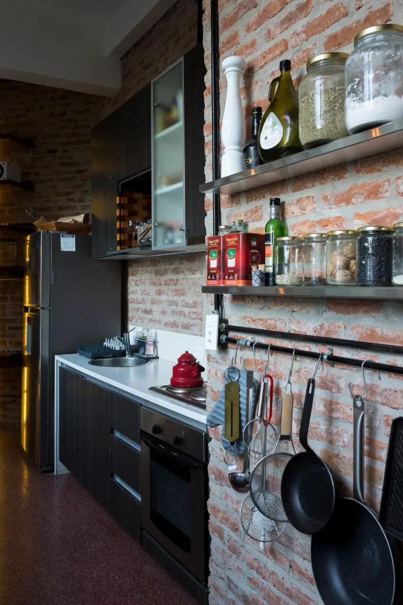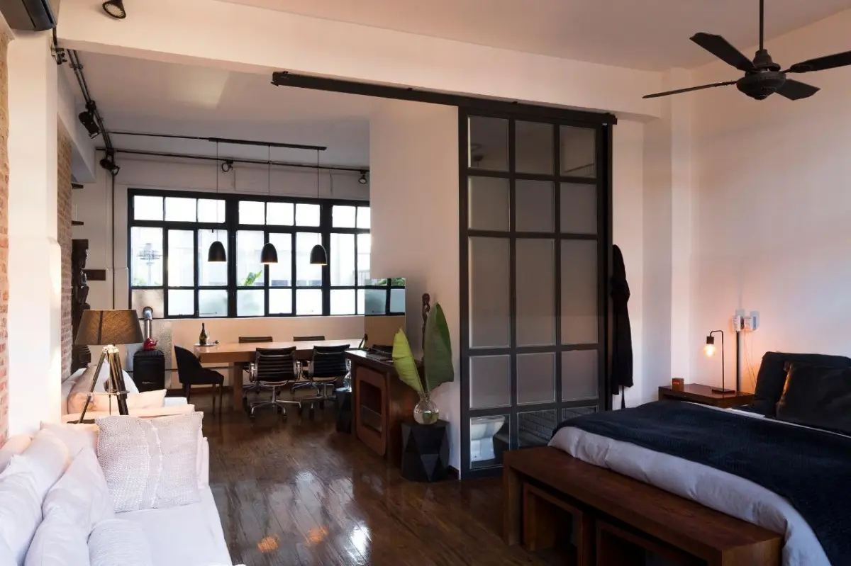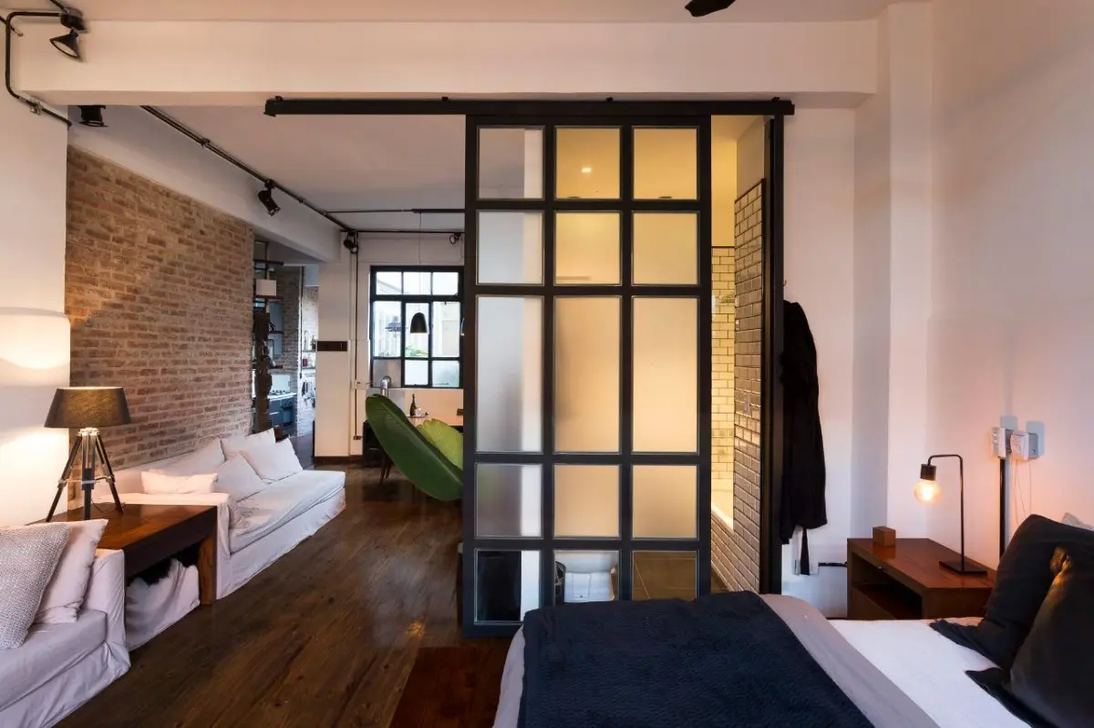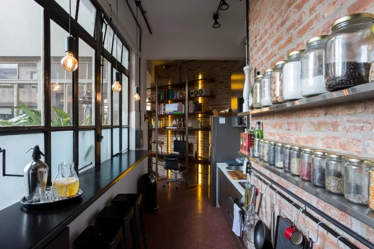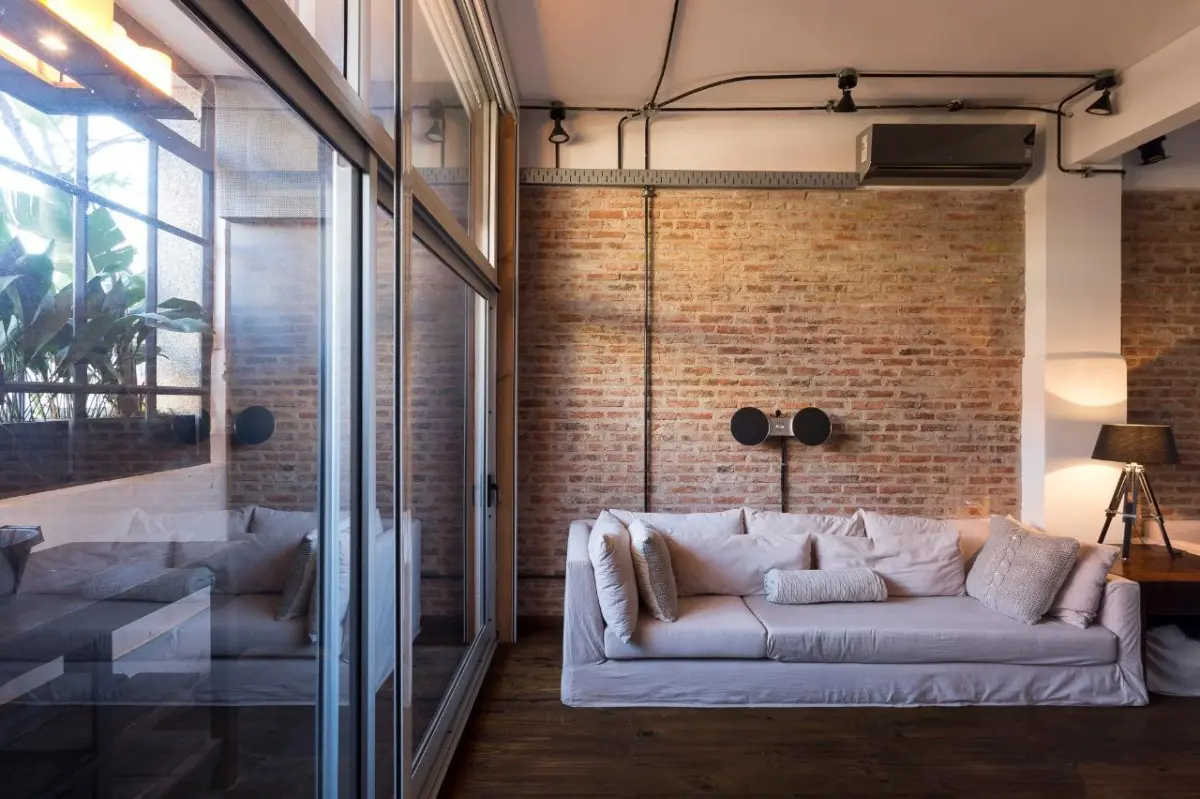 Furnished studio apartment loft of 75 m² in Colegiales, with a remodelled layout. The monthly rent includes building fees, ABL, water, WiFi internet, and electricity and gas with a consumption cap. The unit has a kitchen fully equipped with appliances, a dining area with a conference table for about 10 people, a double bed, remote-controlled blinds in the living area and bedroom, and a renovated bathroom with a Brazilian rain shower.