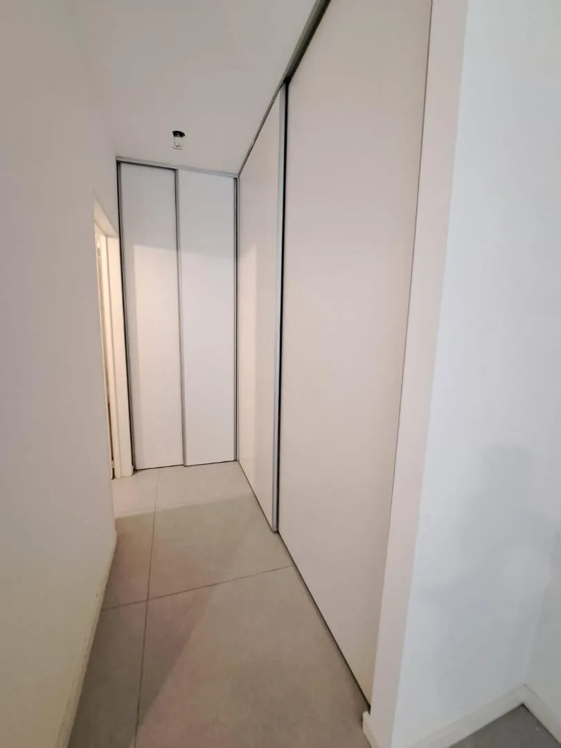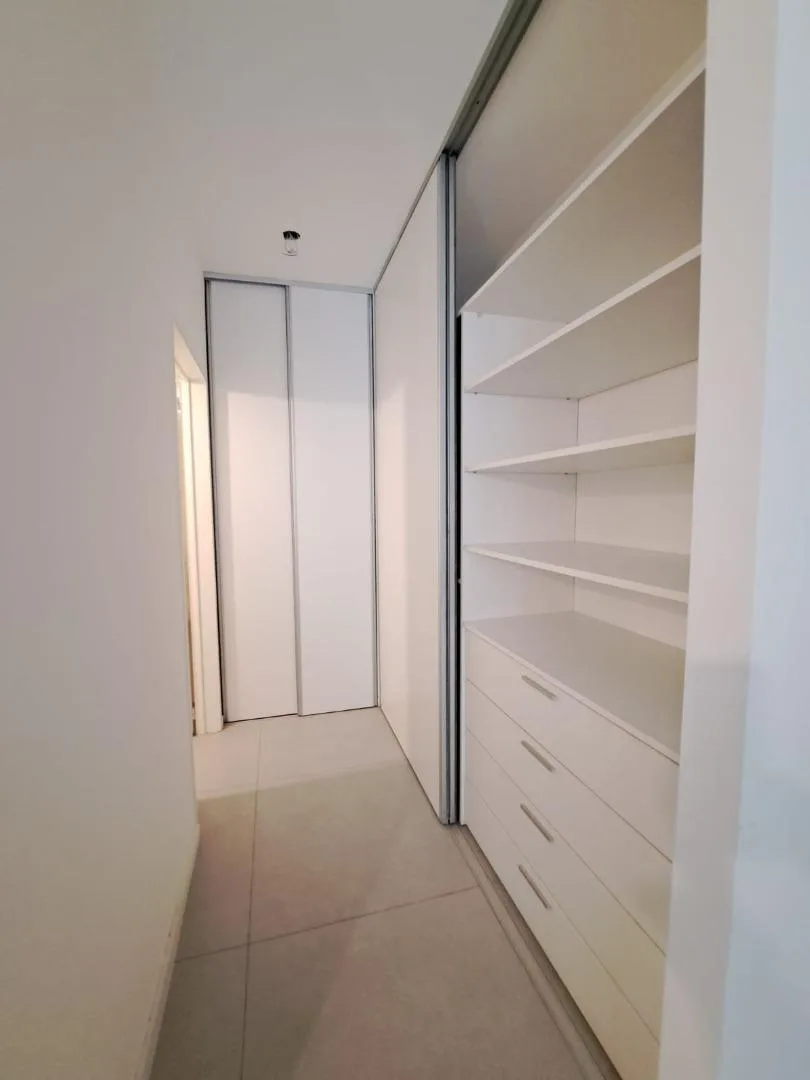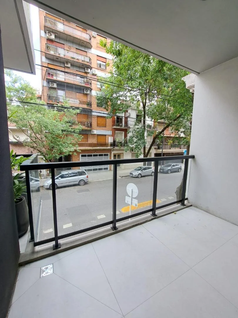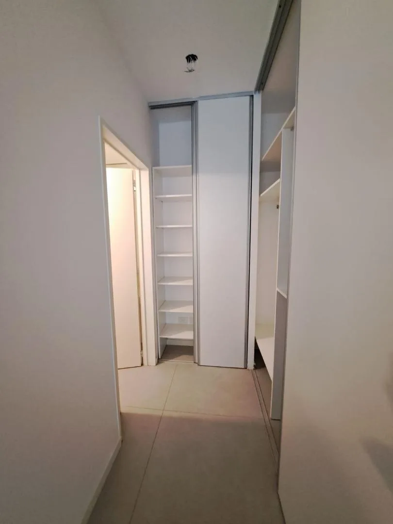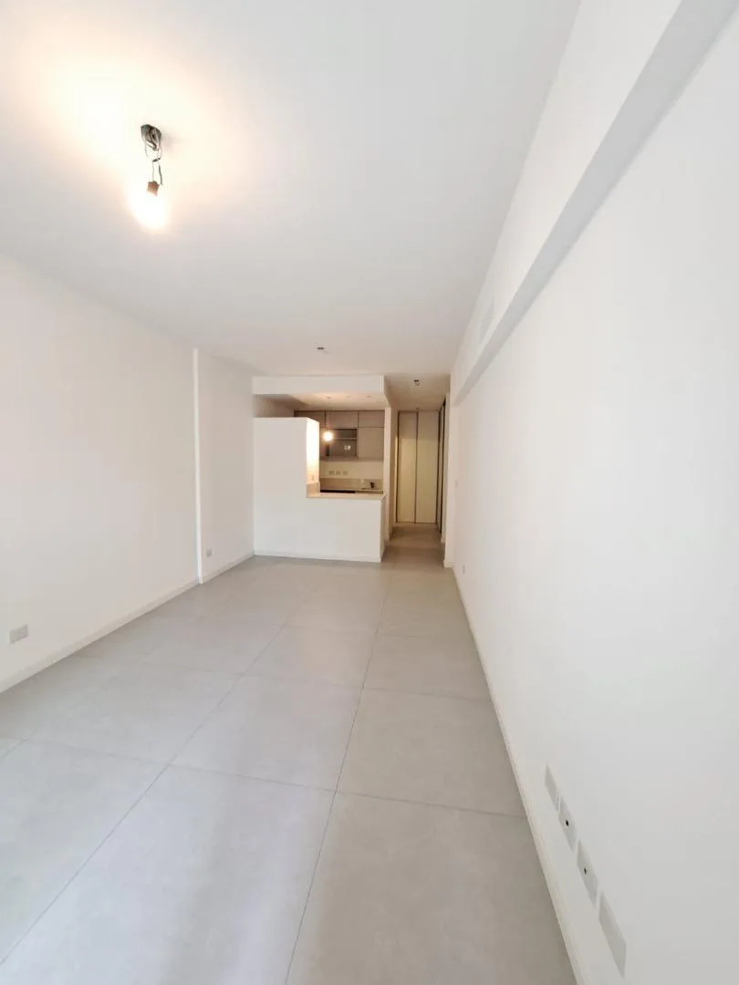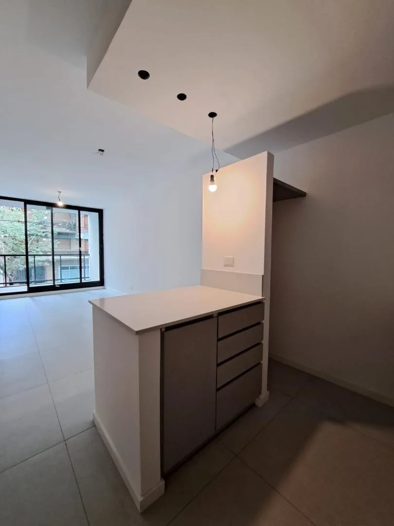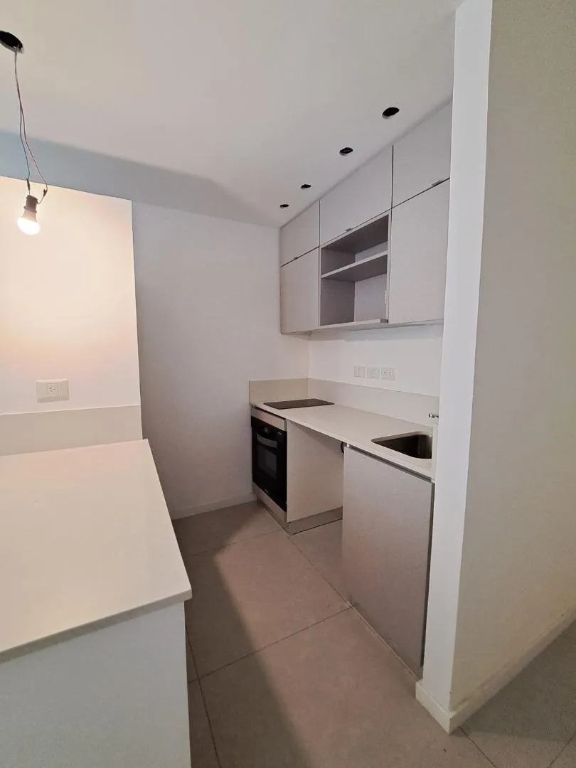Studio apartment with a divisible layout, 38 m² total area. It has a full bathroom with a fitted tap set, a semi-integrated kitchen, and an en-suite balcony with open views. The unit includes a built-in wardrobe in the hallway with shelves, drawers and a hanging space, an electric cooktop and oven, air conditioning, porcelain tile flooring, and overhead cupboards with base cabinets. The building provides a communal room (SUM), laundry and 24-hour security. The listing states it is on Teodoro Gar