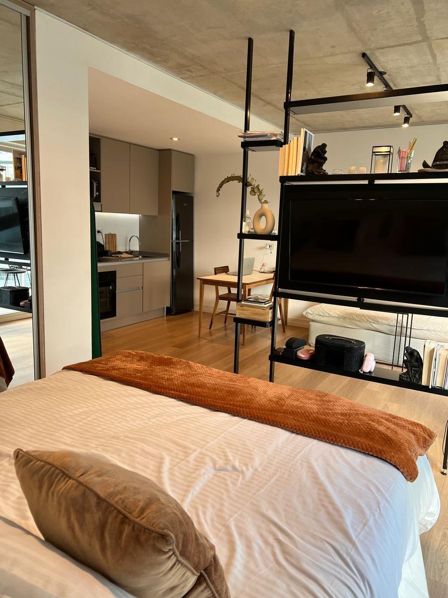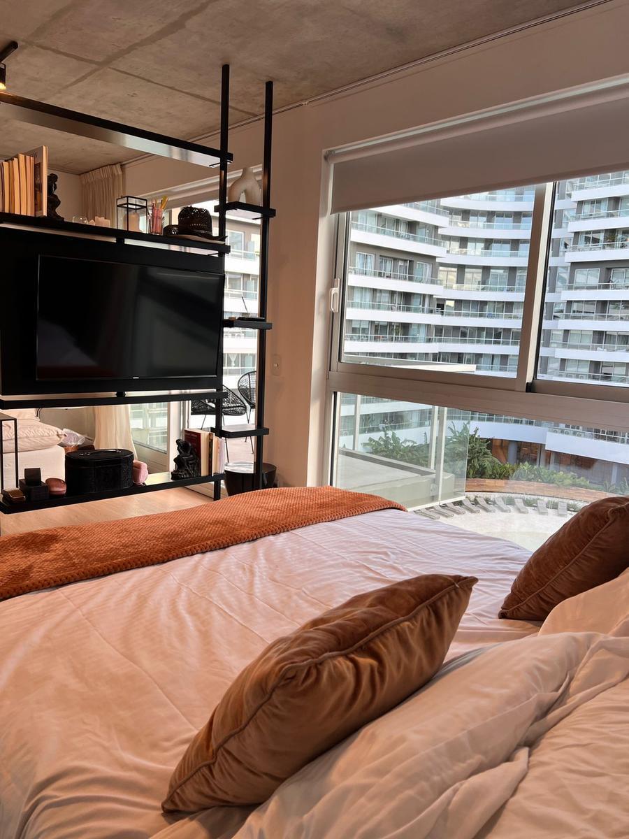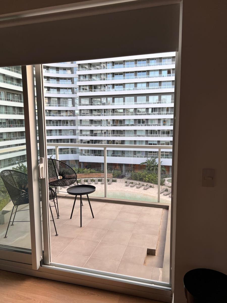Brand-new studio apartment available from 15 March 2026. Fully furnished and equipped, with a queen bed, a semi-divided living area, an integrated fully equipped kitchen, and a balcony with views of the pool. The building offers over 20 amenities, including gourmet rooms with barbecue and fireplace, a large events hall with outdoor terrace, circular meet-up areas in the central garden, a soundproof rehearsal room, a circular 30 m diameter pool with solarium, and a semi-covered expanded resto bar