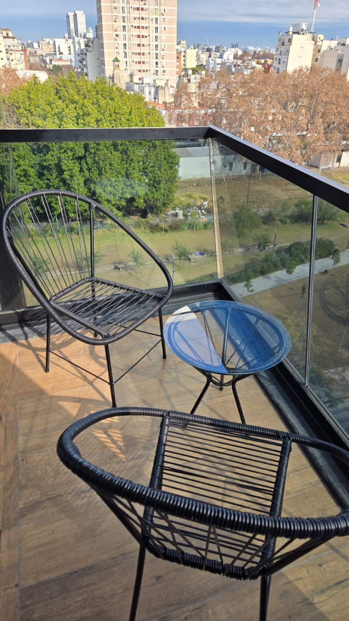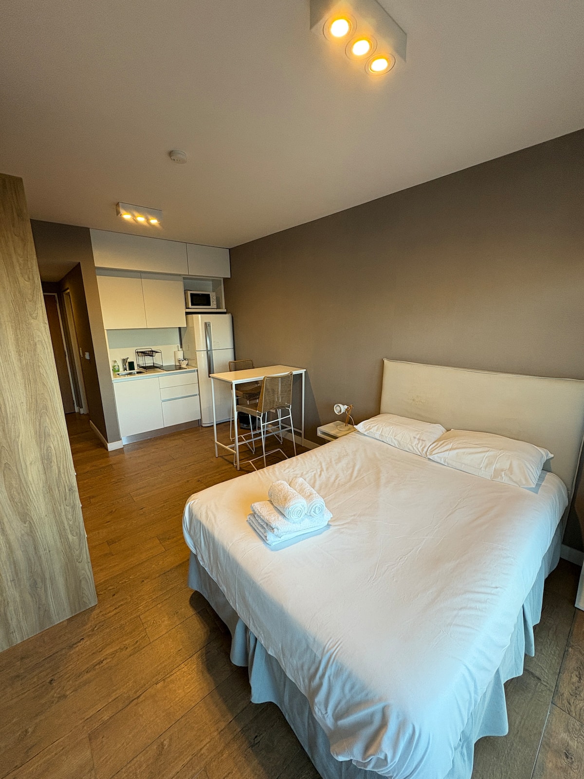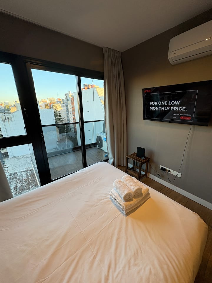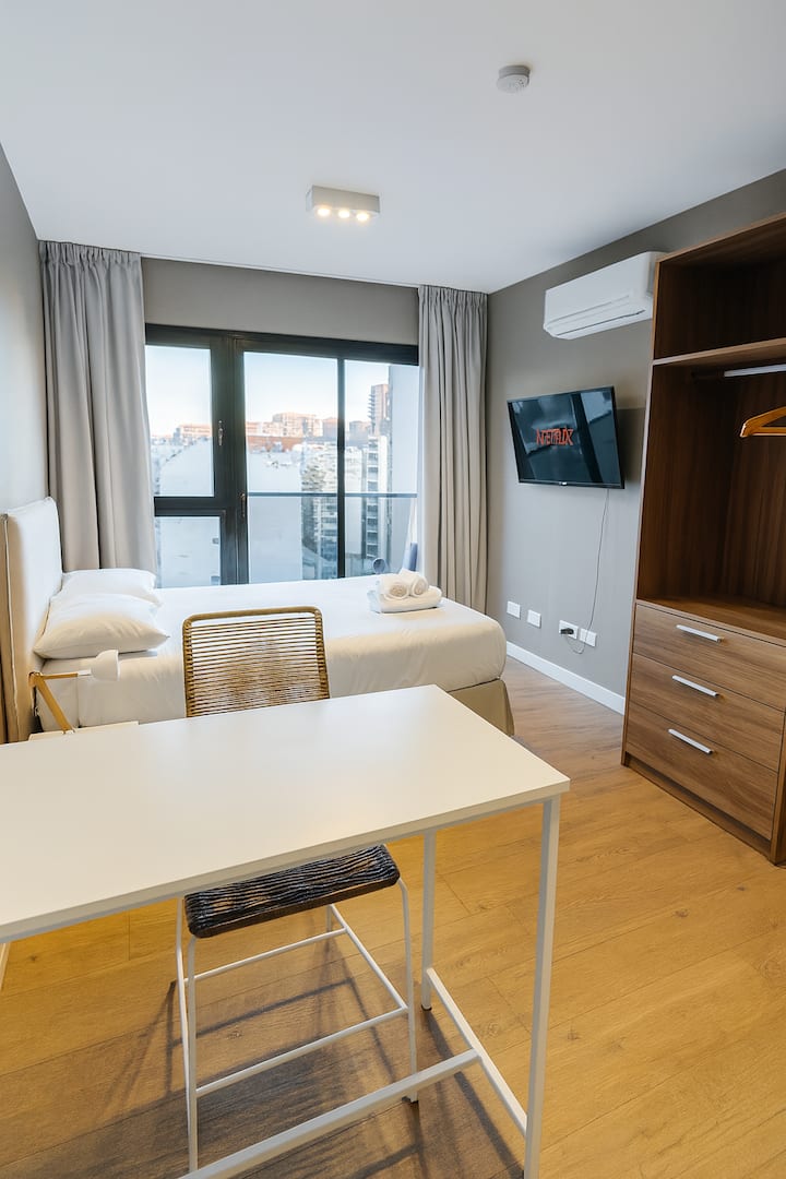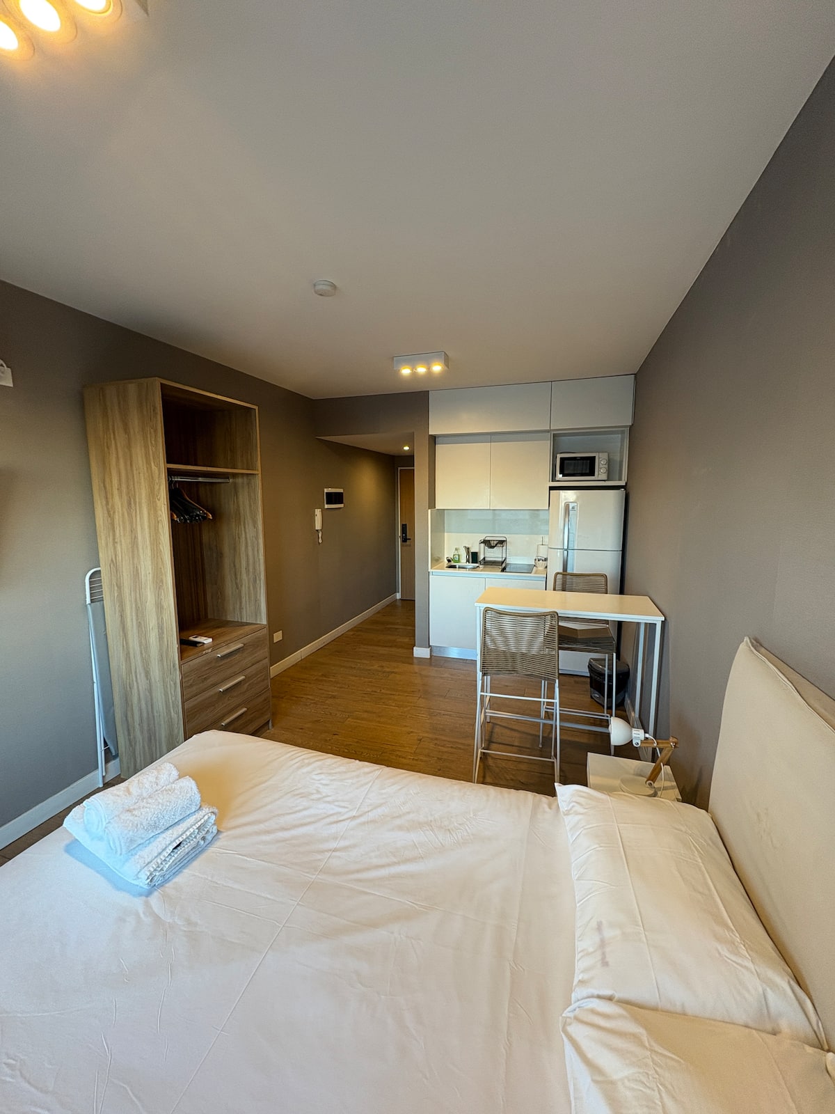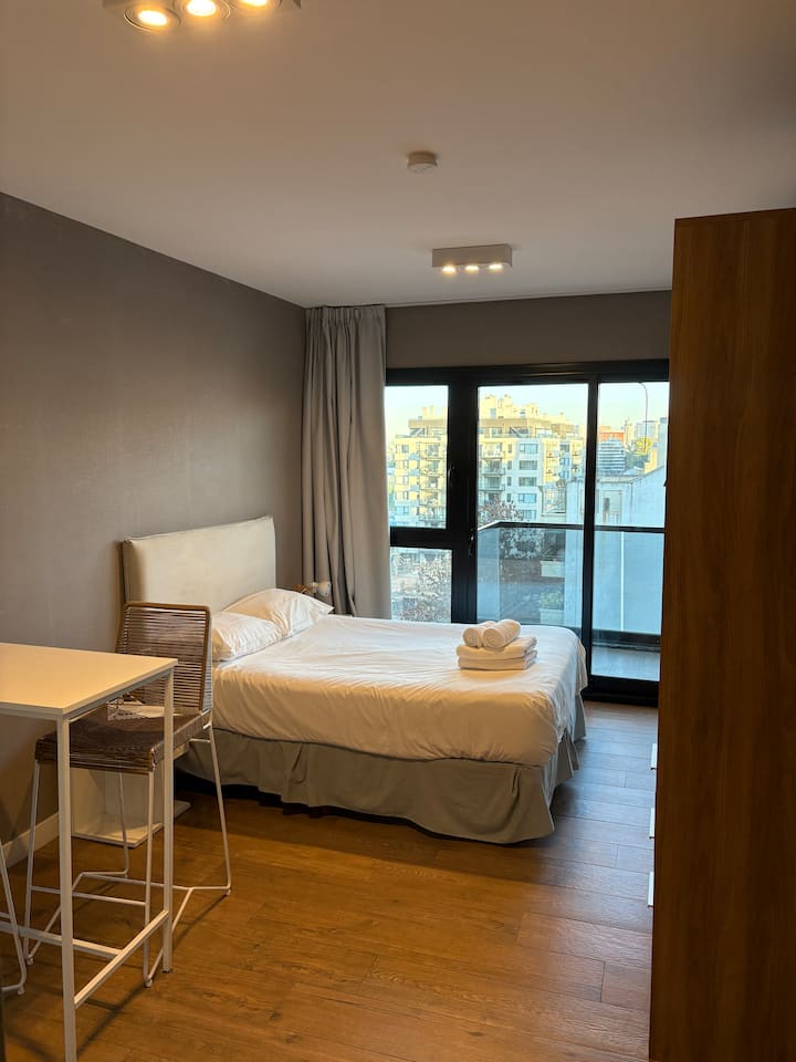 Modern minimalist studio with a queen bed and a dining/work bar for 2. It has a balcony with open views, air conditioning (hot/cold), and radiant slab heating. The kitchen is equipped with an electric anafe and Nespresso, plus full kitchenware and utensils; Wi‑Fi (300 MB) and a Smart TV are available. Building amenities include an elevator; linens and towels are provided, with digital (no-contact) access. Located 1 block from Av. Lacroze and 3 blocks from Av. Cabildo; Western Union is about 150