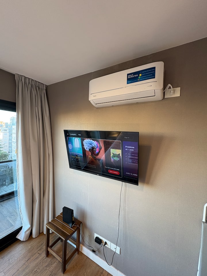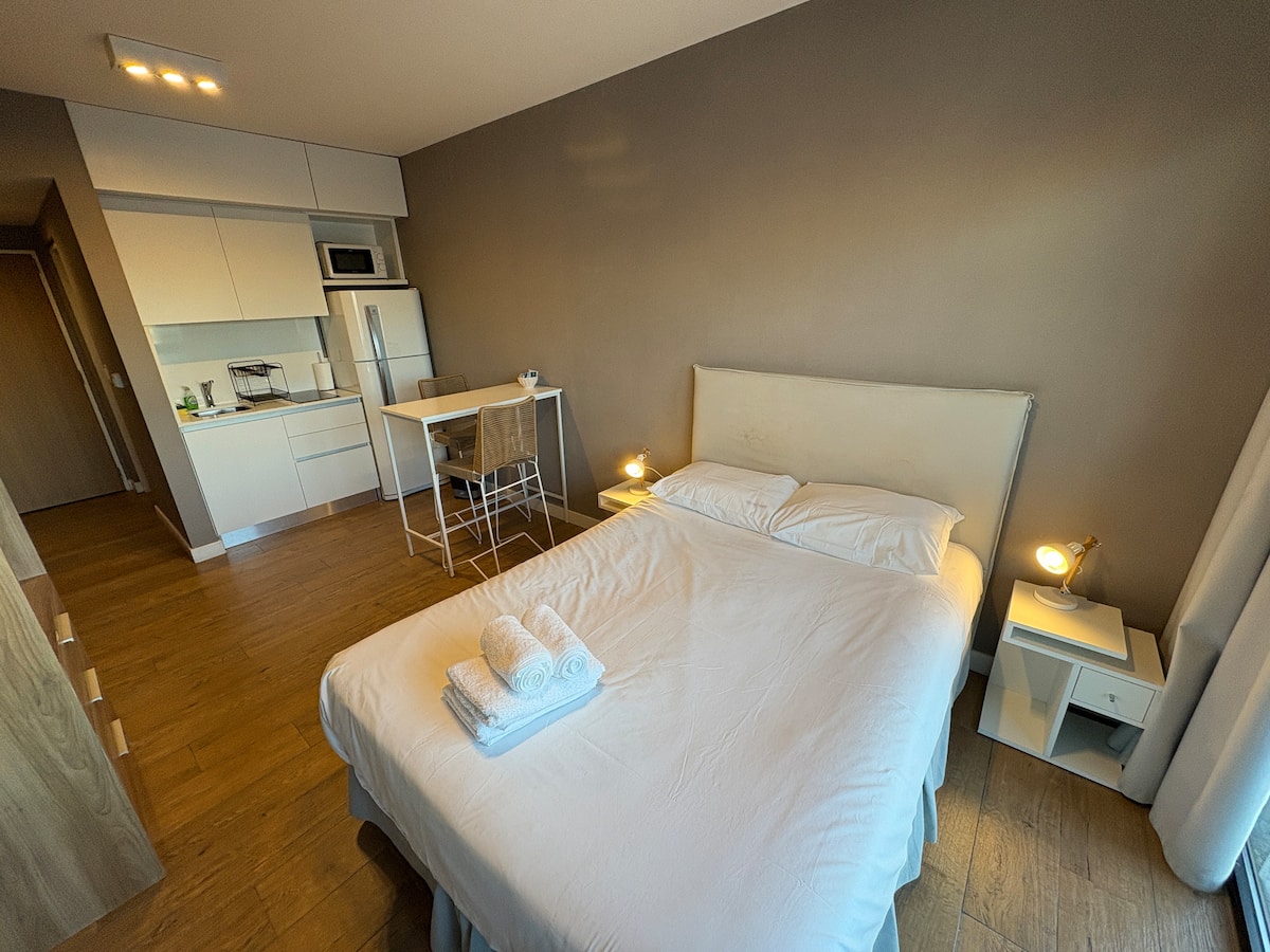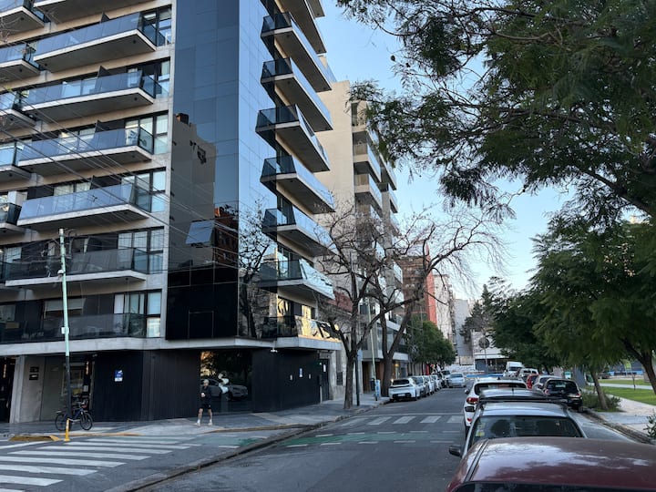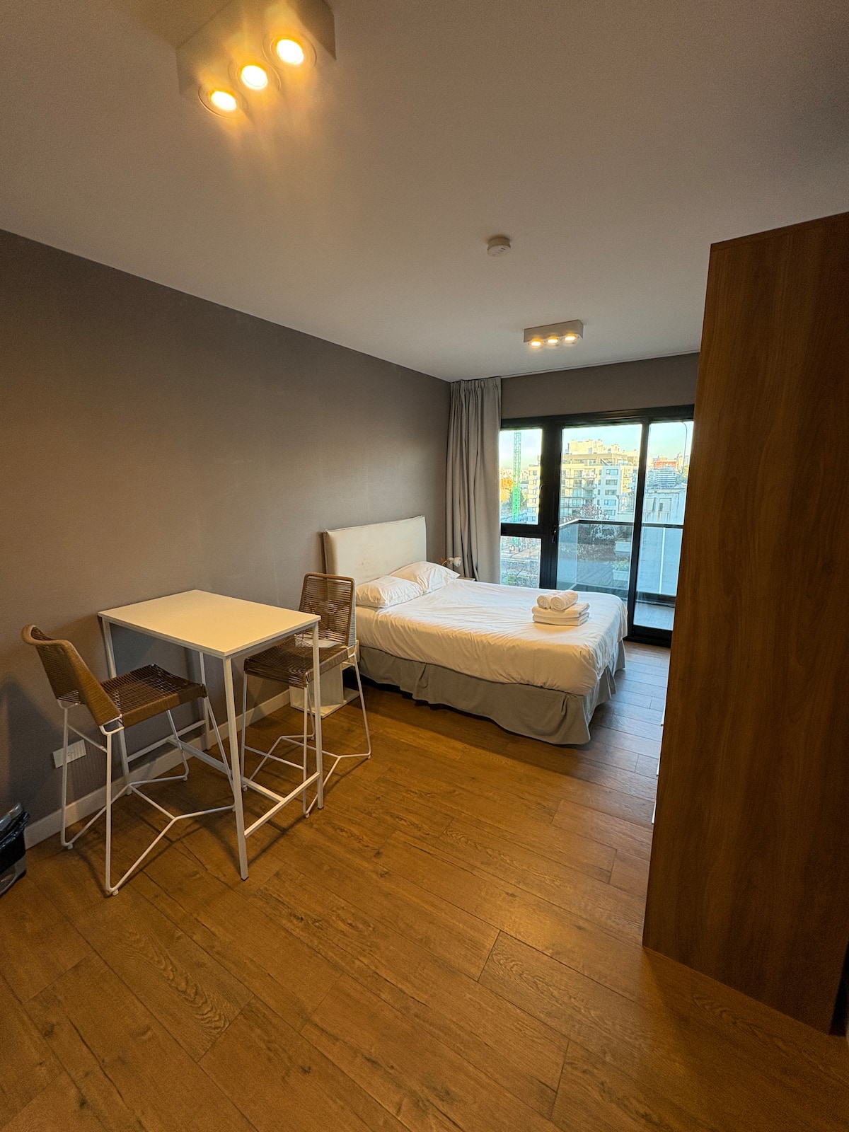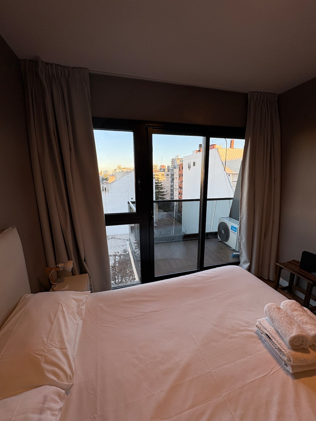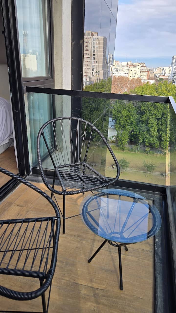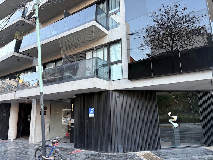 Modern minimalist studio with a queen bed and a dining/work bar for 2. It has a balcony with open views, air conditioning (hot/cold), and radiant slab heating. The kitchen is equipped with an electric anafe and Nespresso, plus full kitchenware and utensils; Wi‑Fi (300 MB) and a Smart TV are available. Building amenities include an elevator; linens and towels are provided, with digital (no-contact) access. Located 1 block from Av. Lacroze and 3 blocks from Av. Cabildo; Western Union is about 150