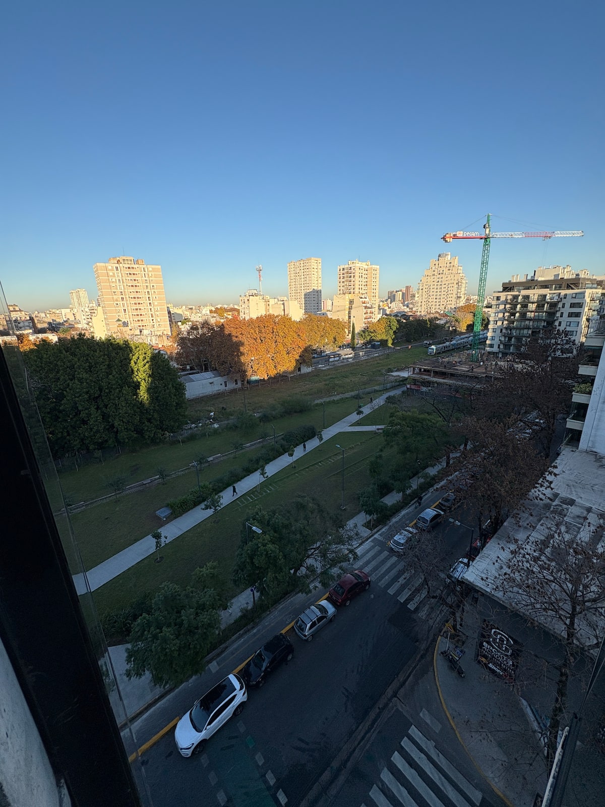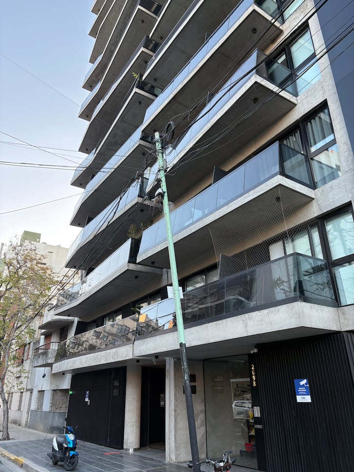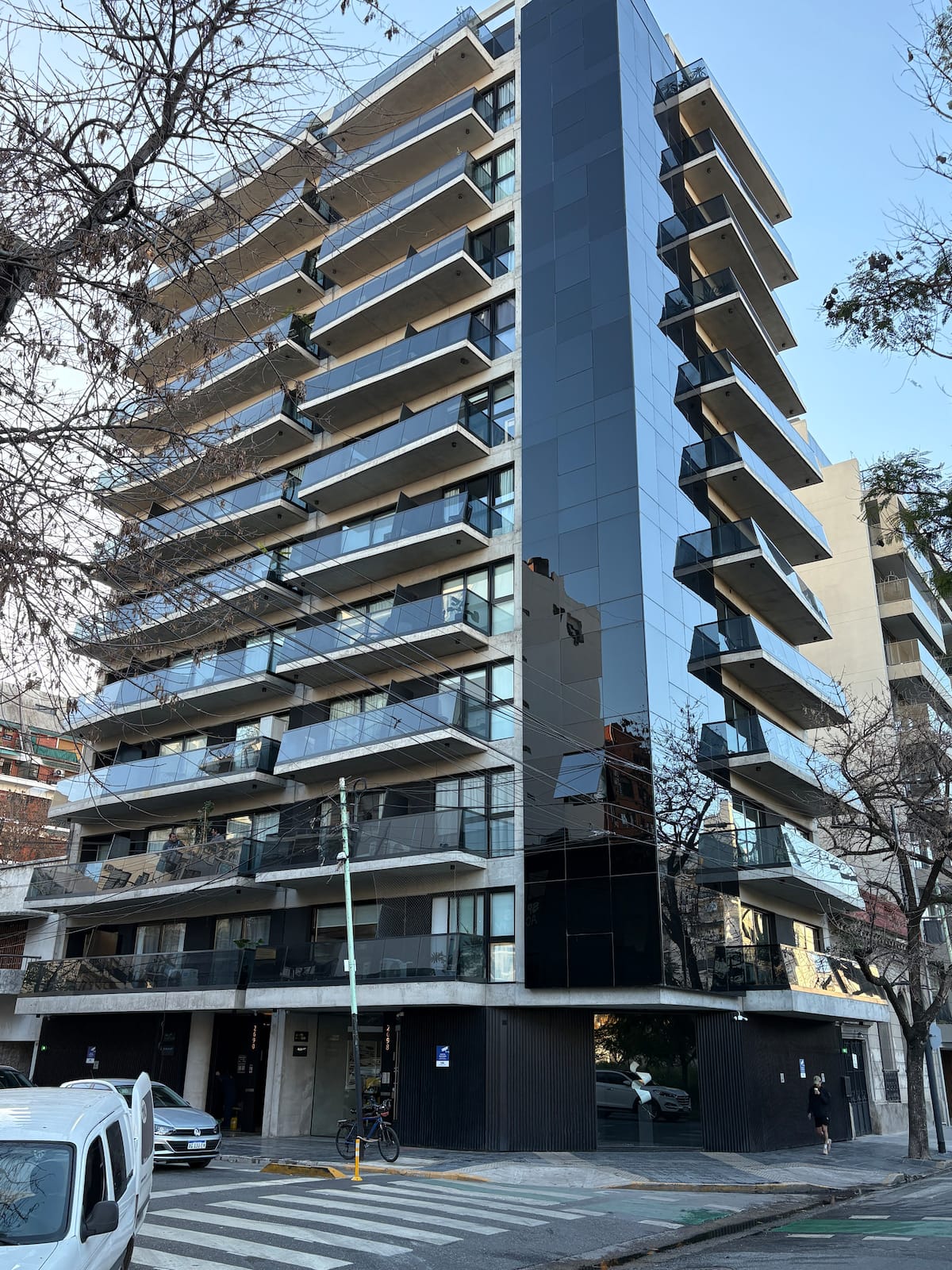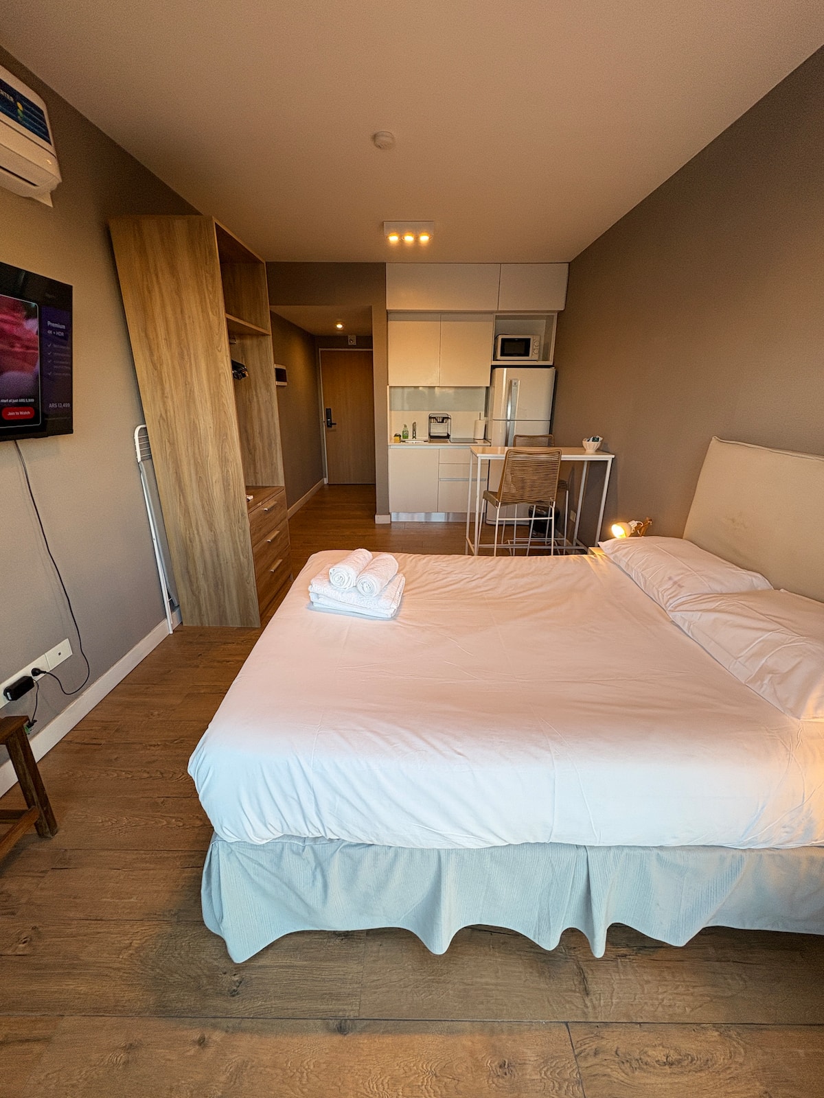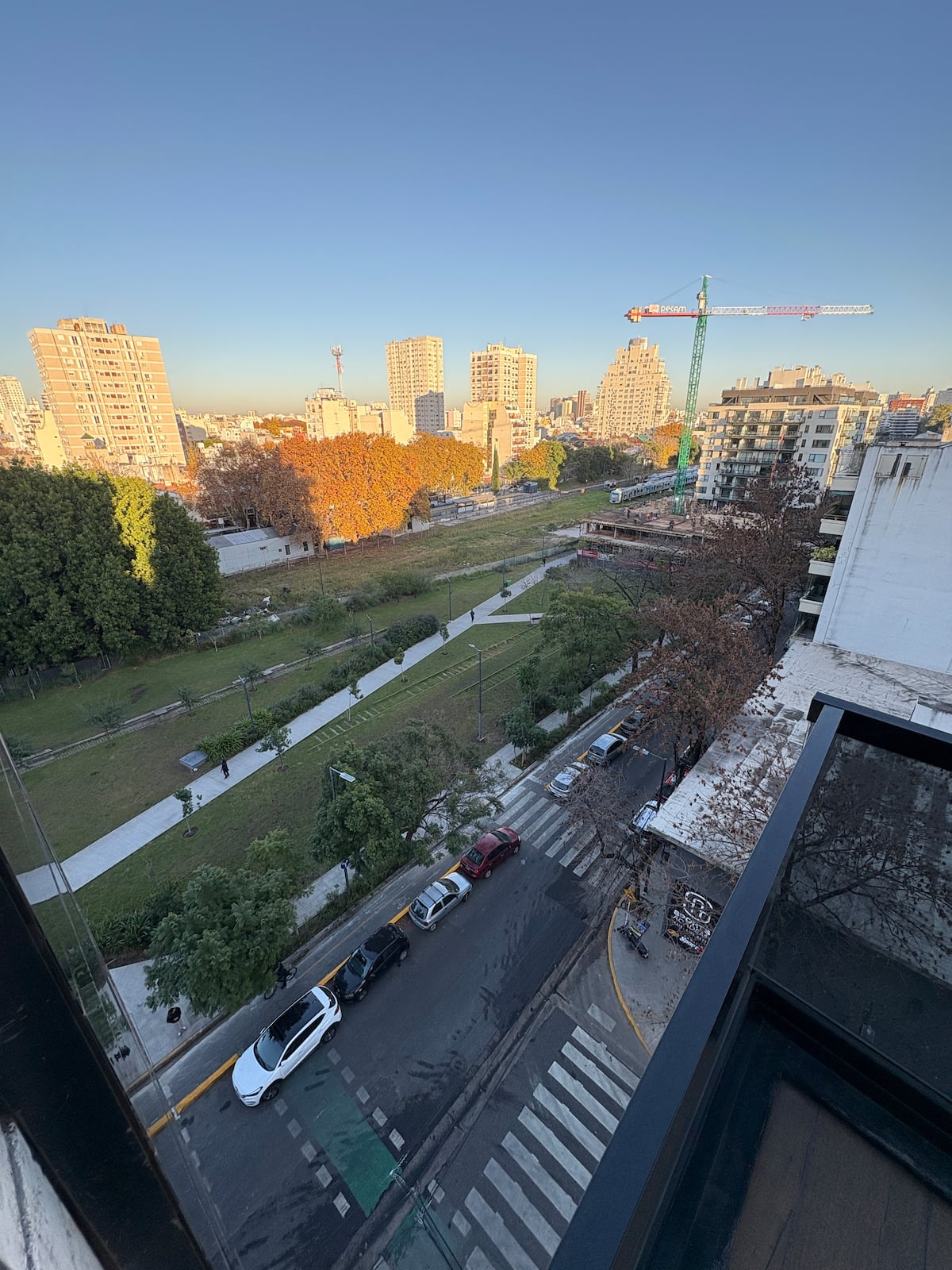 Modern minimalist studio with a queen bed and a dining/work bar for 2. It has a balcony with open views, air conditioning (hot/cold), and radiant slab heating. The kitchen is equipped with an electric anafe and Nespresso, plus full kitchenware and utensils; Wi‑Fi (300 MB) and a Smart TV are available. Building amenities include an elevator; linens and towels are provided, with digital (no-contact) access. Located 1 block from Av. Lacroze and 3 blocks from Av. Cabildo; Western Union is about 150