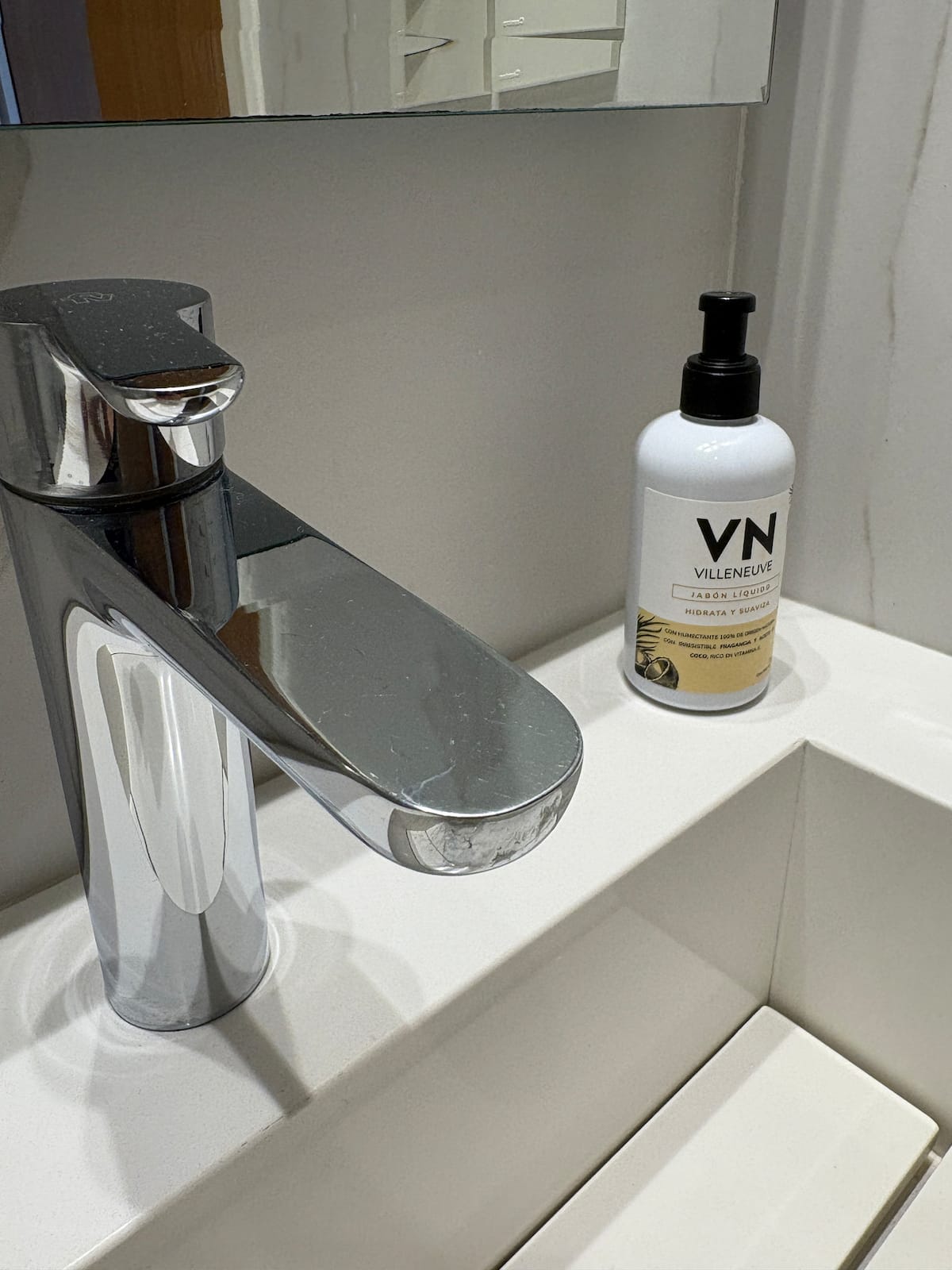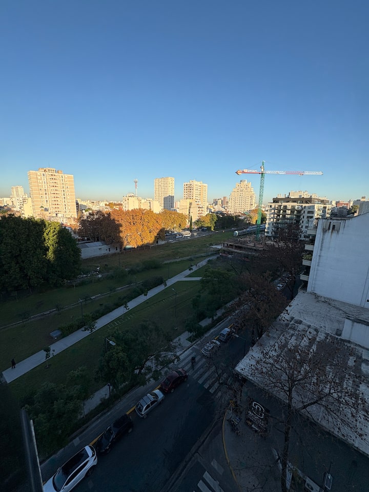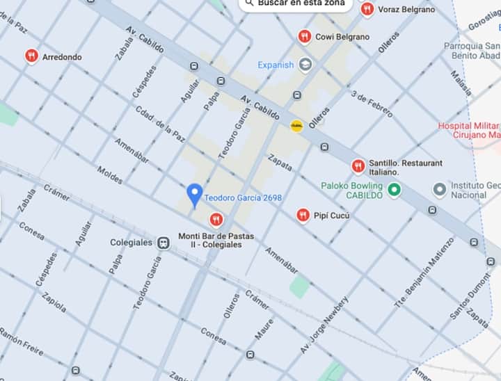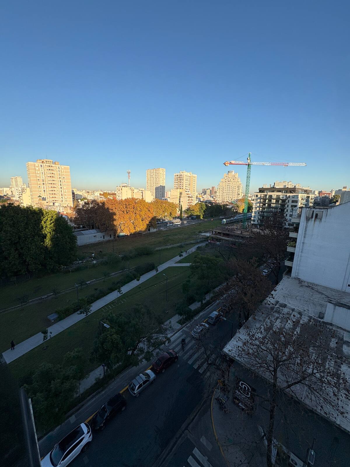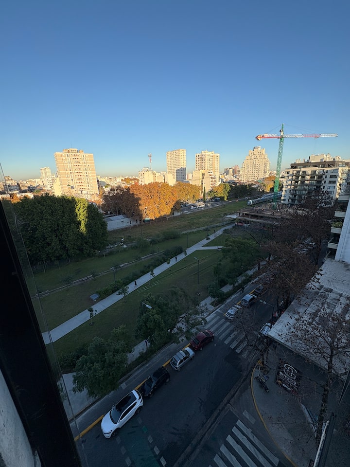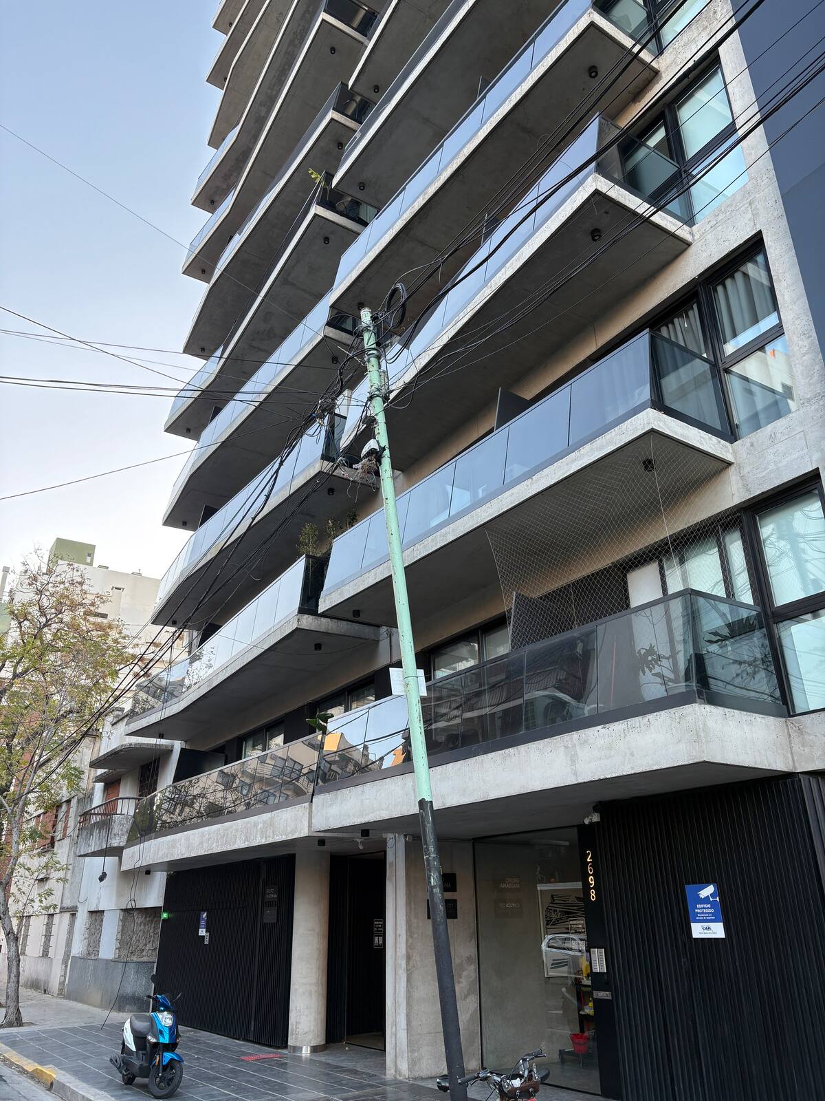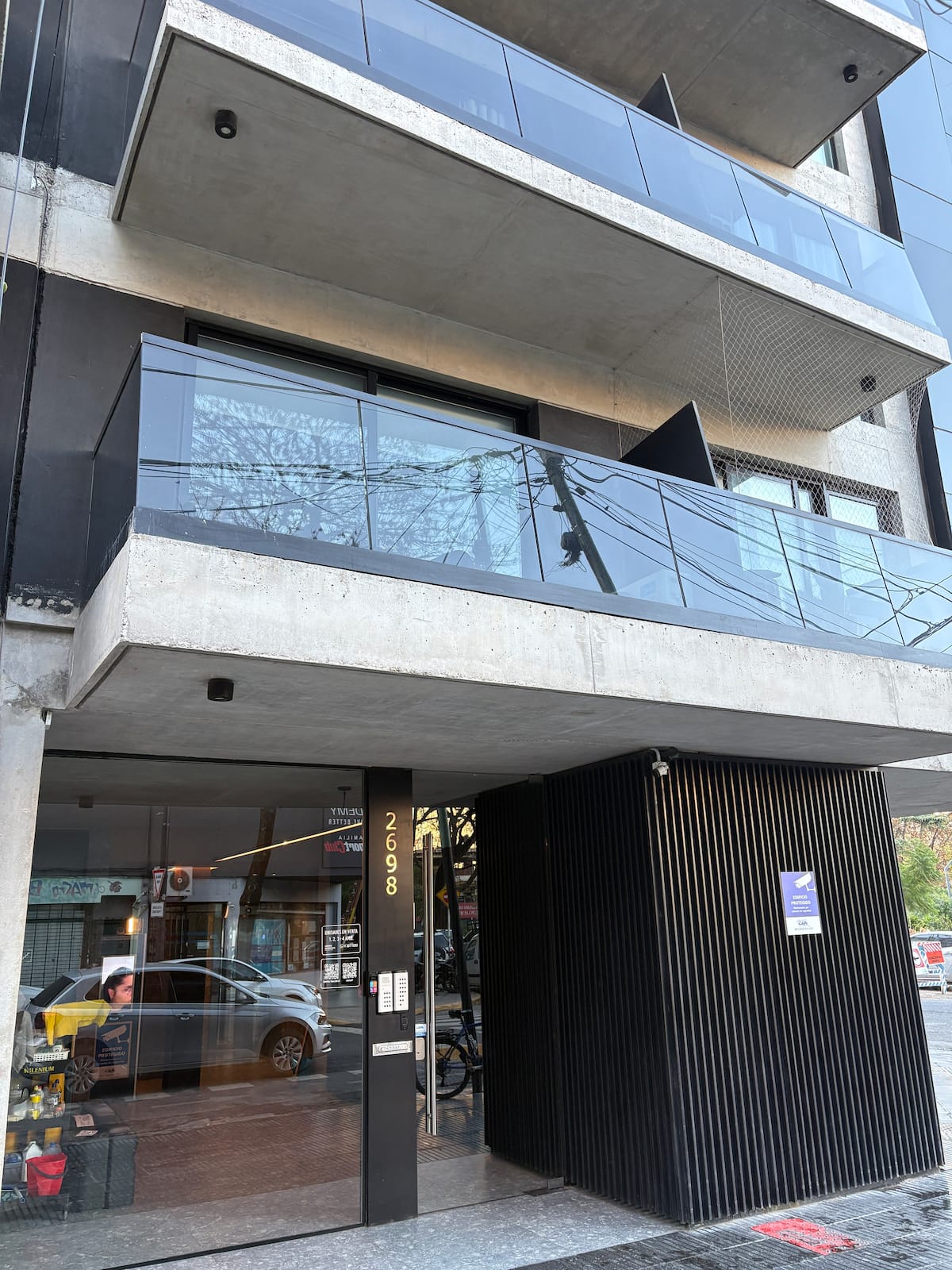 Modern minimalist studio with a queen bed and a dining/work bar for 2. It has a balcony with open views, air conditioning (hot/cold), and radiant slab heating. The kitchen is equipped with an electric anafe and Nespresso, plus full kitchenware and utensils; Wi‑Fi (300 MB) and a Smart TV are available. Building amenities include an elevator; linens and towels are provided, with digital (no-contact) access. Located 1 block from Av. Lacroze and 3 blocks from Av. Cabildo; Western Union is about 150