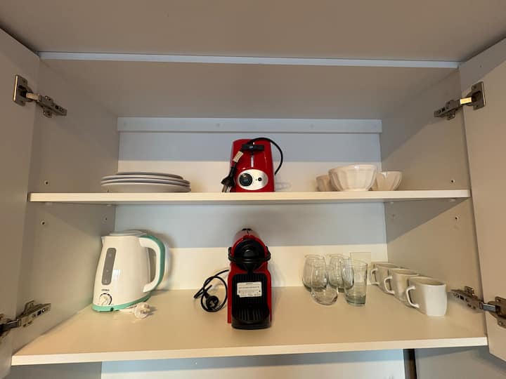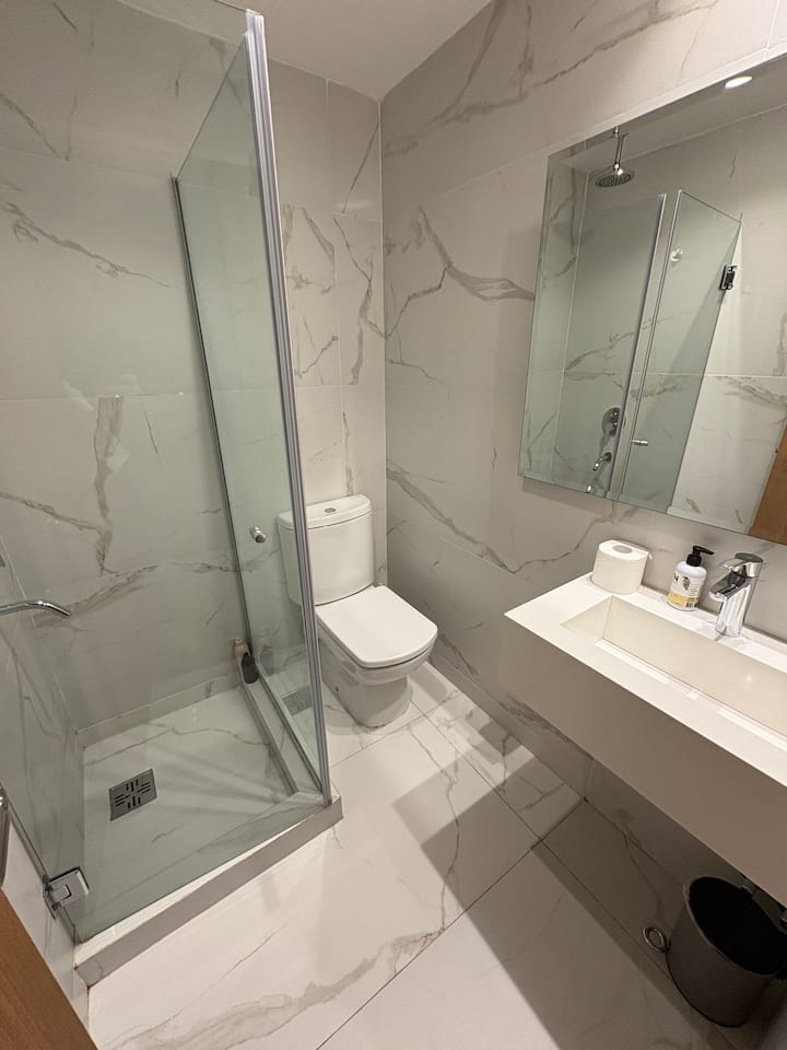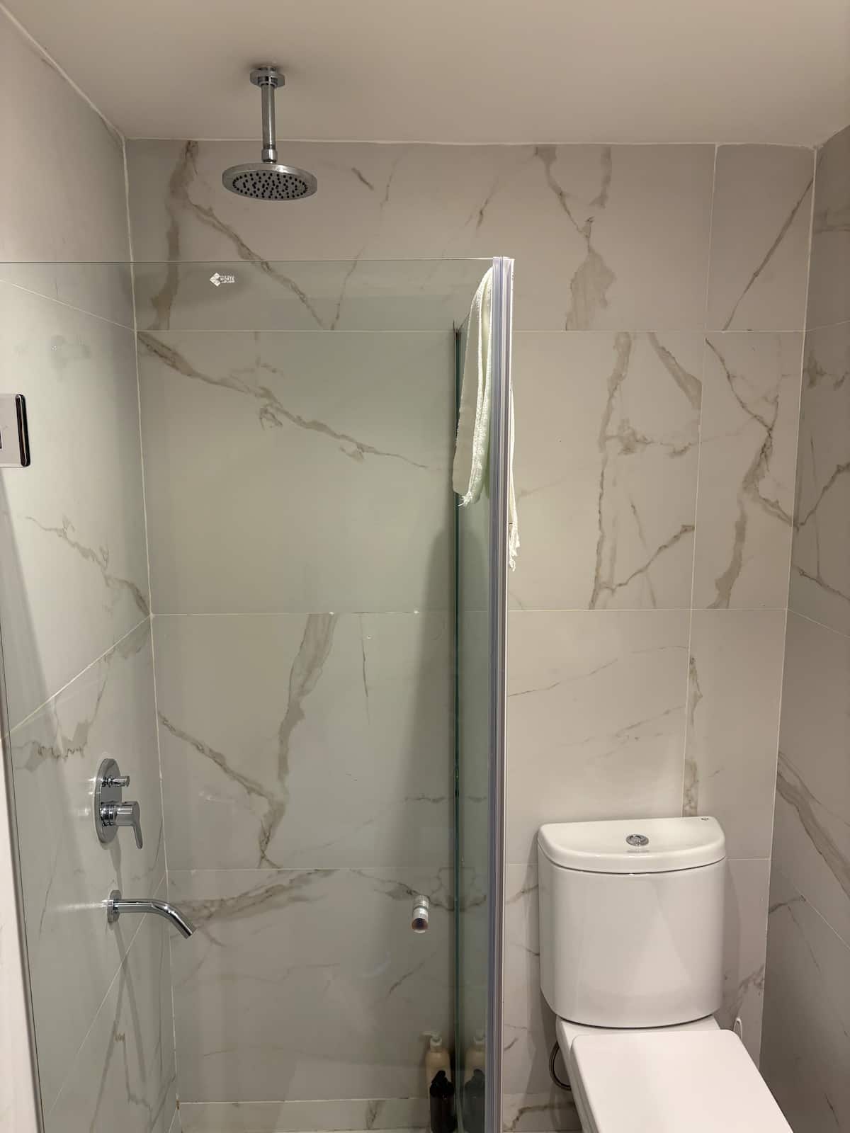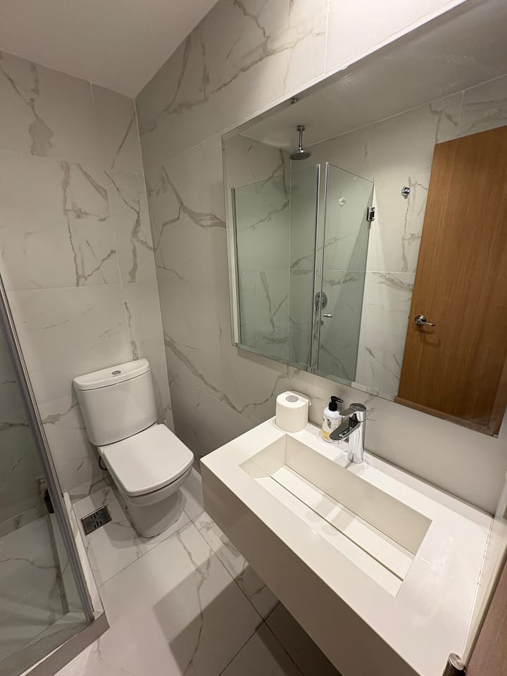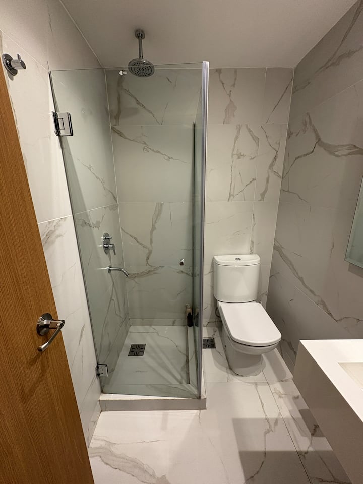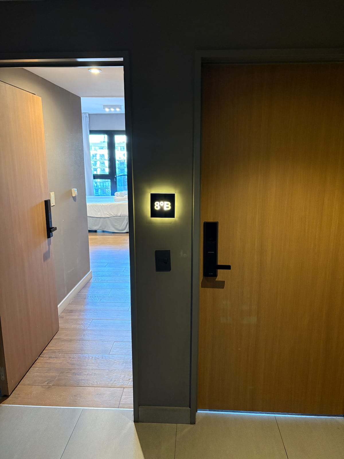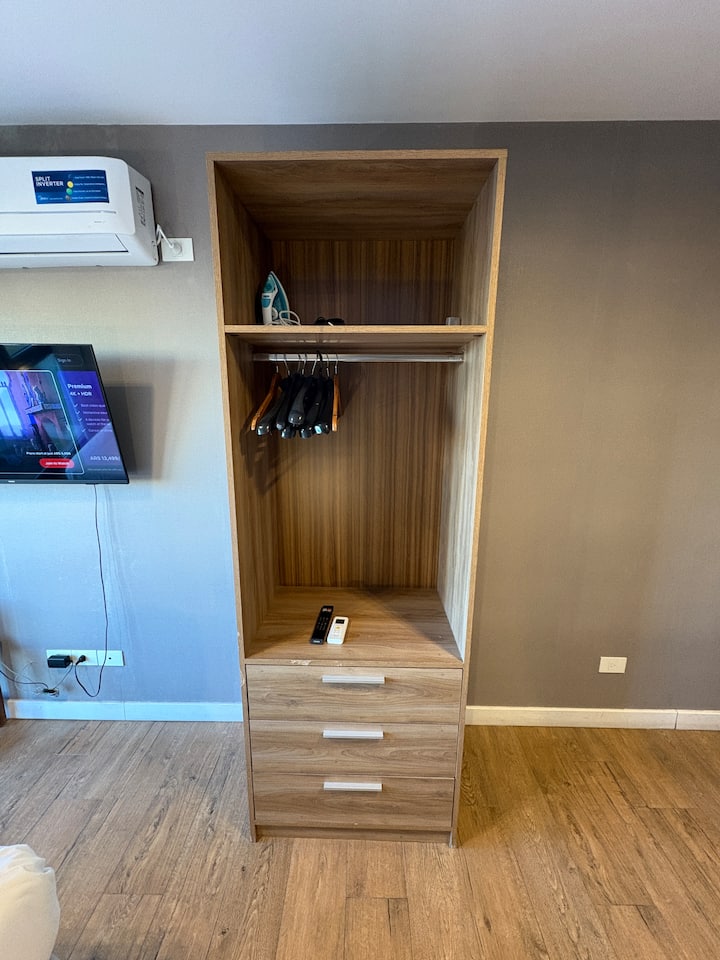 Modern minimalist studio with a queen bed and a dining/work bar for 2. It has a balcony with open views, air conditioning (hot/cold), and radiant slab heating. The kitchen is equipped with an electric anafe and Nespresso, plus full kitchenware and utensils; Wi‑Fi (300 MB) and a Smart TV are available. Building amenities include an elevator; linens and towels are provided, with digital (no-contact) access. Located 1 block from Av. Lacroze and 3 blocks from Av. Cabildo; Western Union is about 150