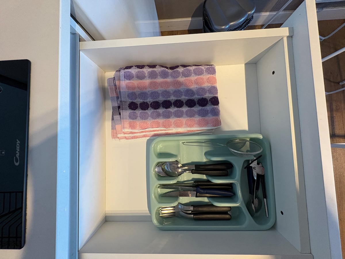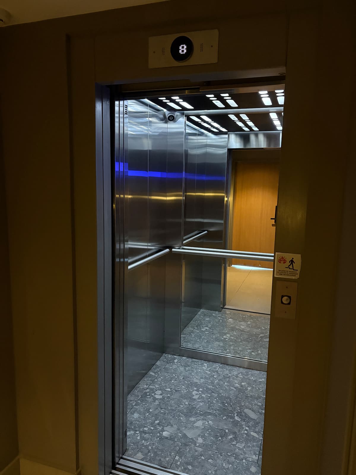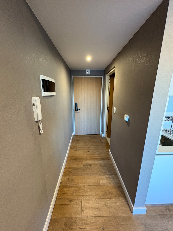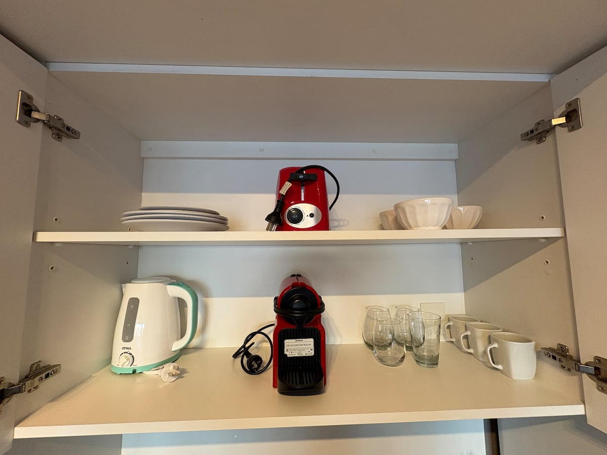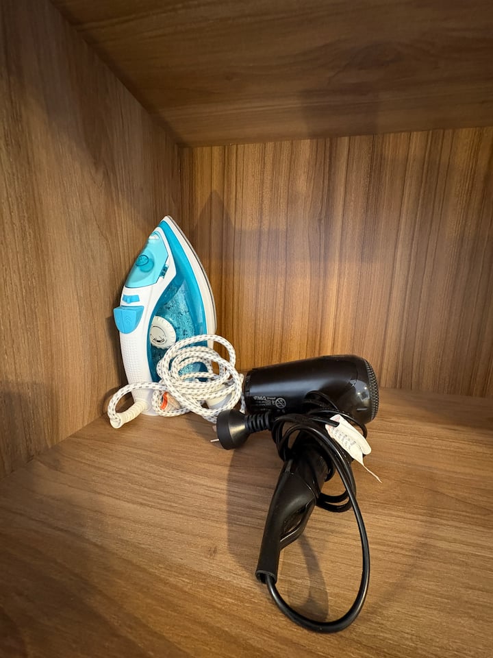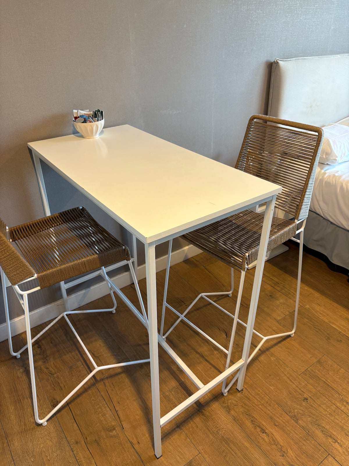 Modern minimalist studio with a queen bed and a dining/work bar for 2. It has a balcony with open views, air conditioning (hot/cold), and radiant slab heating. The kitchen is equipped with an electric anafe and Nespresso, plus full kitchenware and utensils; Wi‑Fi (300 MB) and a Smart TV are available. Building amenities include an elevator; linens and towels are provided, with digital (no-contact) access. Located 1 block from Av. Lacroze and 3 blocks from Av. Cabildo; Western Union is about 150
