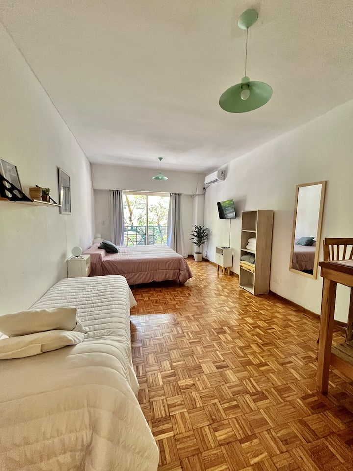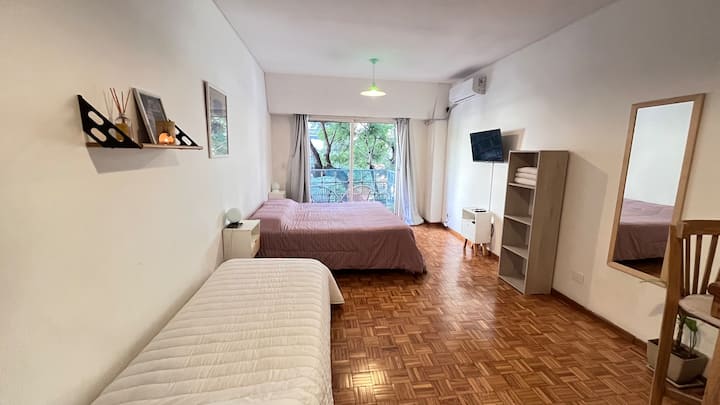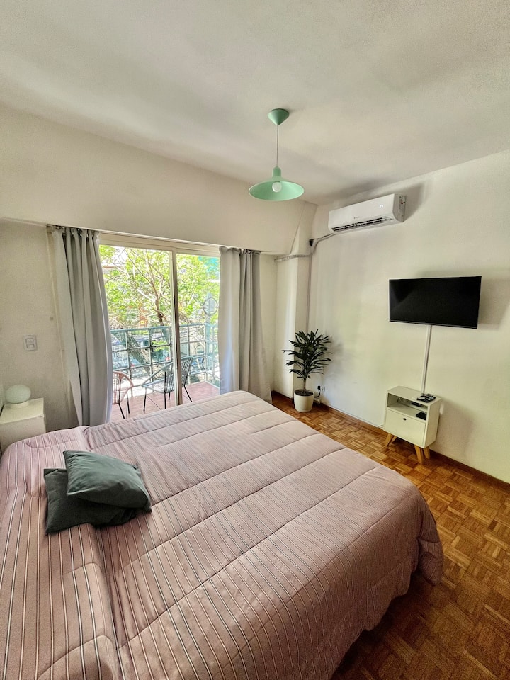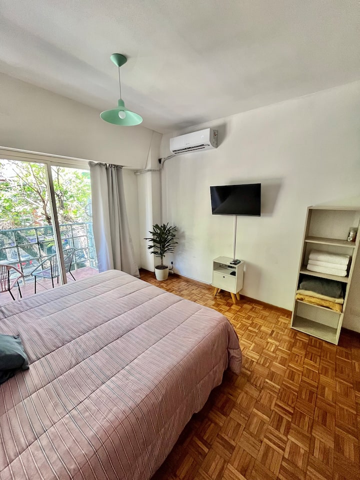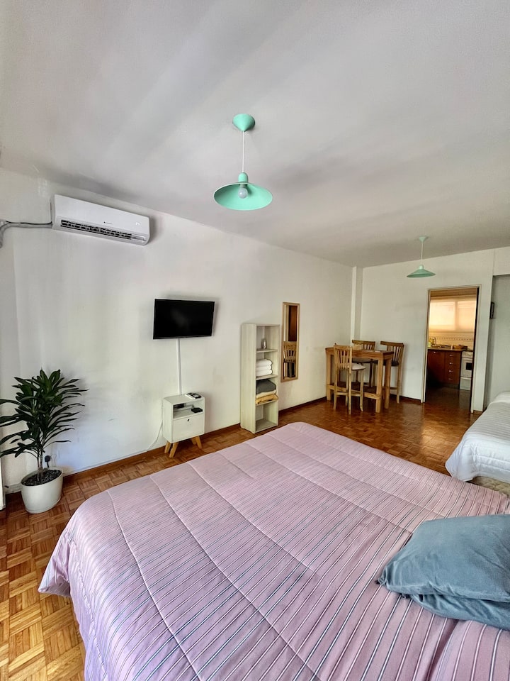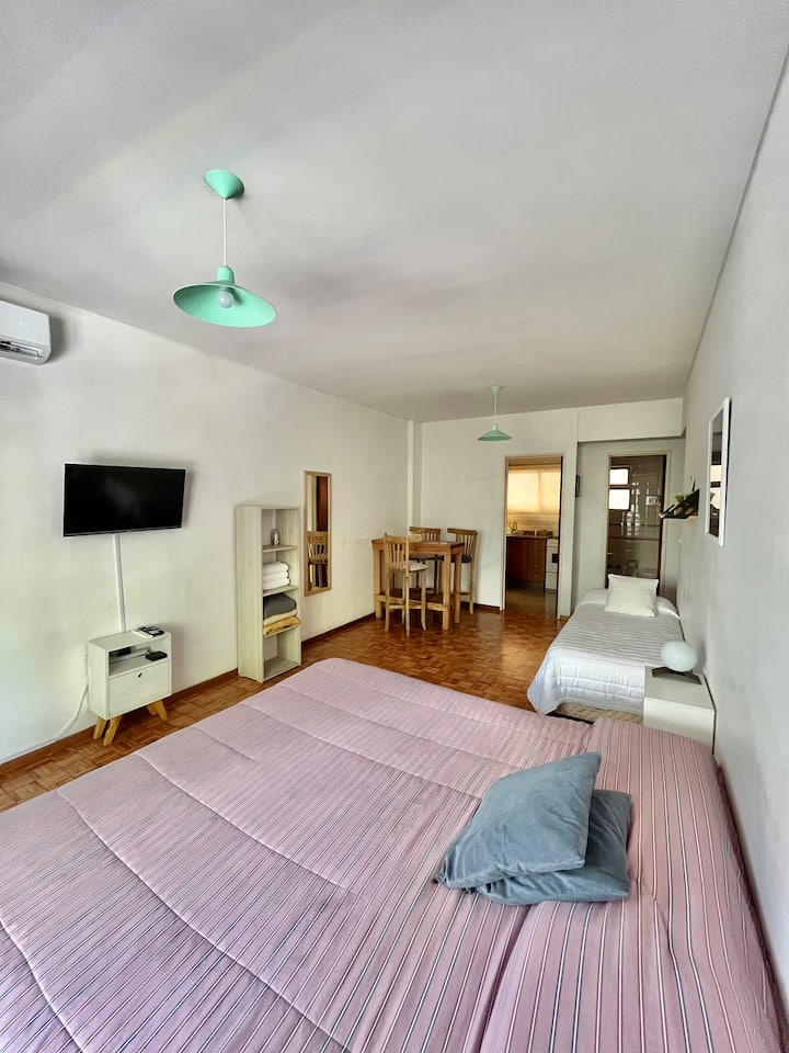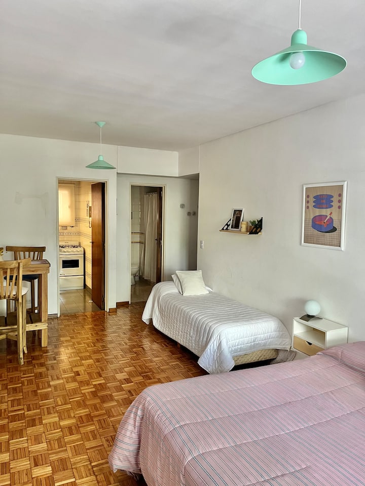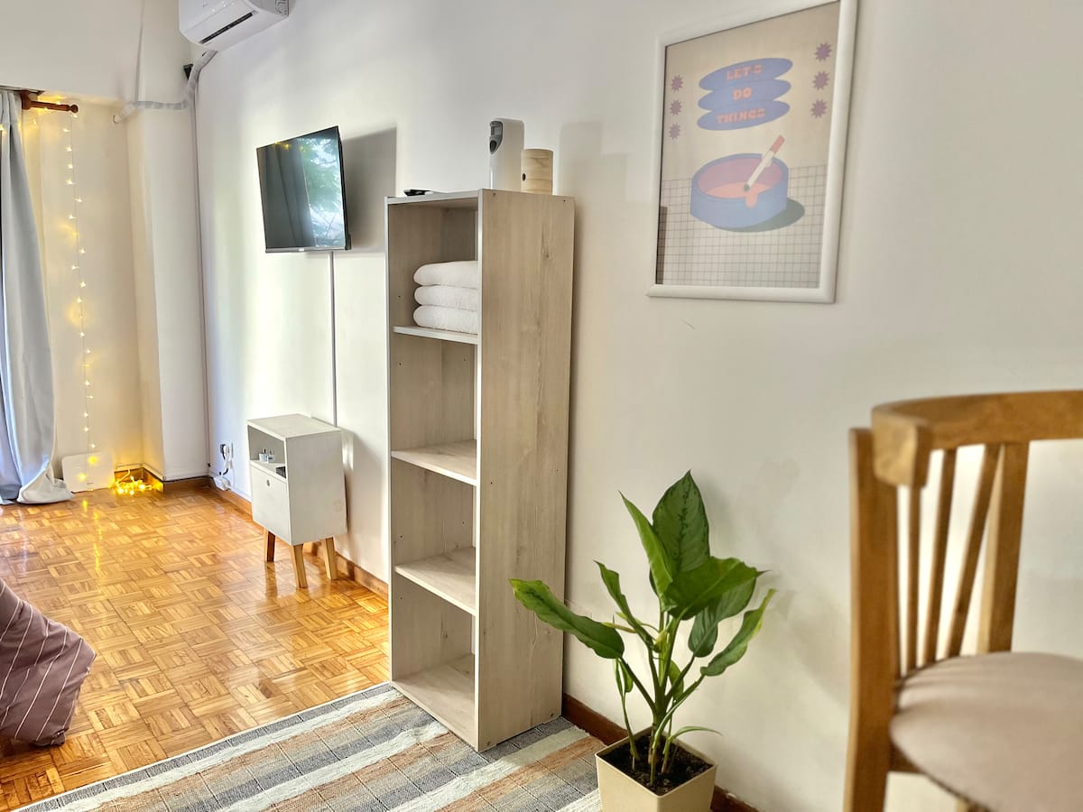 Studio apartment in Colegiales, 100 metres from Teatro Vorterix and on Av. Lacroze. Equipped with kitchen, private bathroom, free Wi‑Fi, TV, air conditioning and heating. Sleeps up to 3 guests, with a king-size double bed and a single bed, plus utensils and bedding.