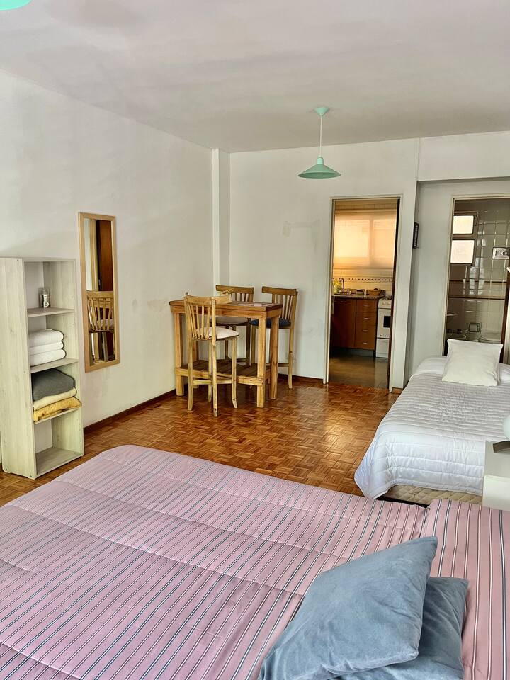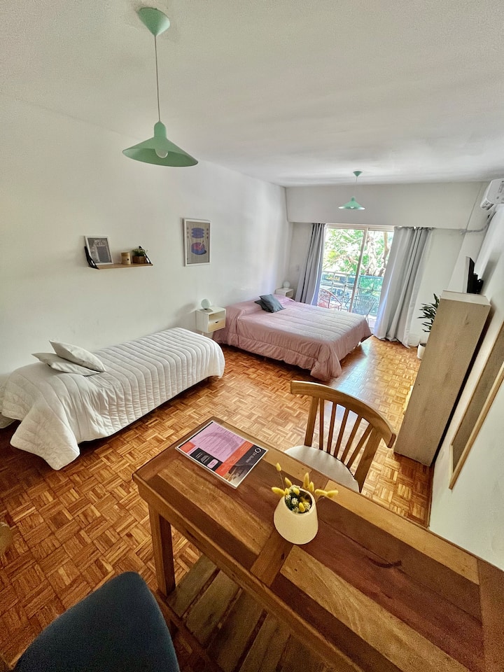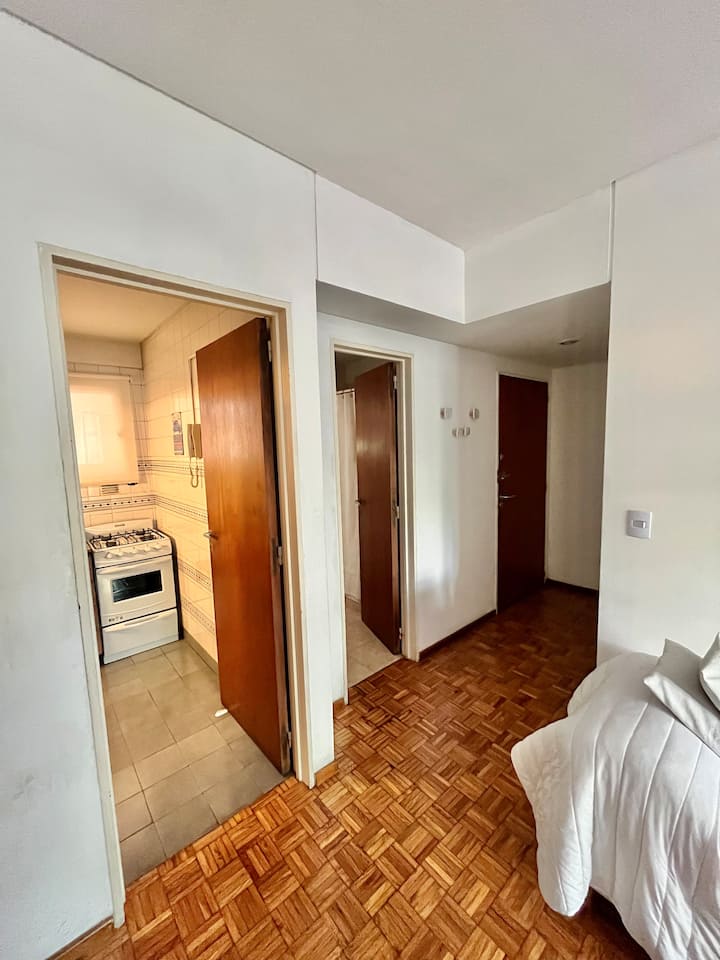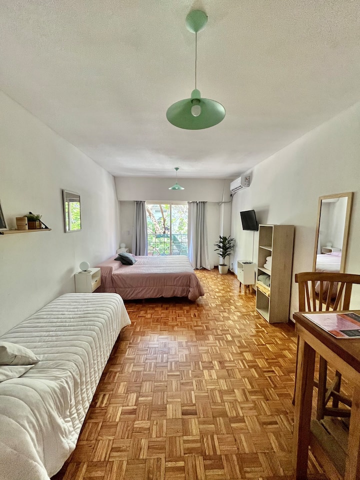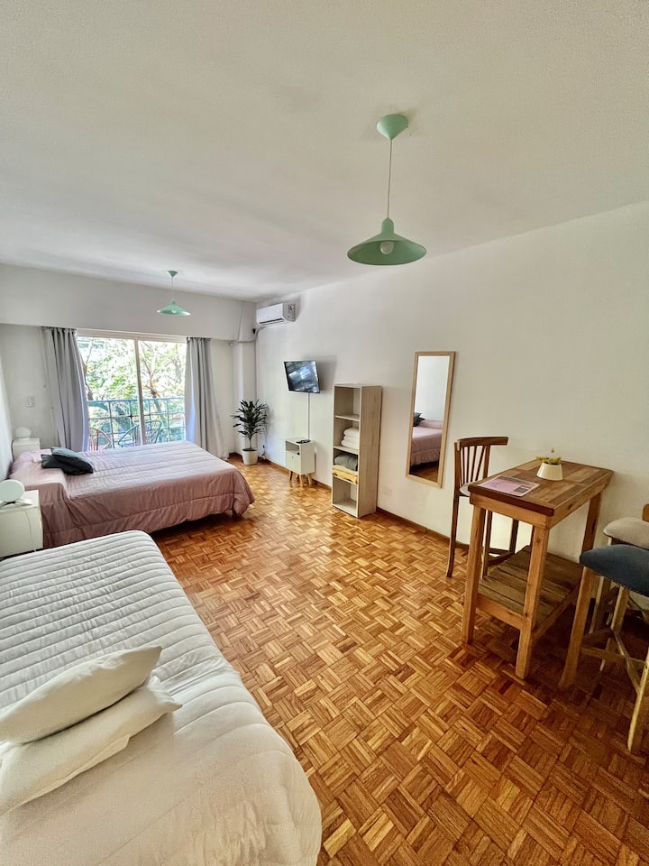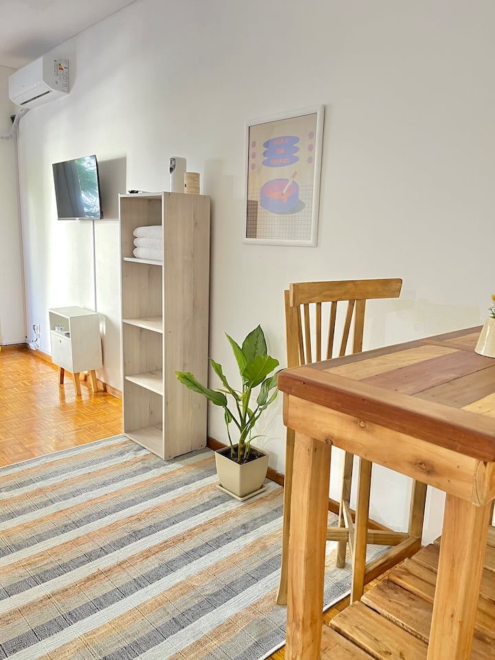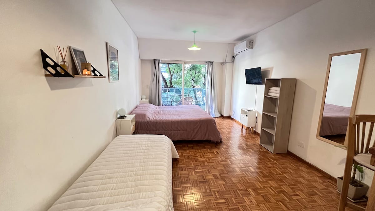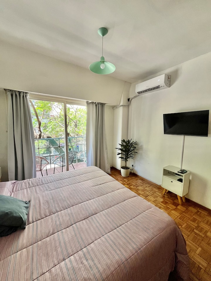 Studio apartment in Colegiales, 100 metres from Teatro Vorterix and on Av. Lacroze. Equipped with kitchen, private bathroom, free Wi‑Fi, TV, air conditioning and heating. Sleeps up to 3 guests, with a king-size double bed and a single bed, plus utensils and bedding.