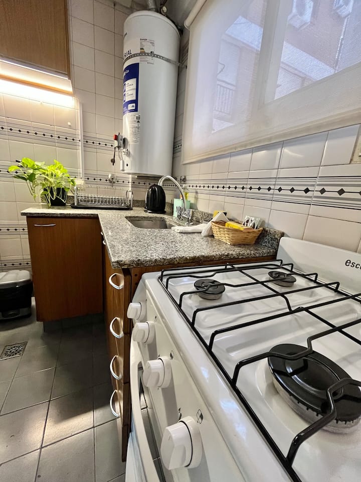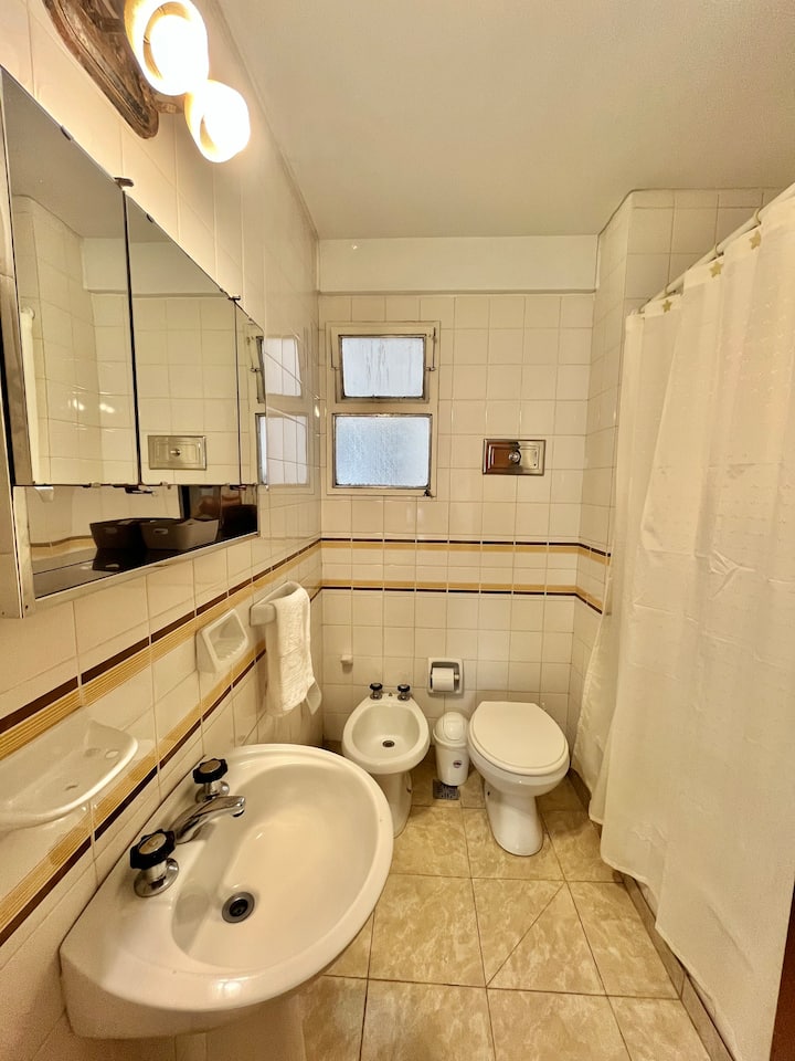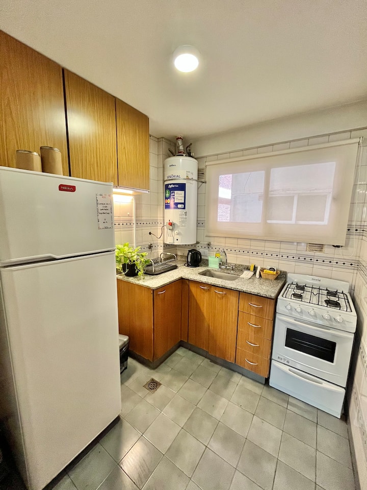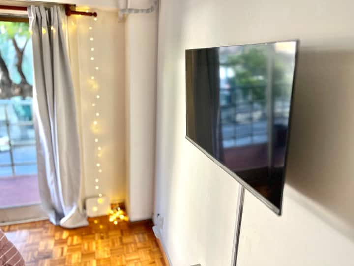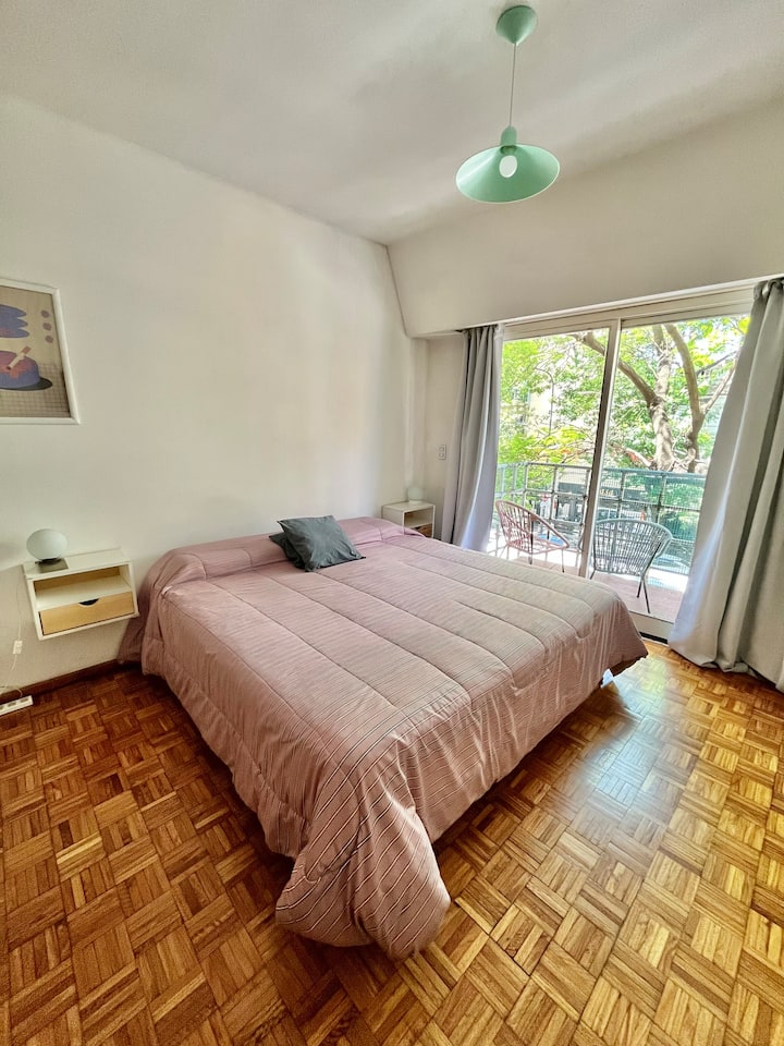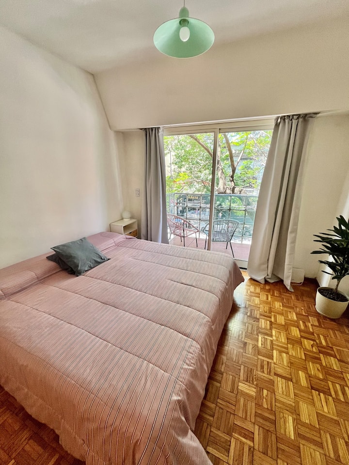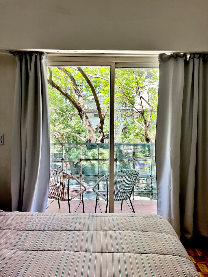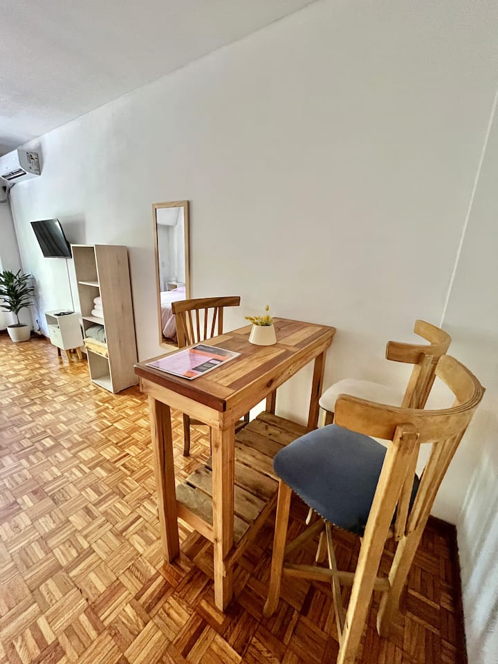 Studio apartment in Colegiales, 100 metres from Teatro Vorterix and on Av. Lacroze. Equipped with kitchen, private bathroom, free Wi‑Fi, TV, air conditioning and heating. Sleeps up to 3 guests, with a king-size double bed and a single bed, plus utensils and bedding.