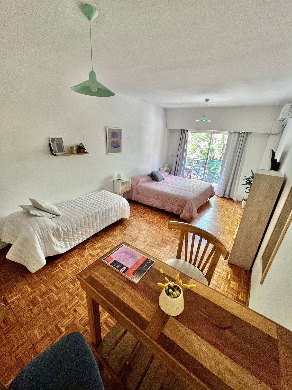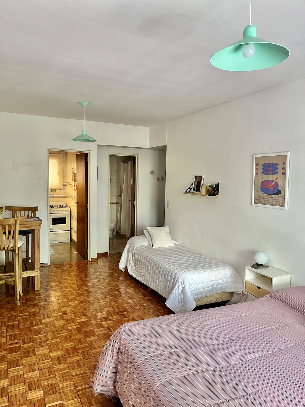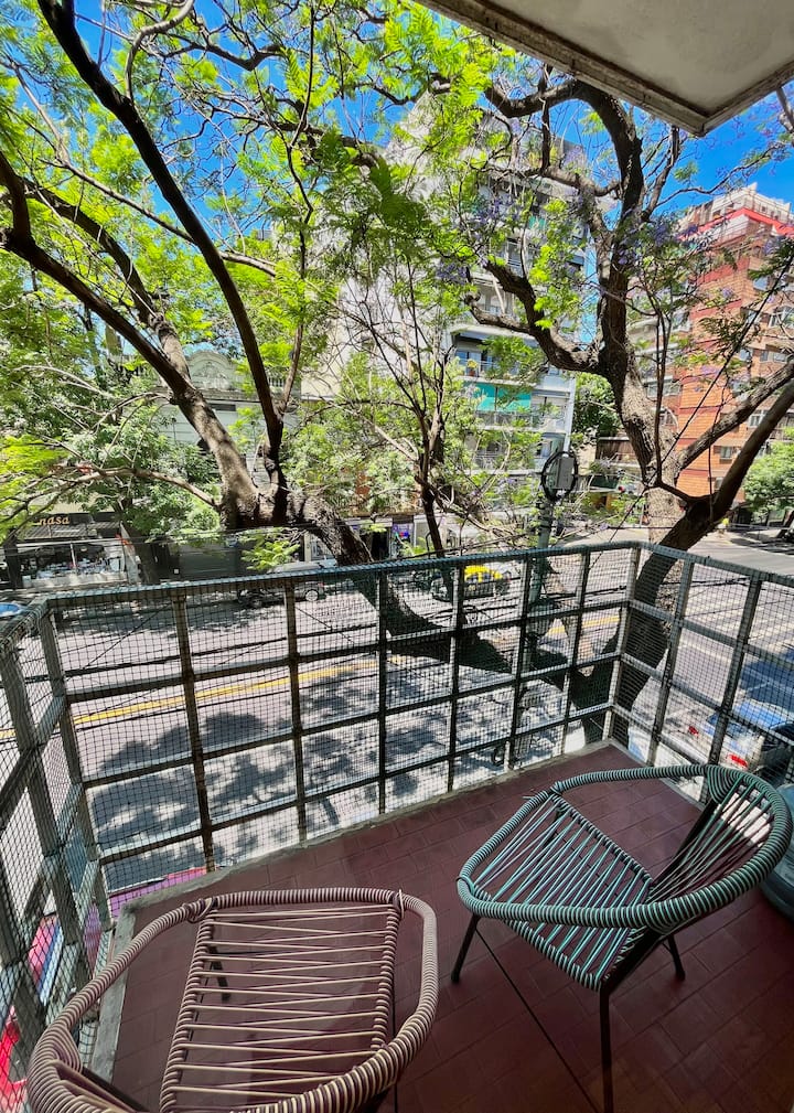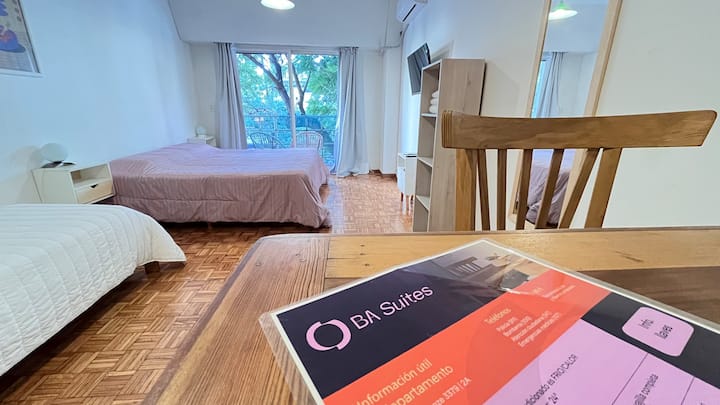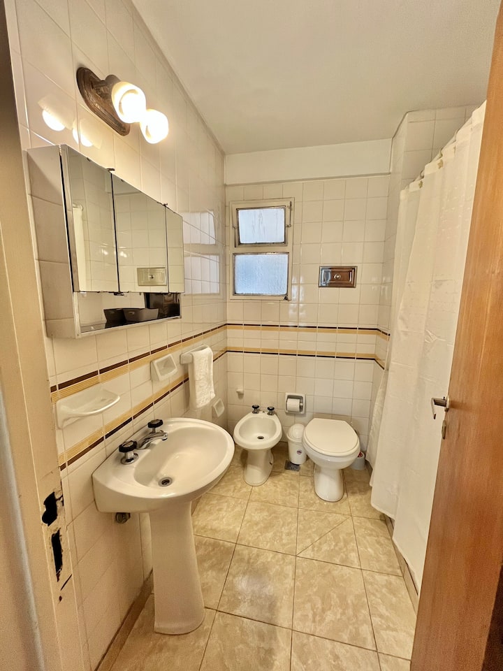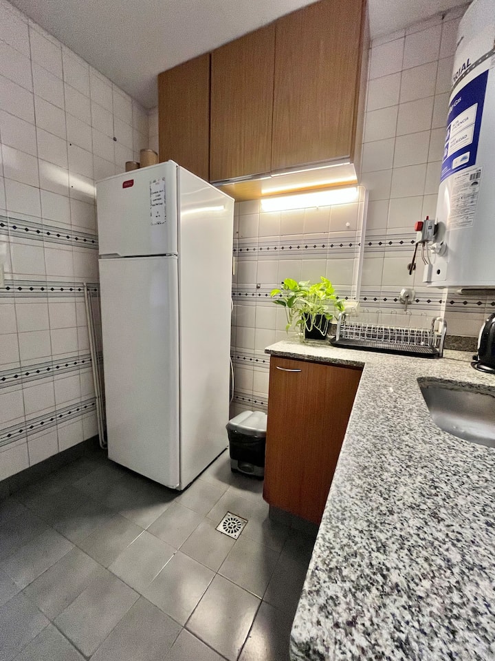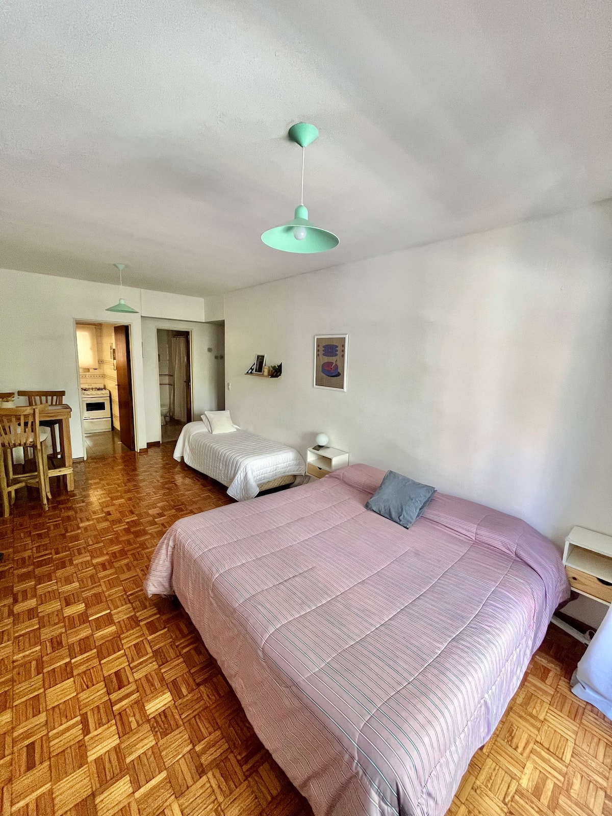 Studio apartment in Colegiales, 100 metres from Teatro Vorterix and on Av. Lacroze. Equipped with kitchen, private bathroom, free Wi‑Fi, TV, air conditioning and heating. Sleeps up to 3 guests, with a king-size double bed and a single bed, plus utensils and bedding.
