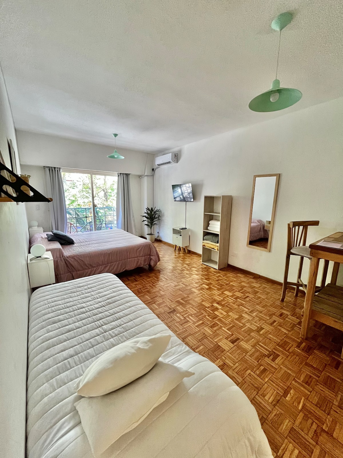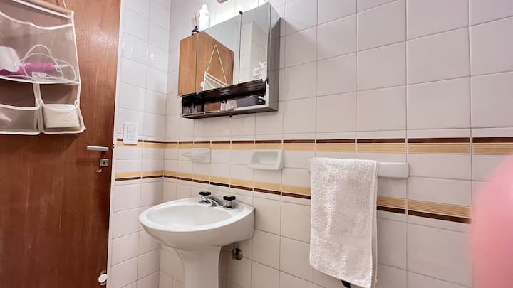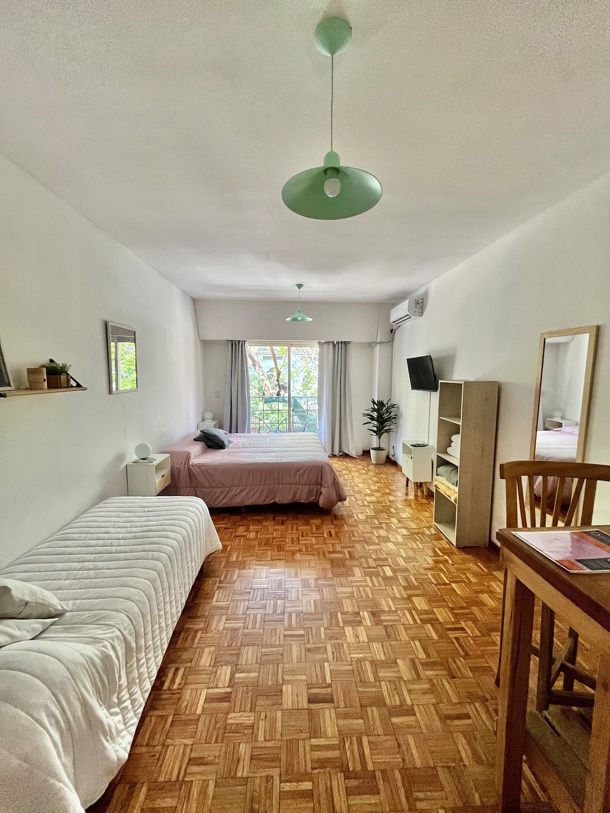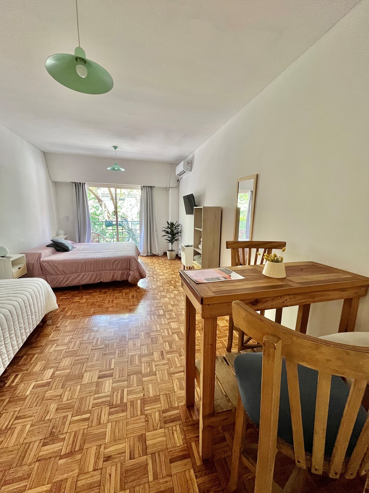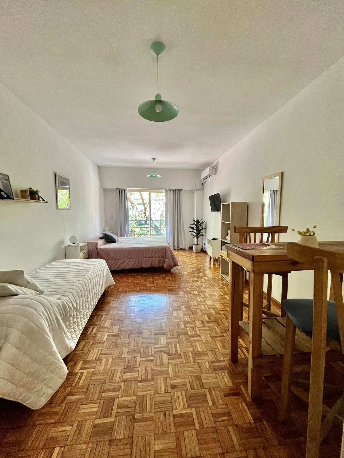 Studio apartment in Colegiales, 100 metres from Teatro Vorterix and on Av. Lacroze. Equipped with kitchen, private bathroom, free Wi‑Fi, TV, air conditioning and heating. Sleeps up to 3 guests, with a king-size double bed and a single bed, plus utensils and bedding.