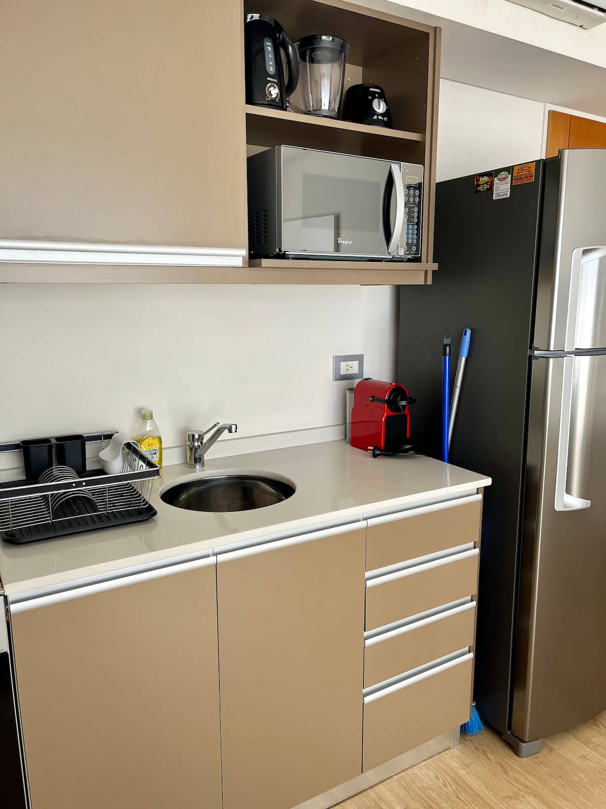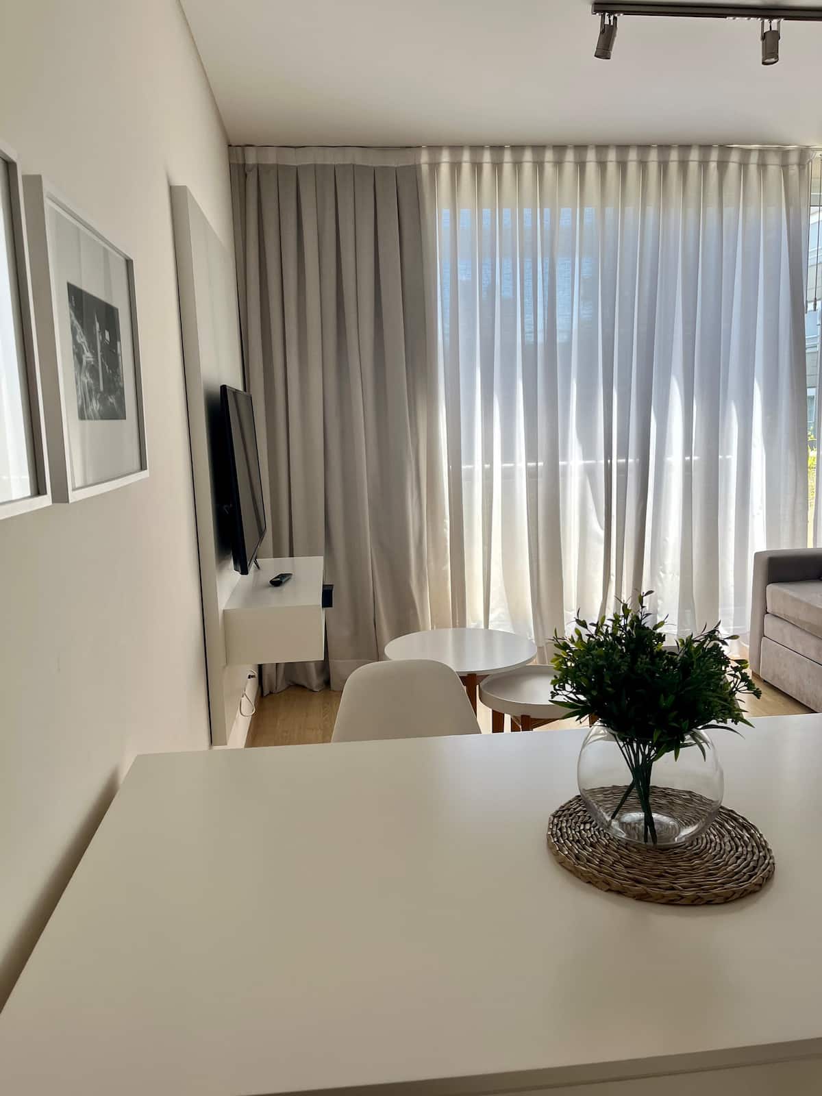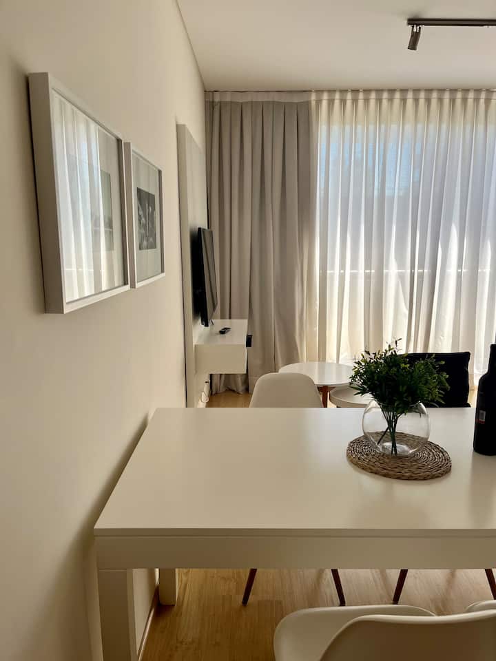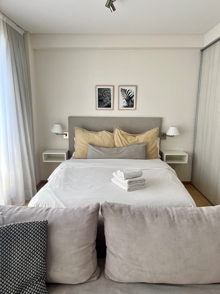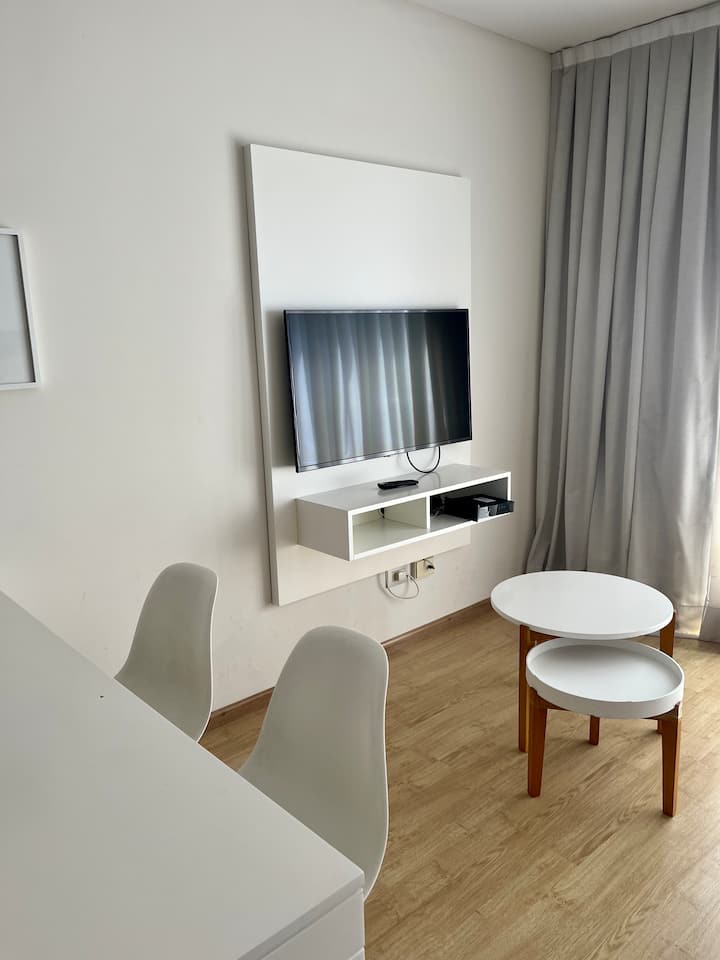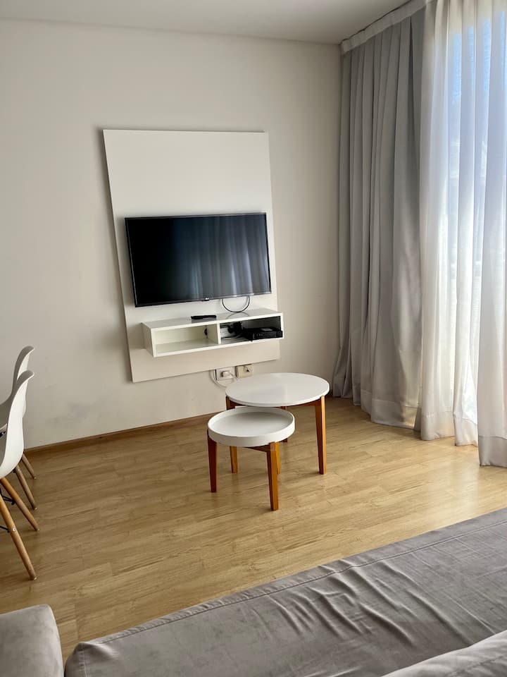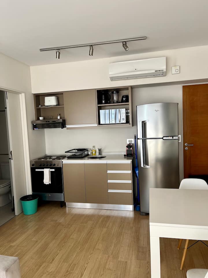 Studio apartment of 46 m² with a street-facing balcony. Kitchen is fully equipped with a refrigerator, microwave, electric kettle, coffee maker, blender and toaster. Air conditioning (hot/cold), a 43" Smart TV, cable TV and Wi-Fi are included.