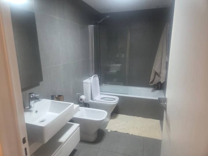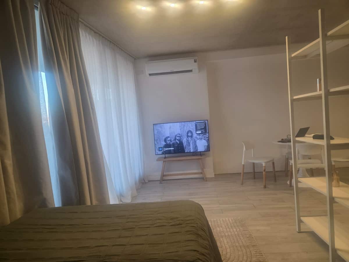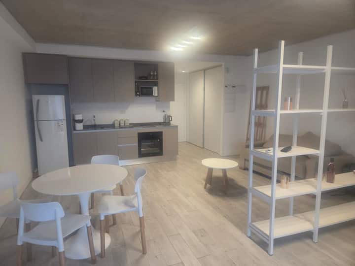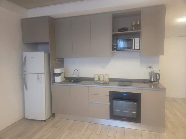 Studio apartment with a separated layout for the rest, living and dining areas. Fully equipped kitchen, queen-size bed, and a full bathroom. Located in a modern complex in Colegiales with access to an outdoor pool and a wellness area with a heated pool, sauna and jacuzzi.