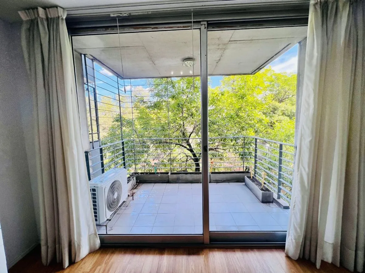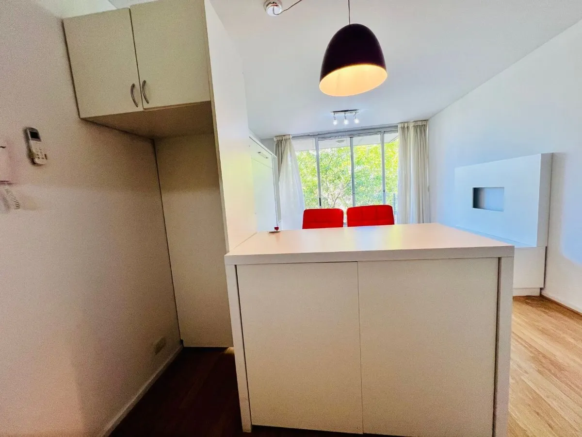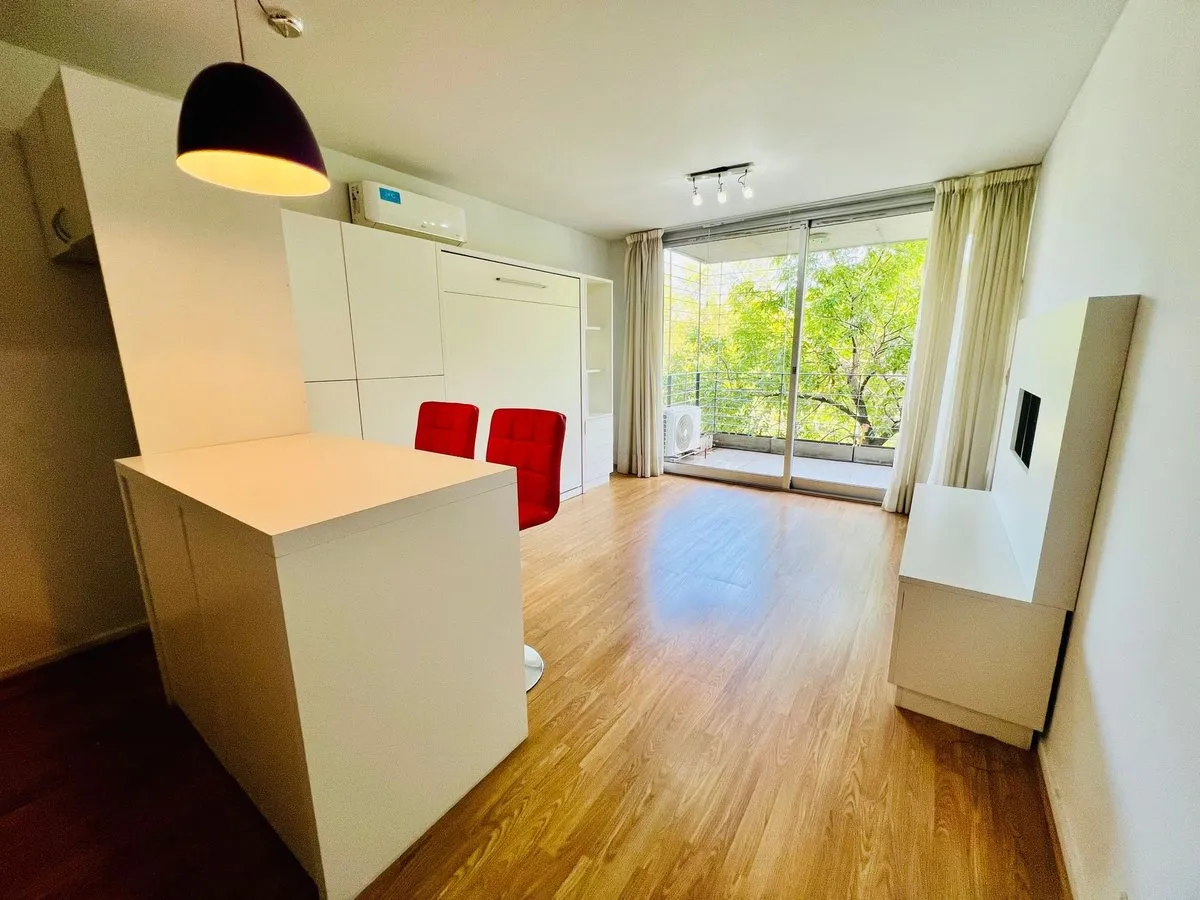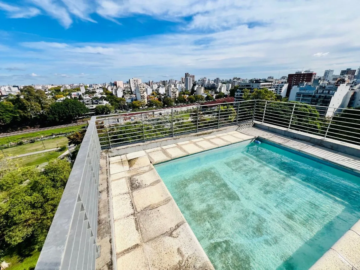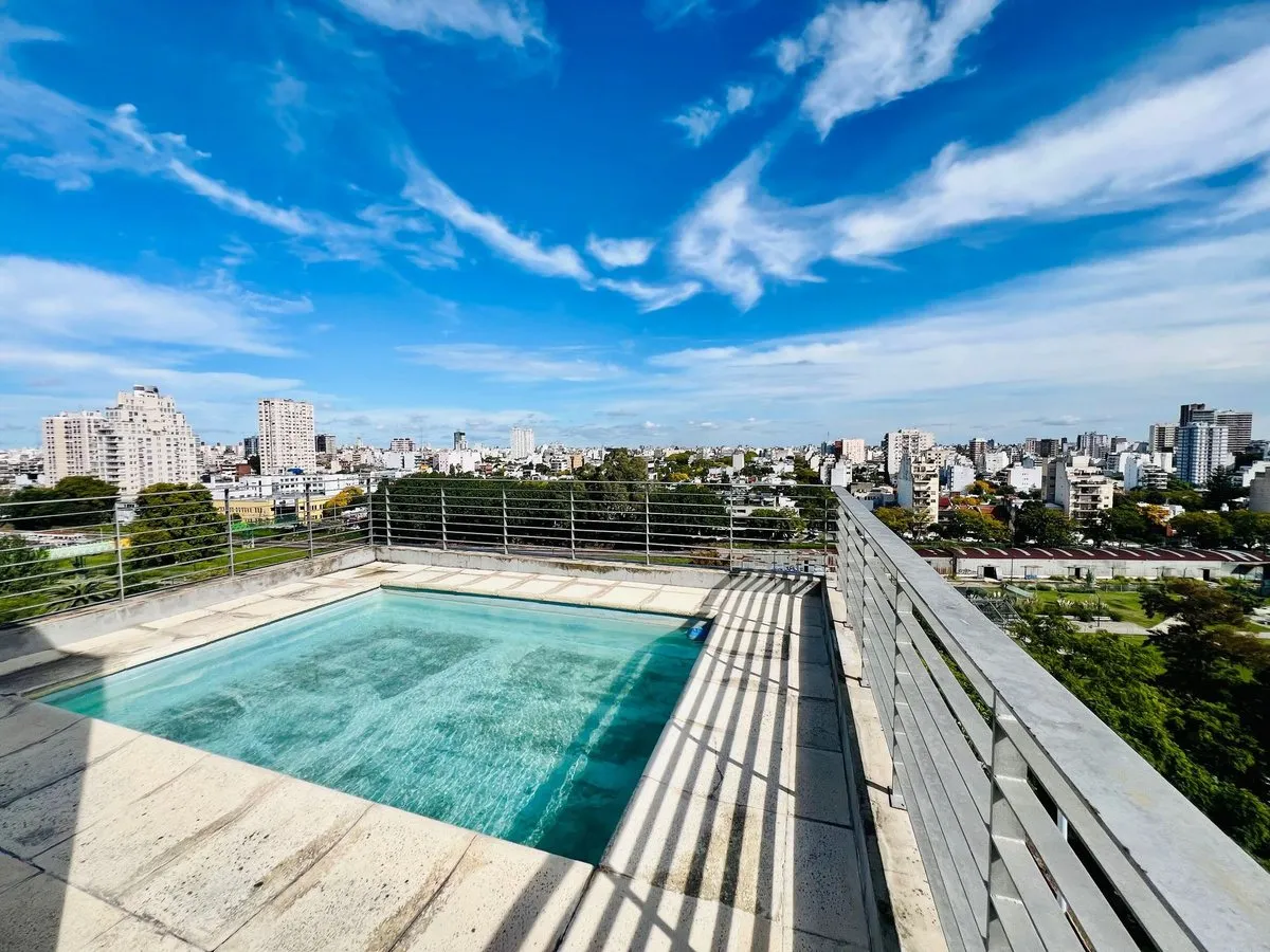 Furnished studio apartment with 34 m² in Colegiales, on Virrey Arredondo. It is on the 3rd floor of a 10-storey building, street-facing with west orientation, overlooking Plaza Paso and the Colegiales rail promenade. The unit includes an integrated living and dining area with kitchen, a full bathroom, a balcony, and a two-place foldable bed, plus an ample closet and a breakfast bar. The building has a pool, solarium, communal room (SUM) and a grill.