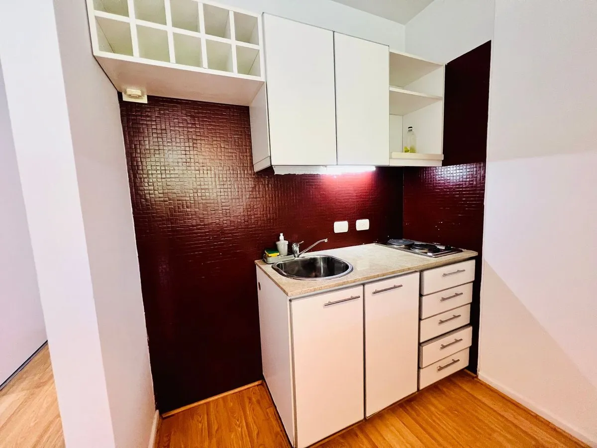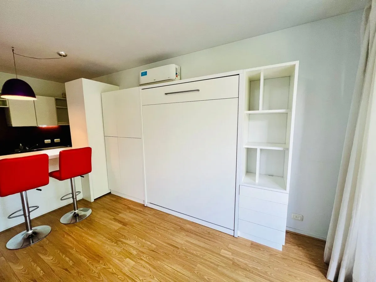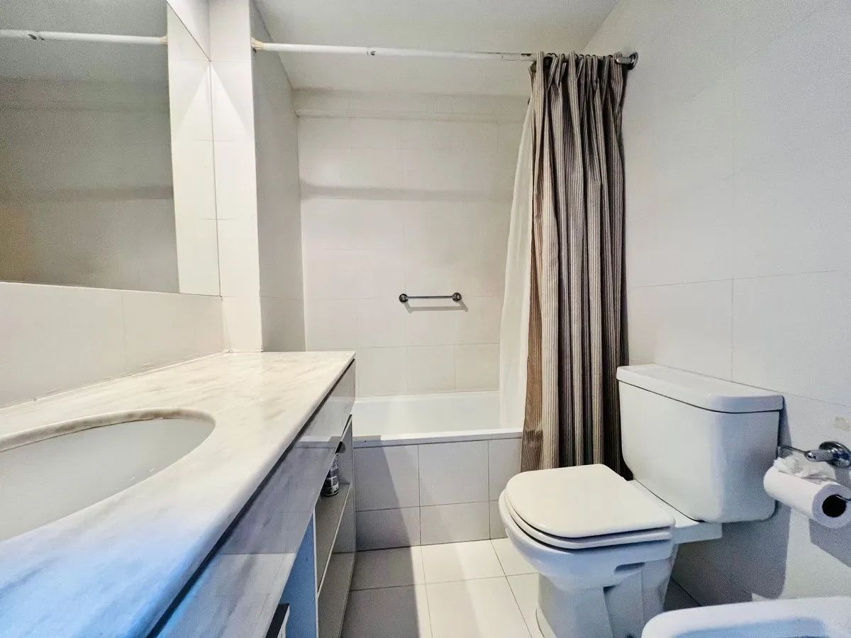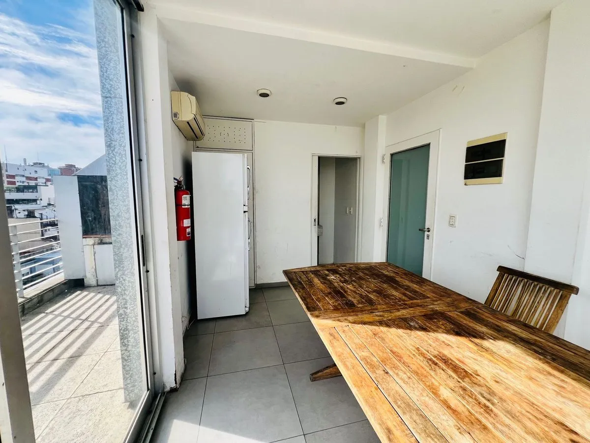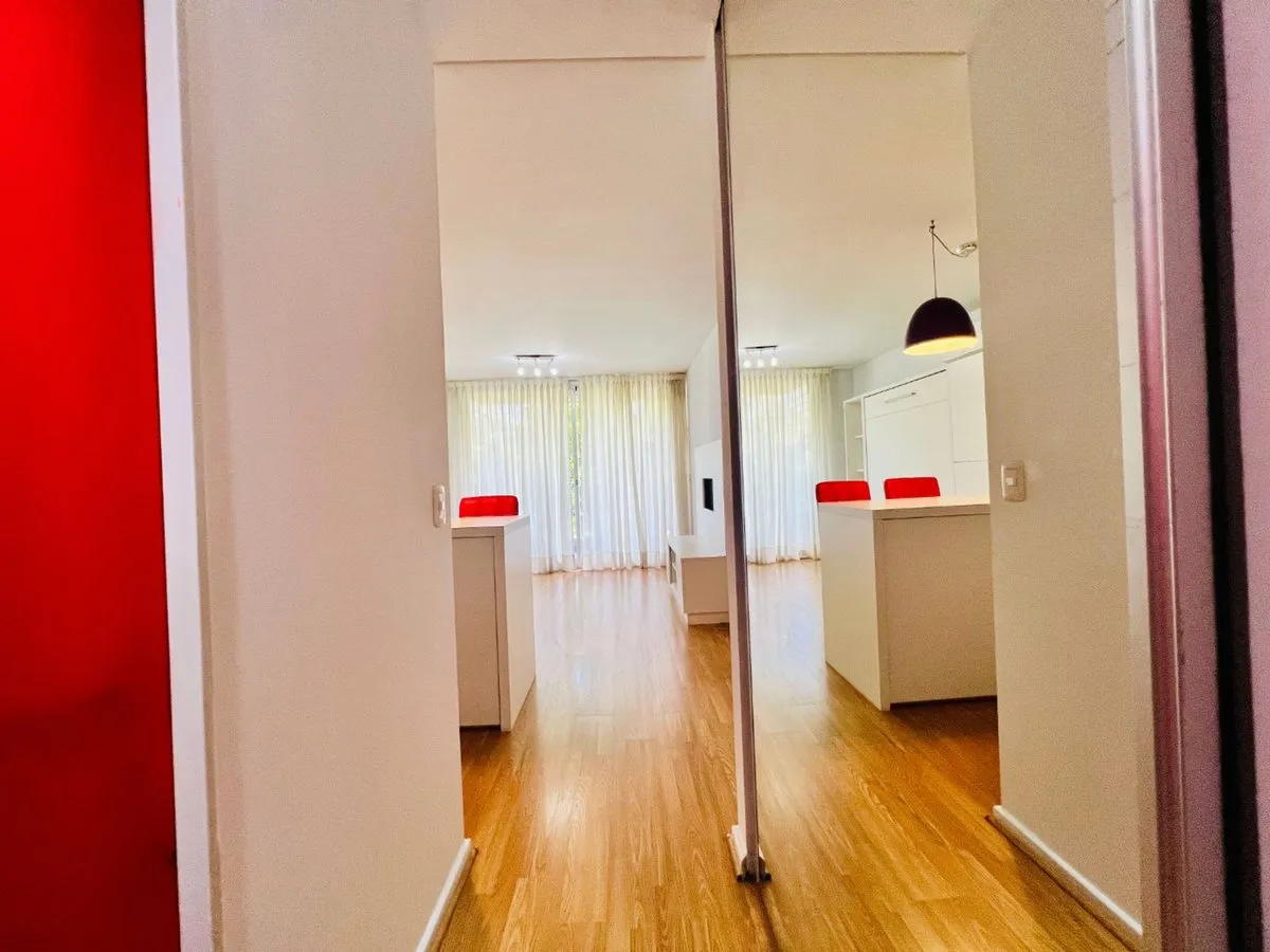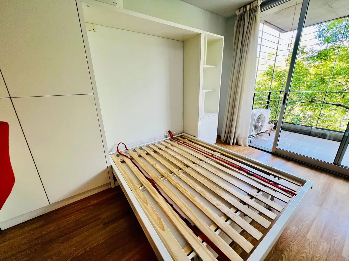 Furnished studio apartment with 34 m² in Colegiales, on Virrey Arredondo. It is on the 3rd floor of a 10-storey building, street-facing with west orientation, overlooking Plaza Paso and the Colegiales rail promenade. The unit includes an integrated living and dining area with kitchen, a full bathroom, a balcony, and a two-place foldable bed, plus an ample closet and a breakfast bar. The building has a pool, solarium, communal room (SUM) and a grill.