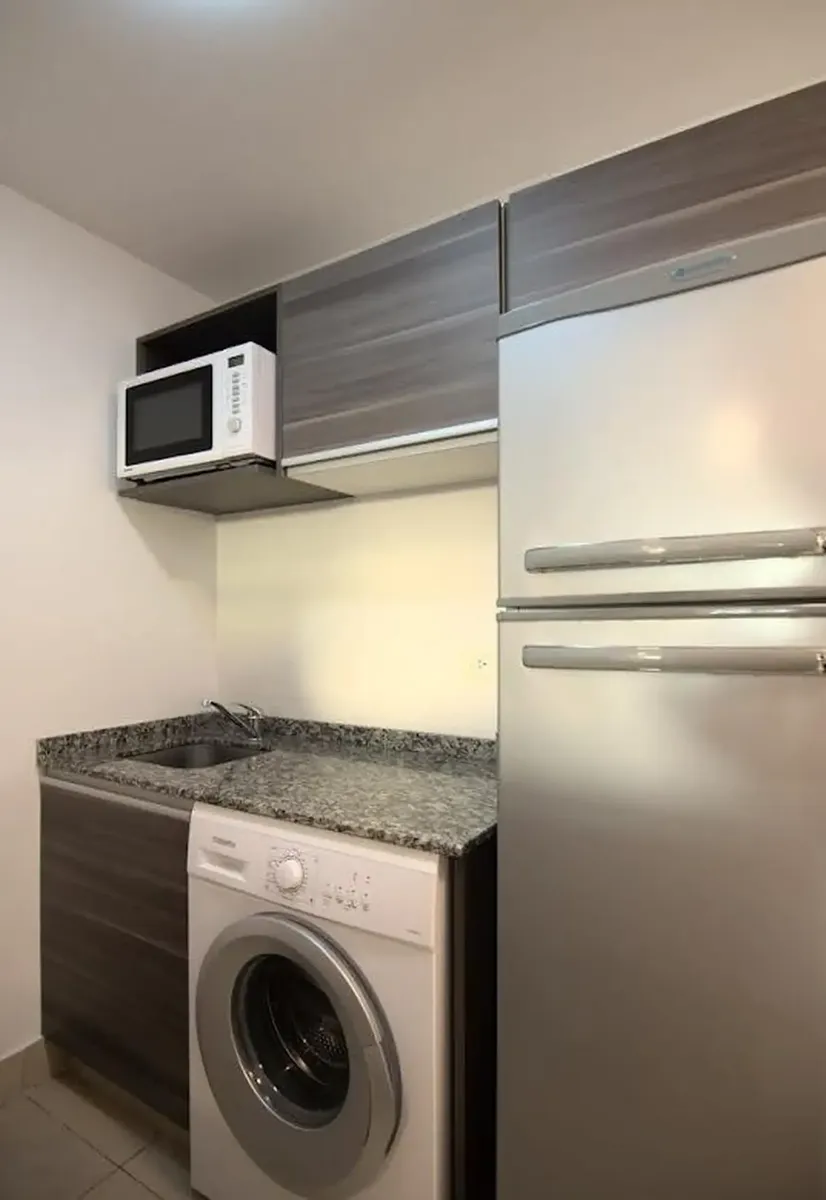 Furnished and equipped studio apartment with wooden floors, living-dining area and a balcony. Integrated kitchen with microwave and fridge/freezer, washing machine, full bathroom with bathtub, air conditioning (hot/cold) and WiFi heating, plus TV. Building amenities include a pool with solarium, terrace, grill and communal room (SUM). Monthly cost is a package with WiFi included; utilities may have consumption limits. Minimum stay is 3 months and maximum is 12 months; the published monthly rate