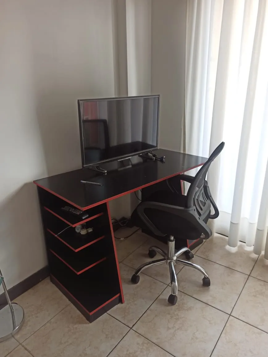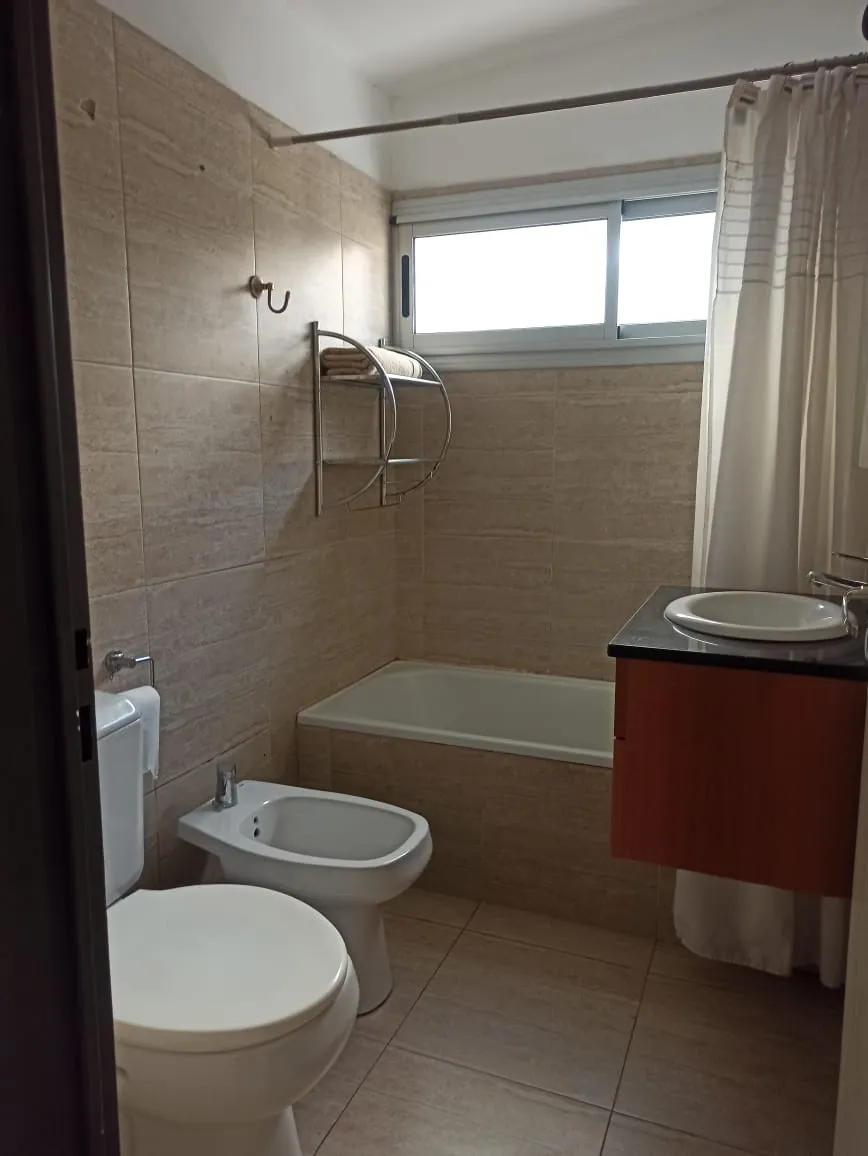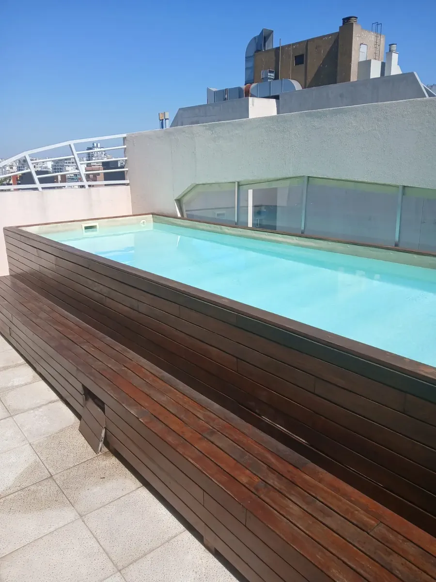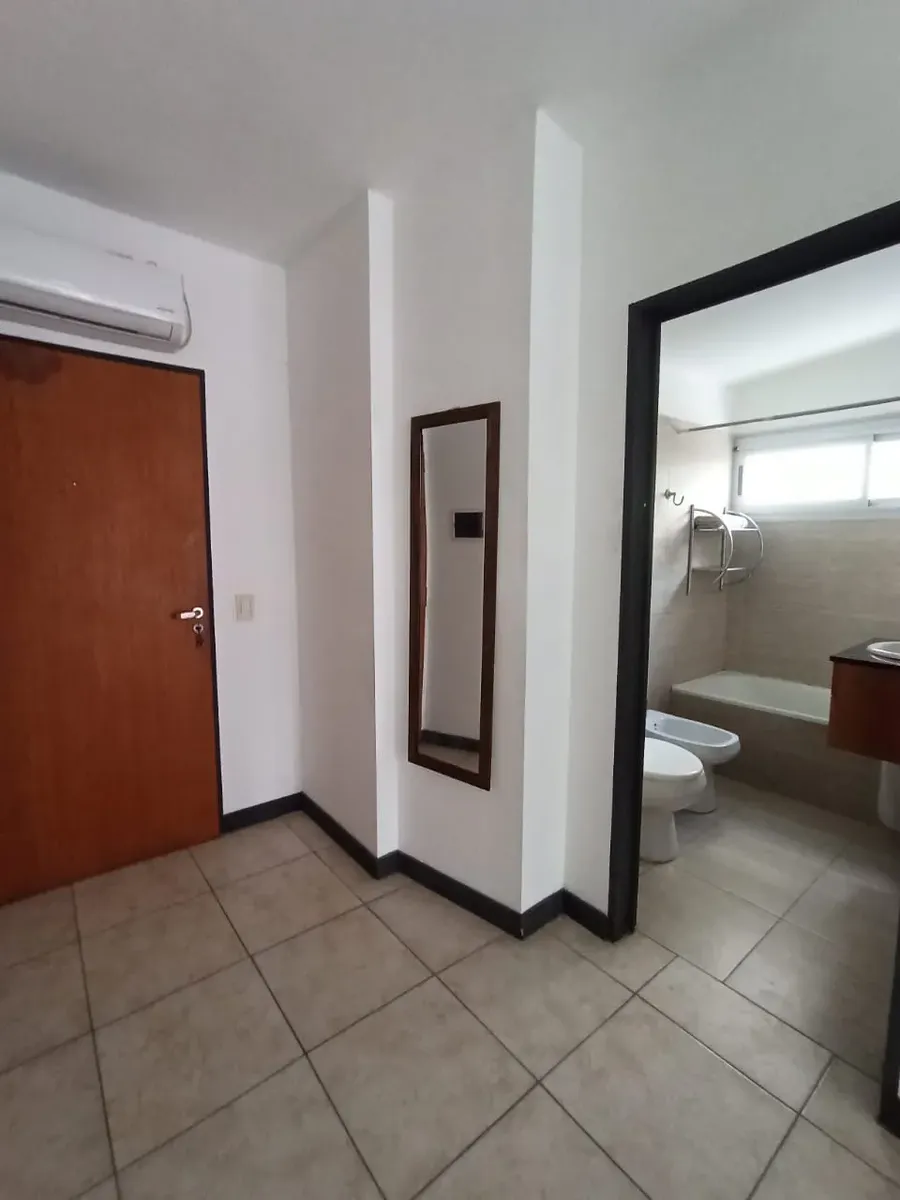 Furnished studio apartment with a balcony in Palermo Hollywood, in the Distrito Audiovisual, north-facing and courtyard-facing. It is equipped with a double bed, inverter air conditioning, an integrated kitchen with electric cooktop and oven, a fridge with freezer, a washing machine, a full bathroom with a bathtub, and a work area. WiFi is included, along with double curtains (blackout and sheer). The building has a pool, solarium, a communal room with a grill (by reservation), and a rooftop ter