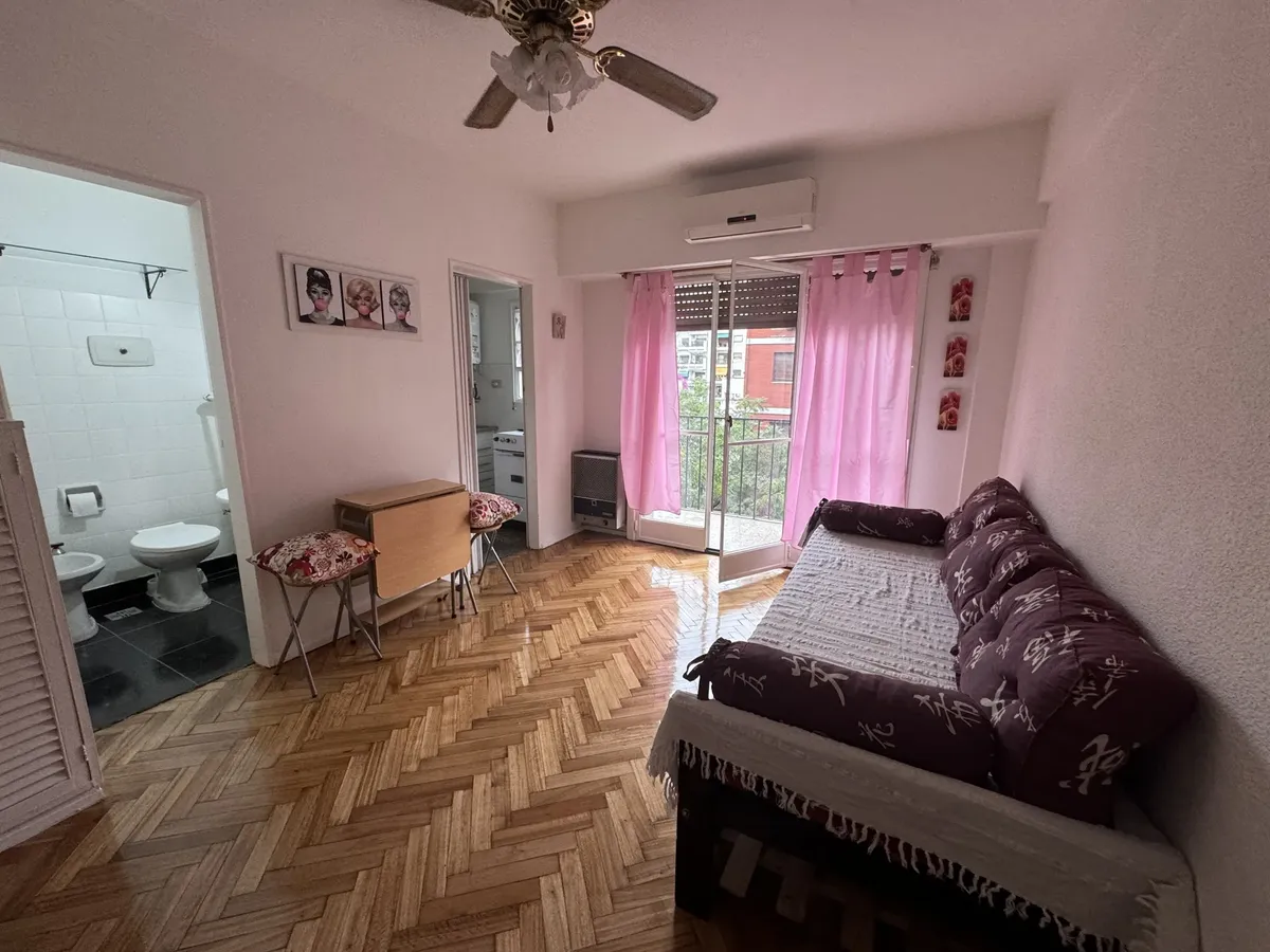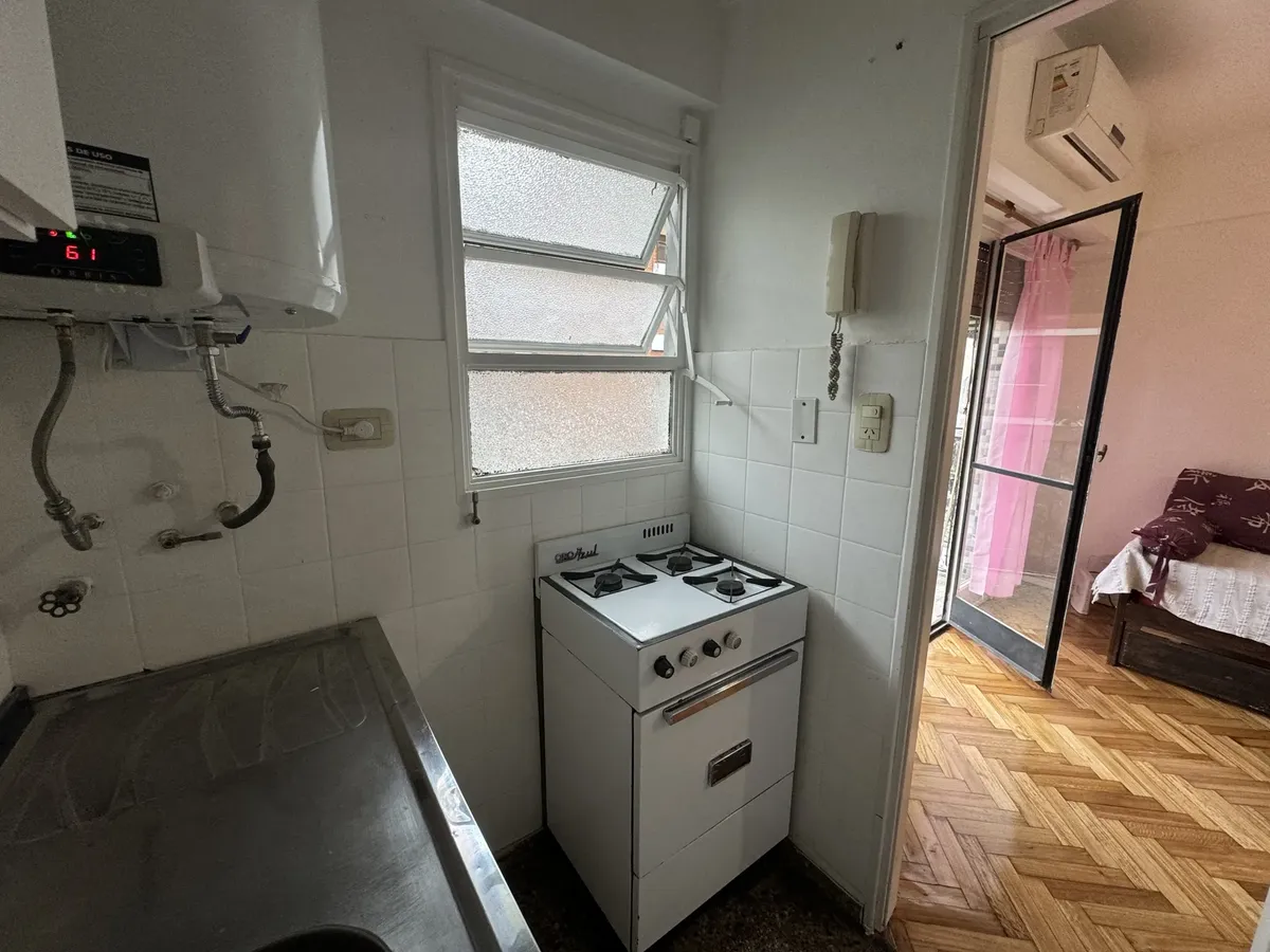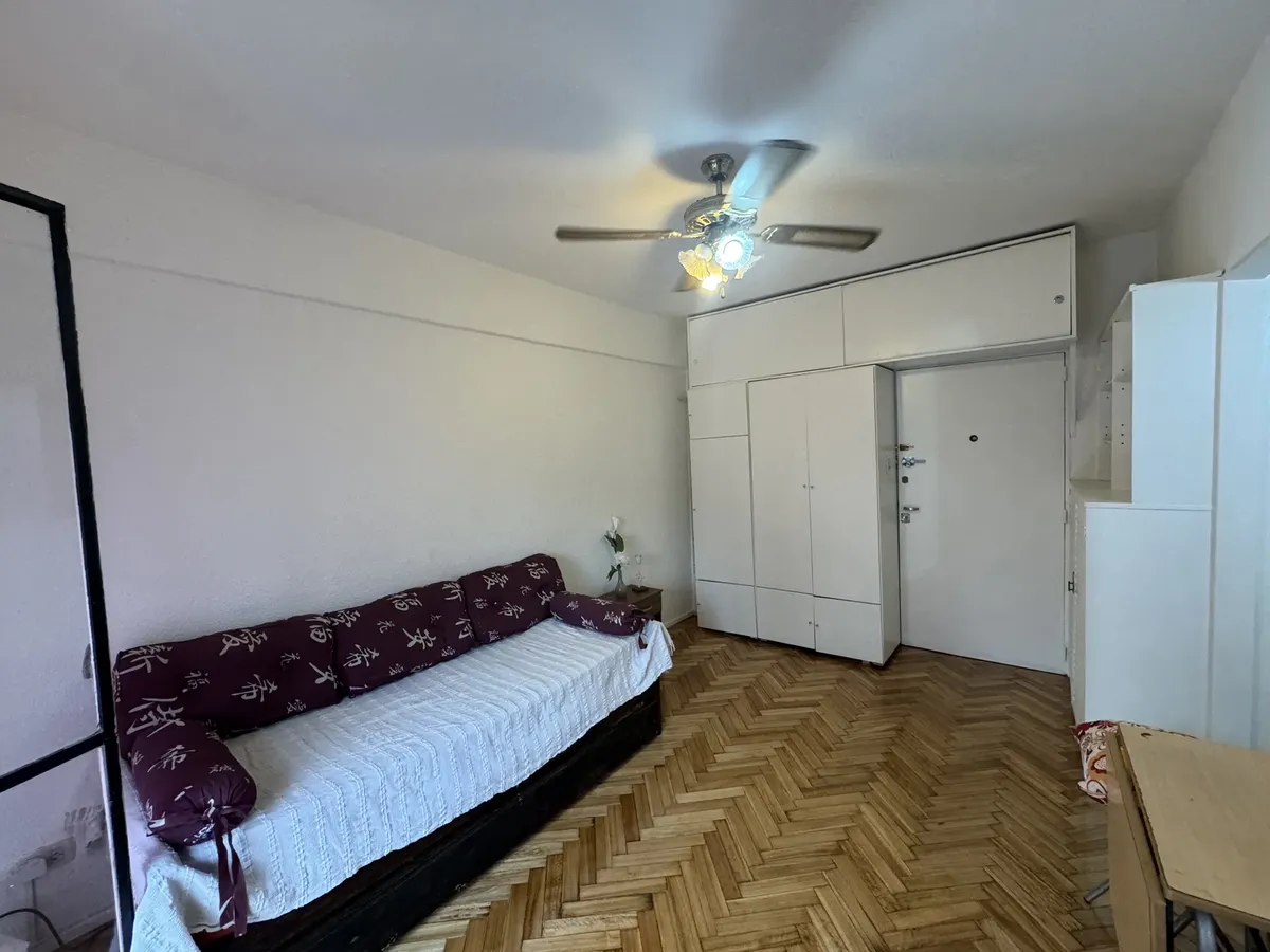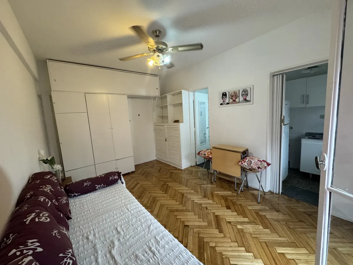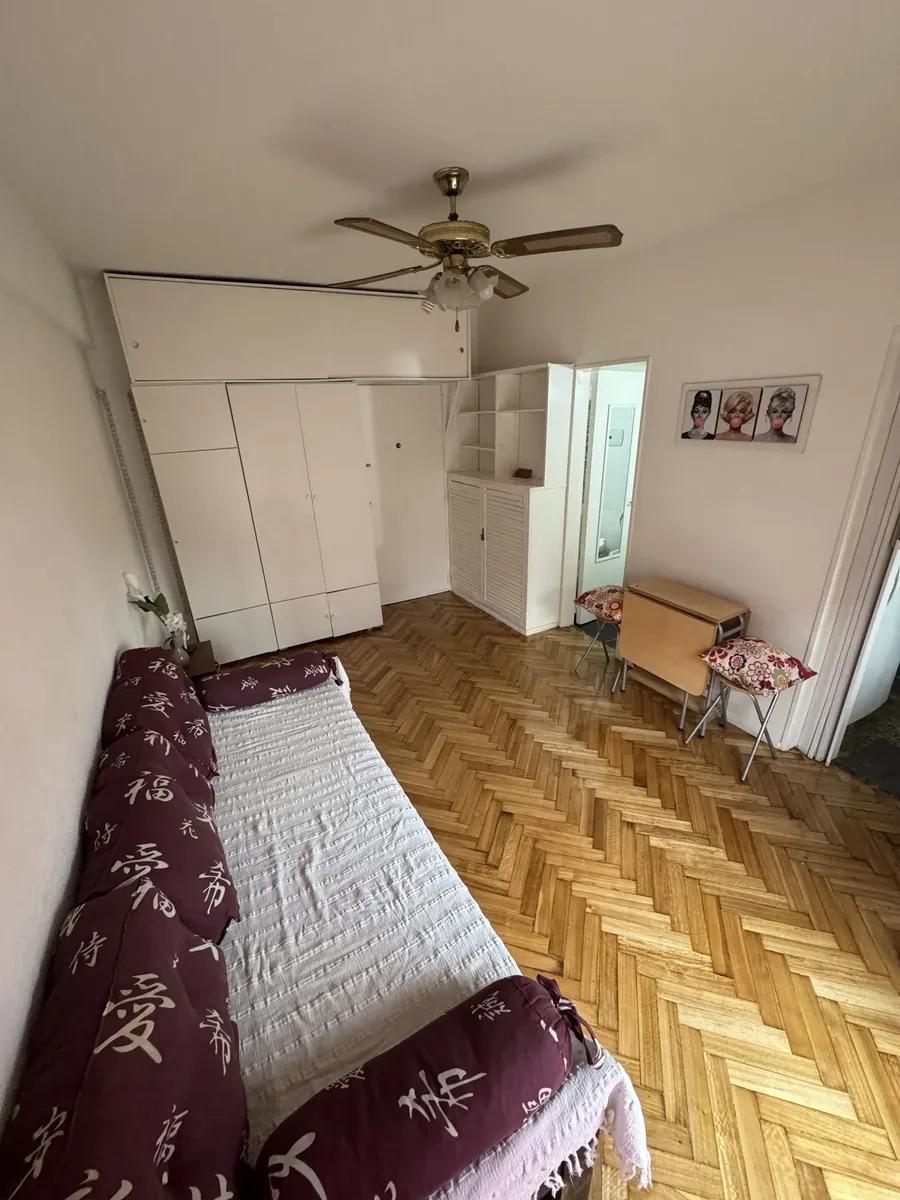 Furnished studio apartment on the 5th floor, street-facing, with a balcony. The unit has a single main room that can be used as bedroom and living-dining area. Full kitchen with connections for a washing machine, full bathroom with a bathtub, air conditioning, gas hot-plate stove, gas heater and an electric water heater.