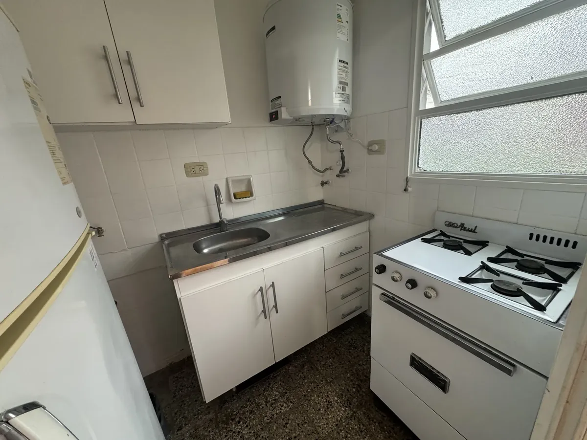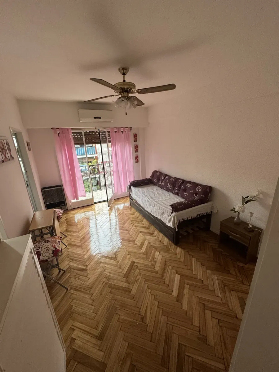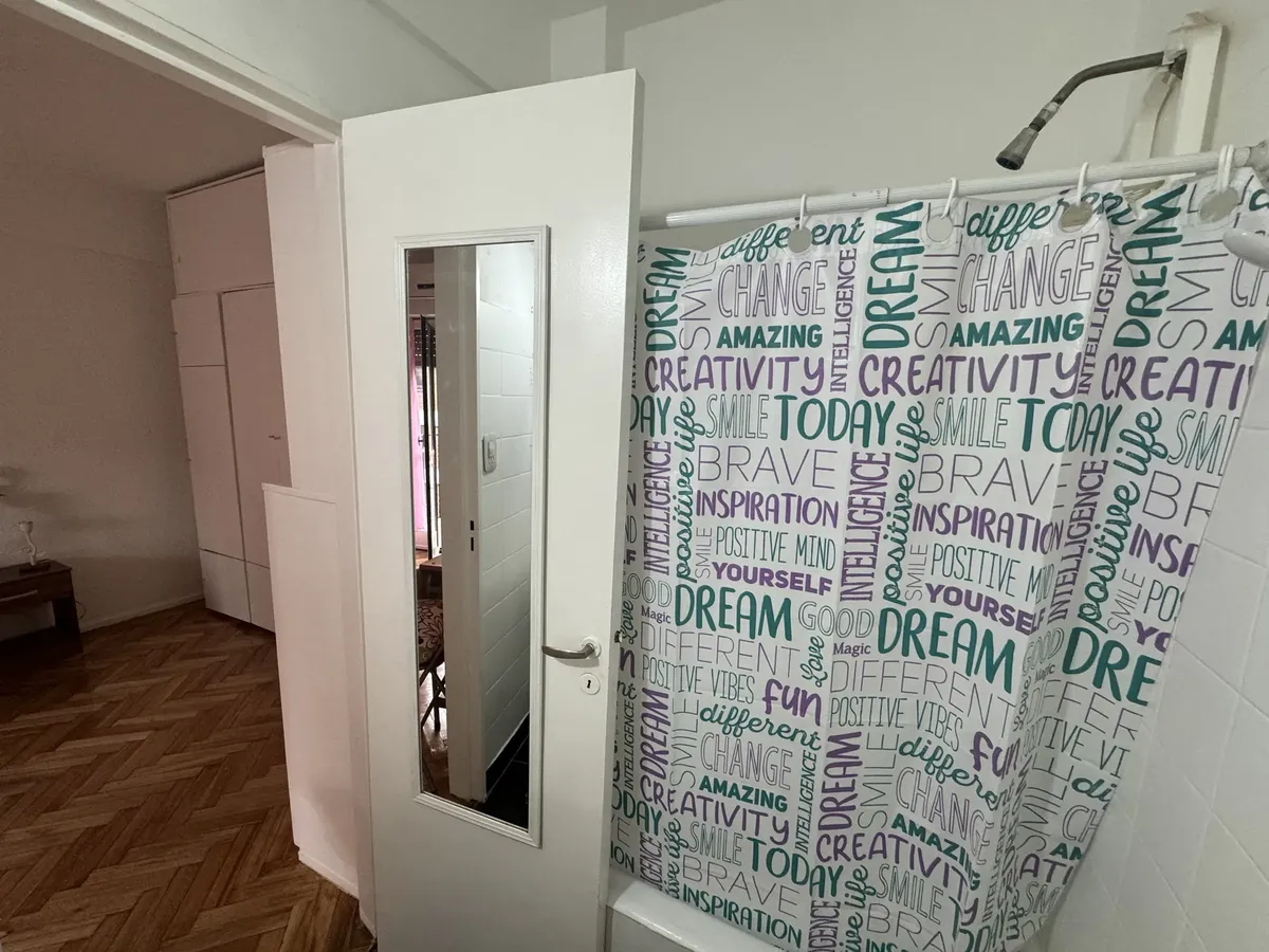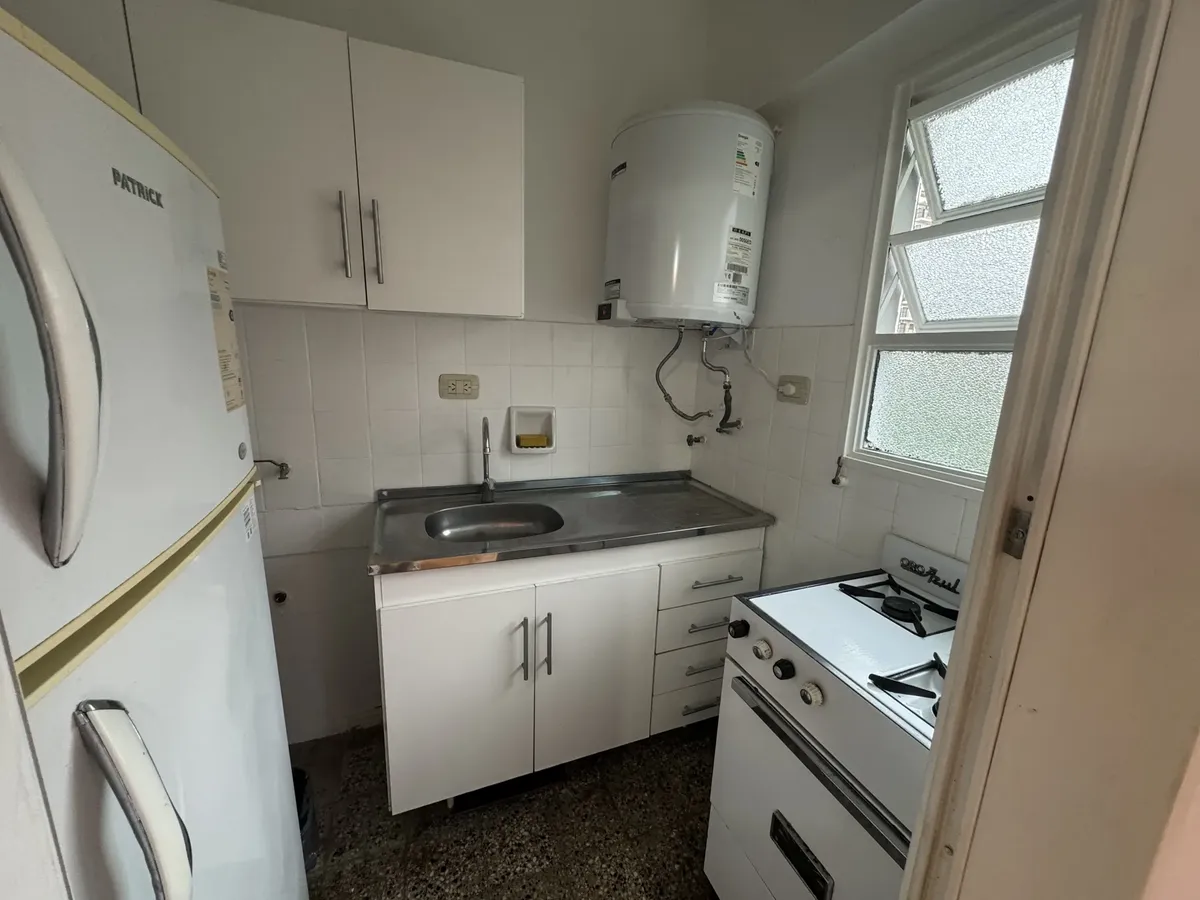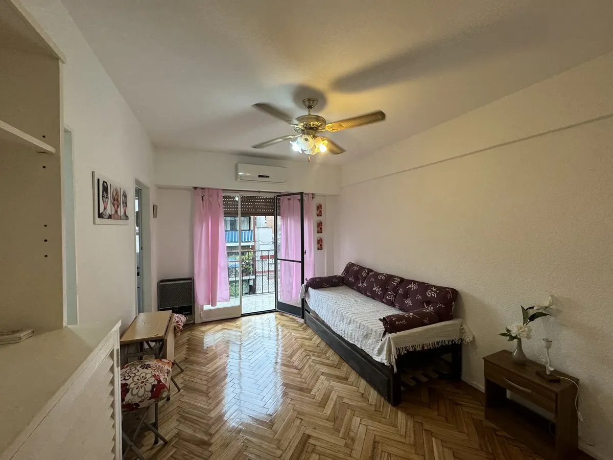 Furnished studio apartment on the 5th floor, street-facing, with a balcony. The unit has a single main room that can be used as bedroom and living-dining area. Full kitchen with connections for a washing machine, full bathroom with a bathtub, air conditioning, gas hot-plate stove, gas heater and an electric water heater.