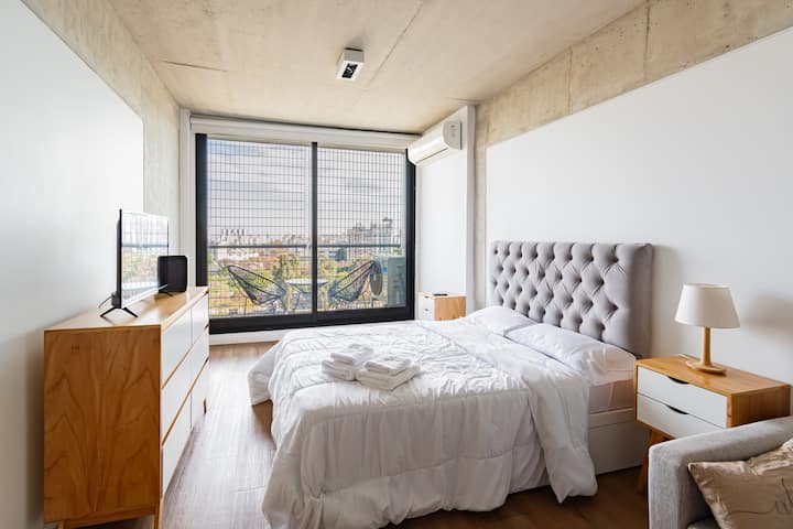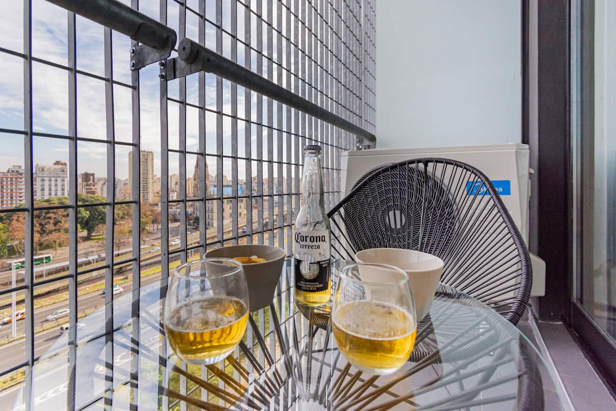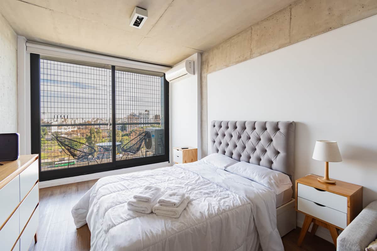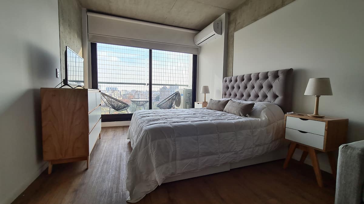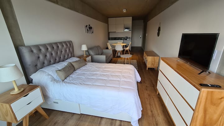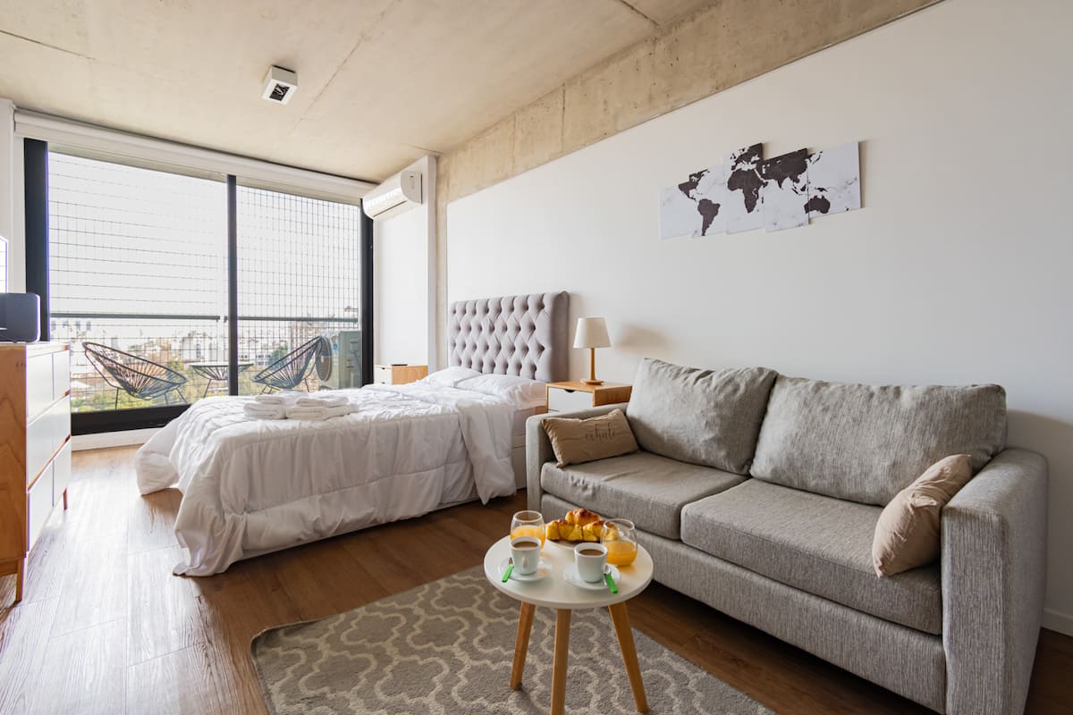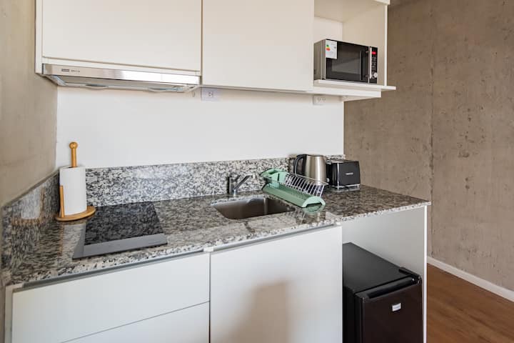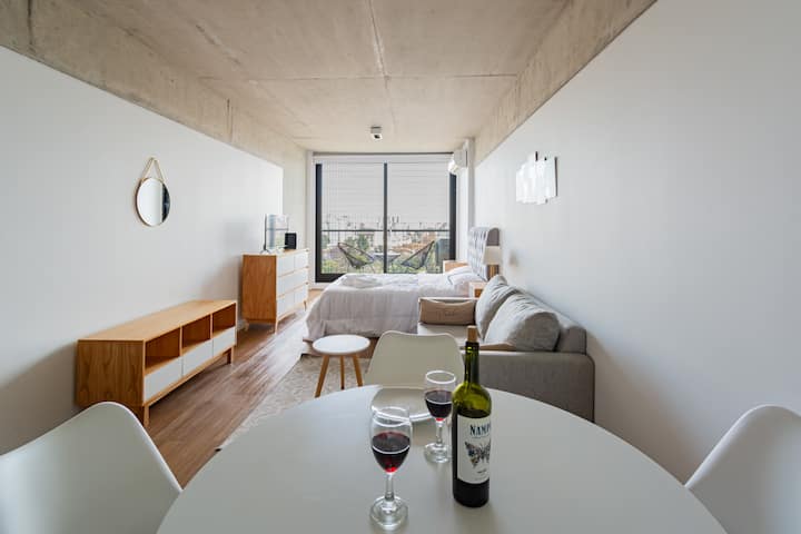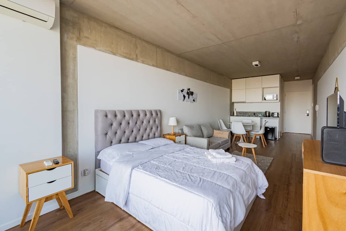 Studio apartment with balcony, 7th-floor street-facing unit in Constitución, with open city views. It is equipped with a double box-spring bed, blackout curtains and hot/cold air conditioning, and includes high-speed WiFi and a Smart TV for streaming services. The kitchenette has an electric stove, cookware and utensils, toaster, microwave and a refrigerator with freezer. Bathroom with shower and hair dryer. Check-in is from 3:00 pm to 10:00 pm, with late check-in from 10:00 pm to 2:00 am for an
