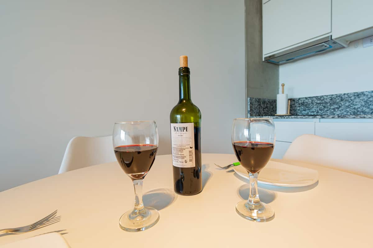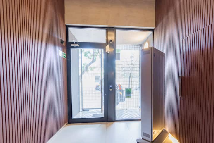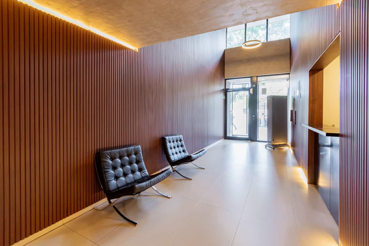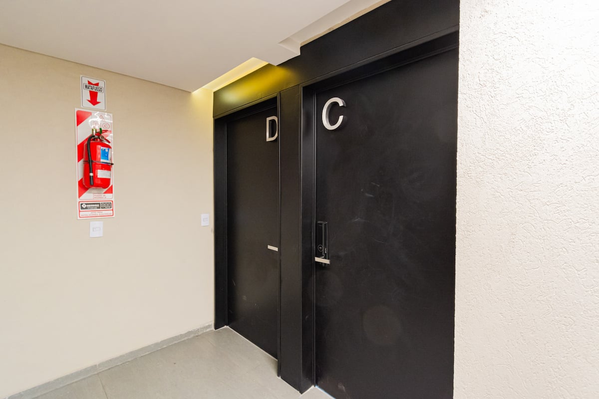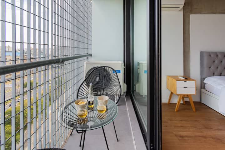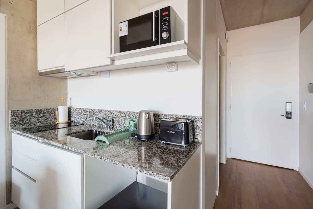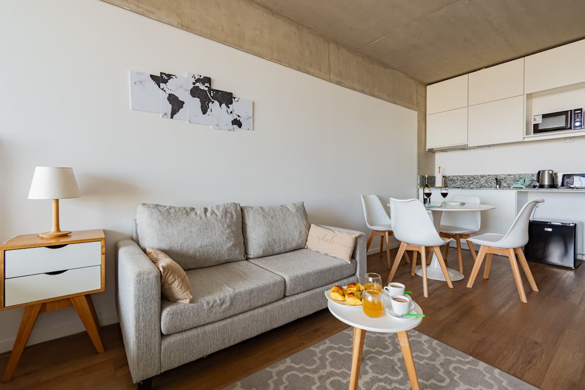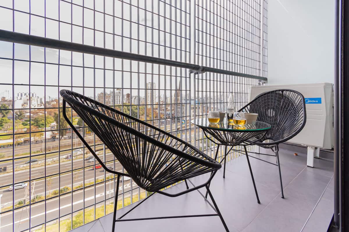 Studio apartment with balcony, 7th-floor street-facing unit in Constitución, with open city views. It is equipped with a double box-spring bed, blackout curtains and hot/cold air conditioning, and includes high-speed WiFi and a Smart TV for streaming services. The kitchenette has an electric stove, cookware and utensils, toaster, microwave and a refrigerator with freezer. Bathroom with shower and hair dryer. Check-in is from 3:00 pm to 10:00 pm, with late check-in from 10:00 pm to 2:00 am for an