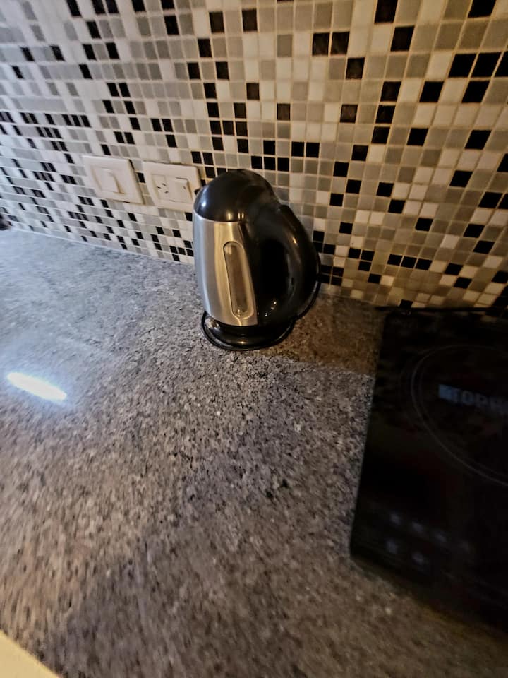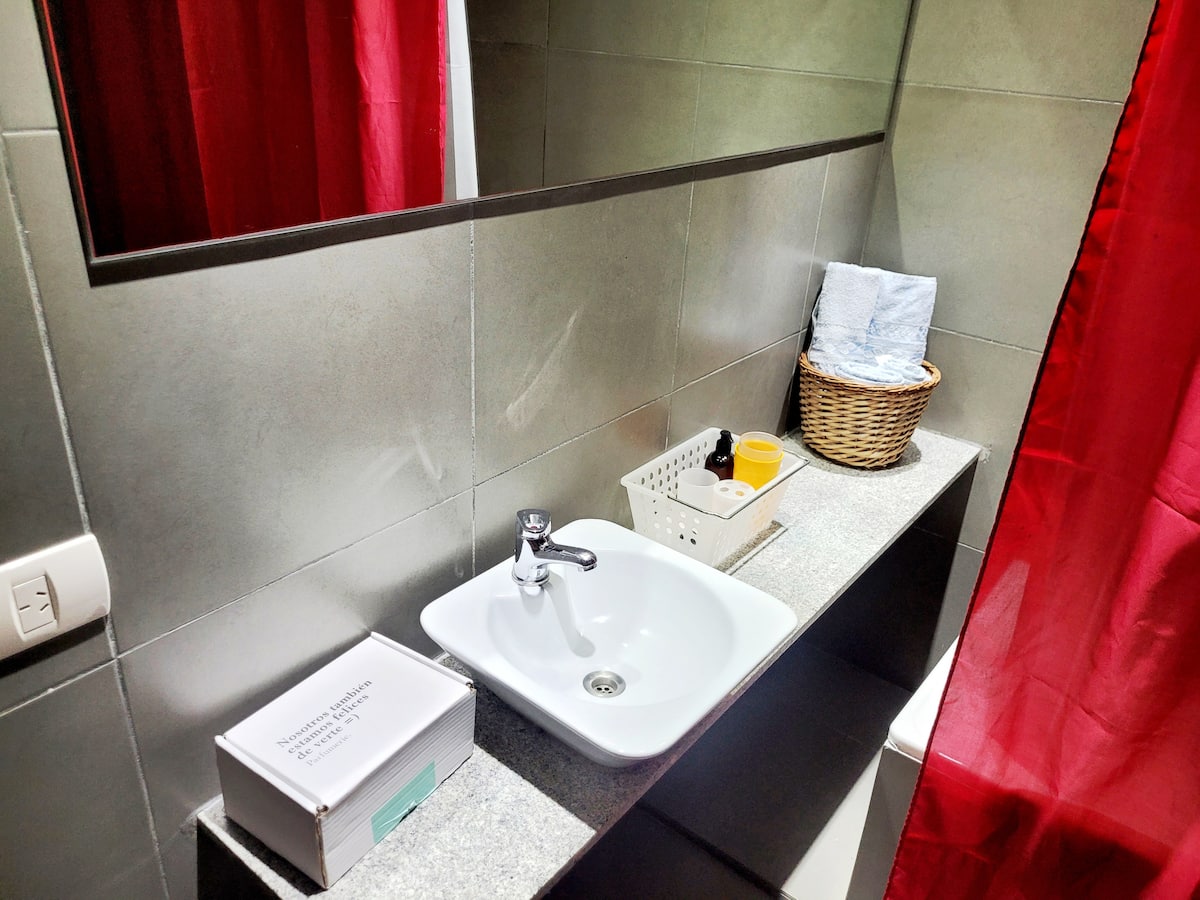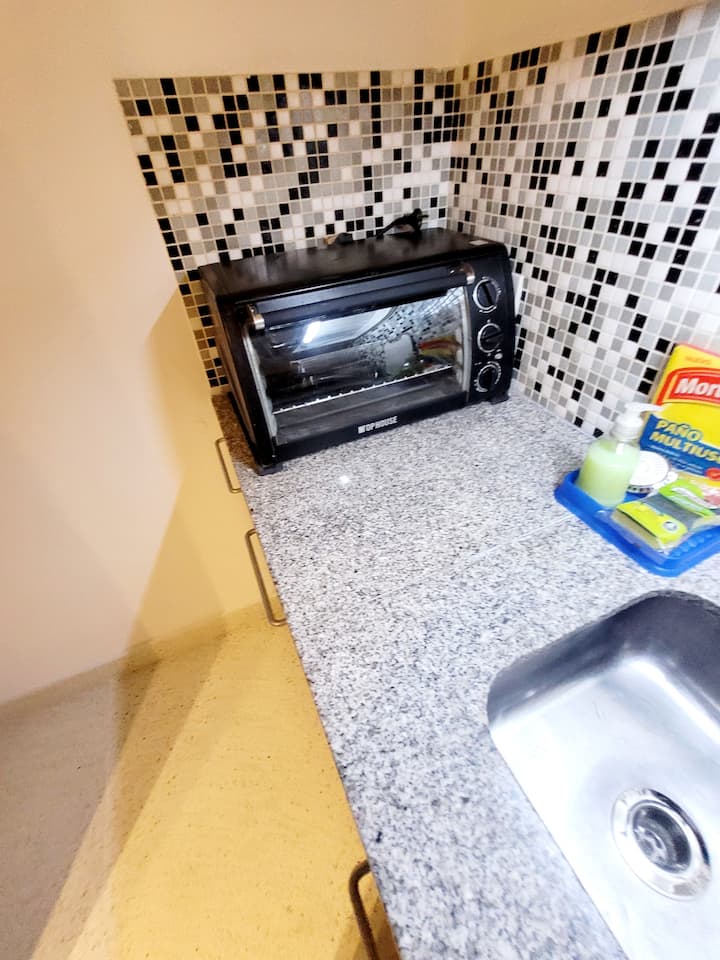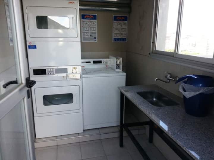 Studio apartment with 45 m² in Constitución, with a queen-size bed integrated into the living area, a kitchen, and a full bathroom. The unit has a balcony with a panoramic view. The kitchen is equipped with an induction cooktop, electric oven, microwave, toaster, electric kettle, and refrigerator, with basic cookware and utensils. Building amenities include a pool, native-plant garden, terrace with BBQ and panoramic view, free WiFi, and bike storage; there is also a laundry and drying room in th