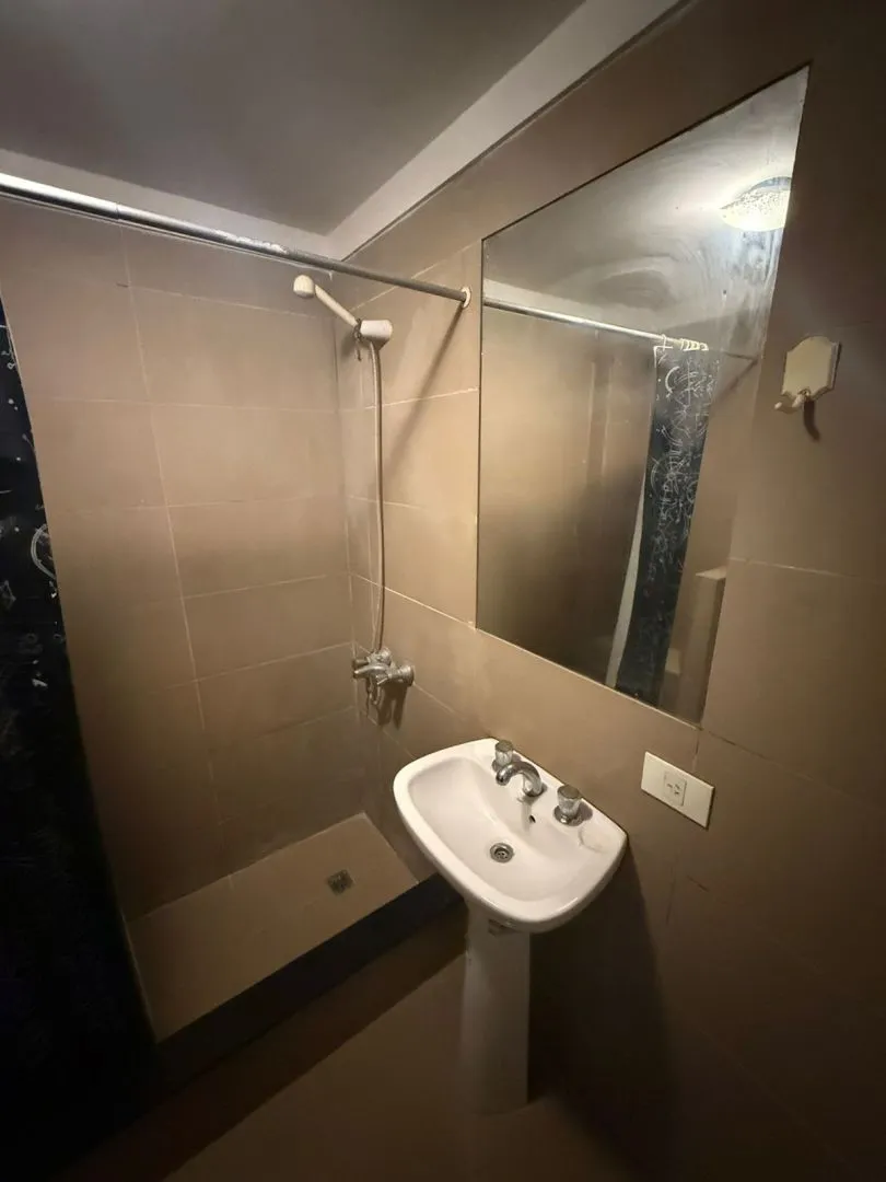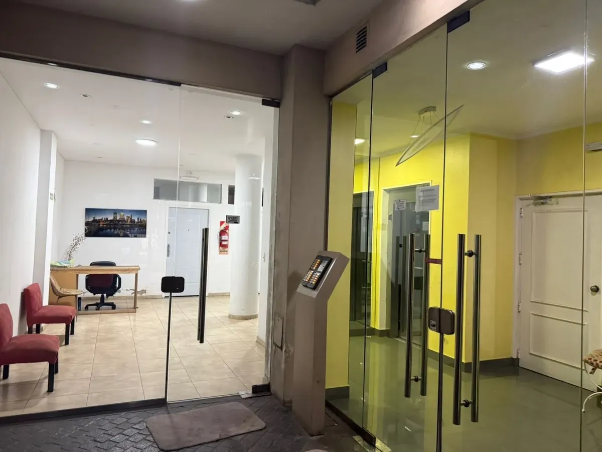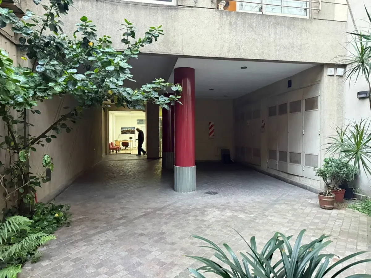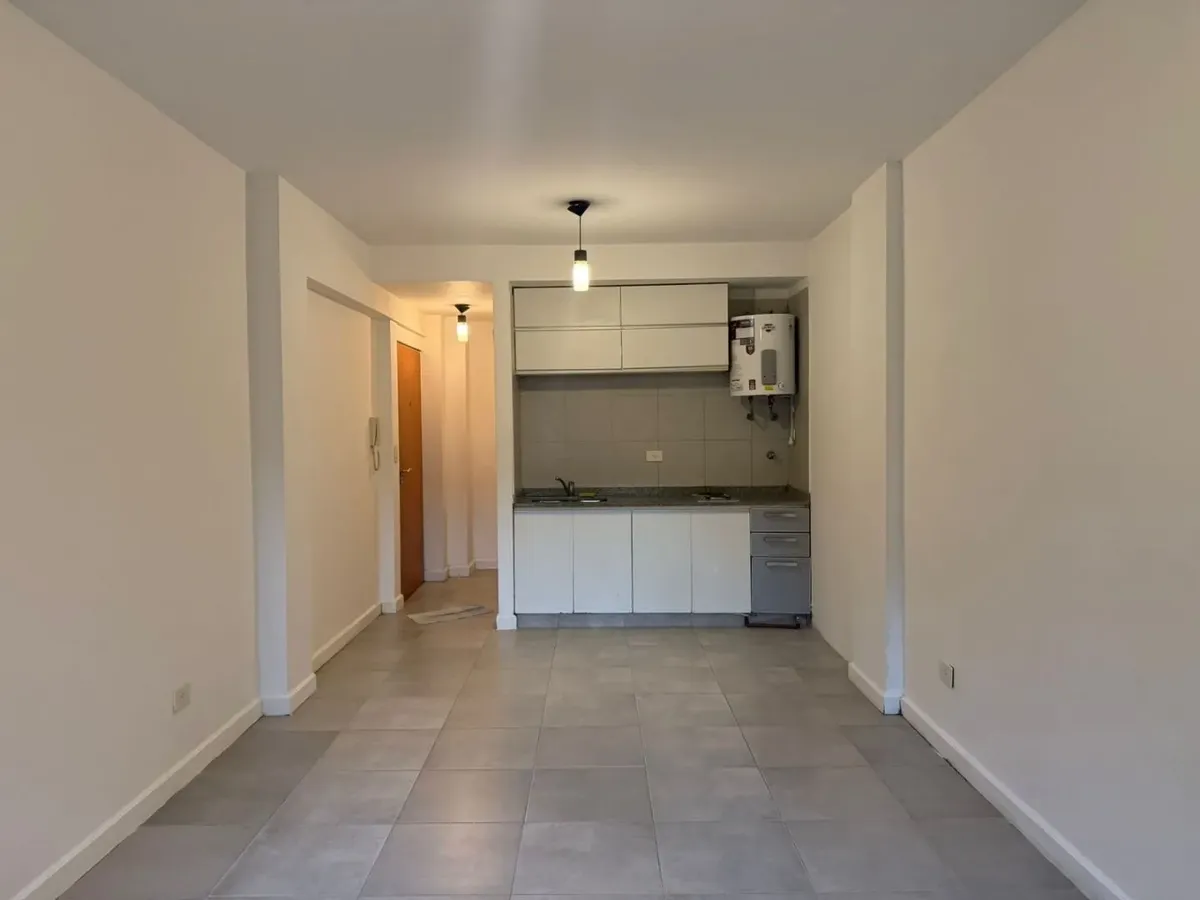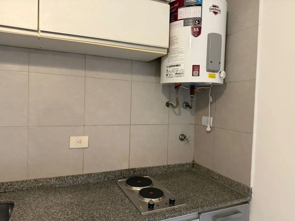 Studio apartment for rent in Flores, courtyard-facing (contrafrente) on the first floor. The unit has air conditioning, a full bathroom, and a kitchenette with under-counter storage and wall cabinets, plus an electric hotplate. There is a connection for a washing machine, and the building has a lift and a shared entrance landing with a garden. The property includes access to the SUM on the 13th floor, and the lease is for 24 months with quarterly IPC adjustment.