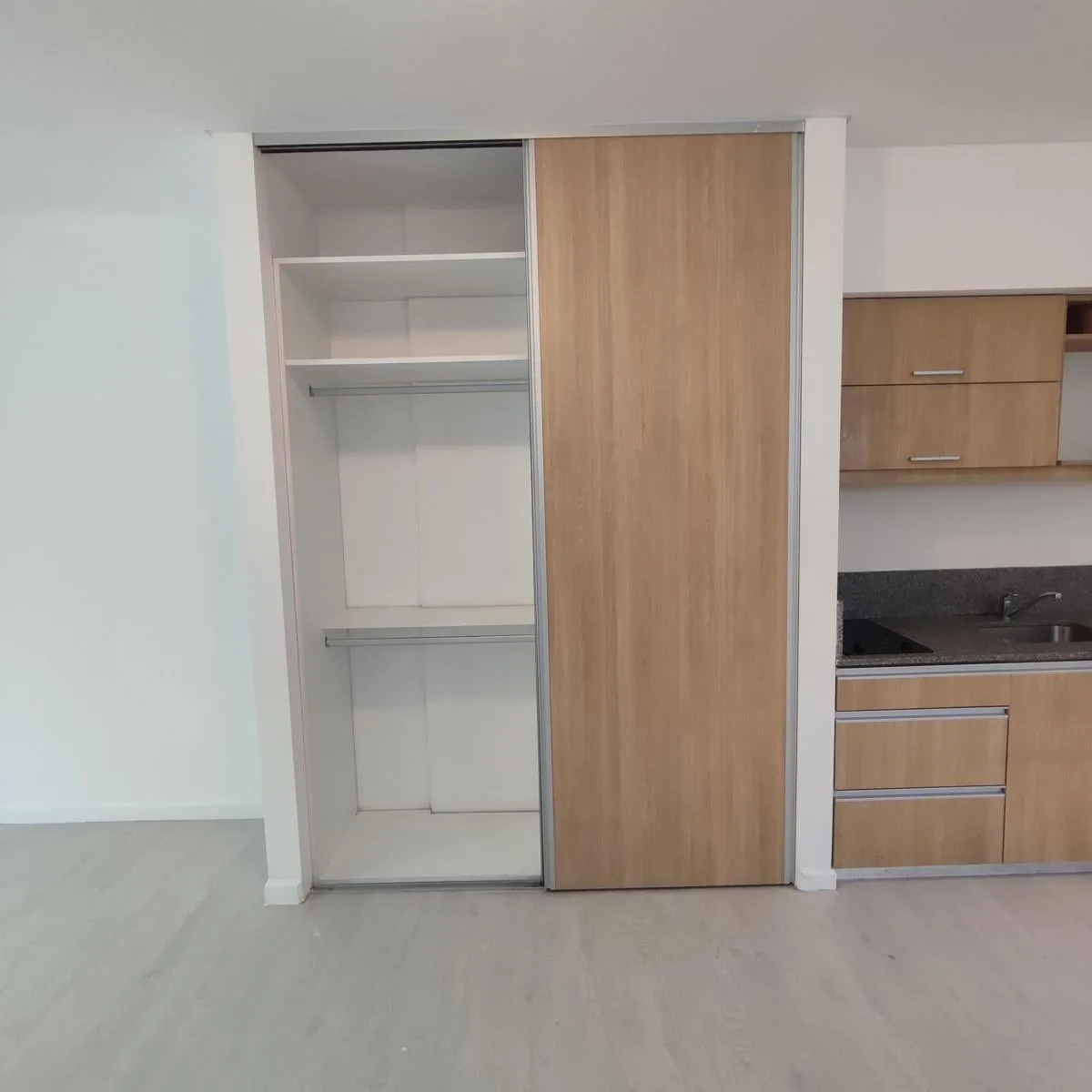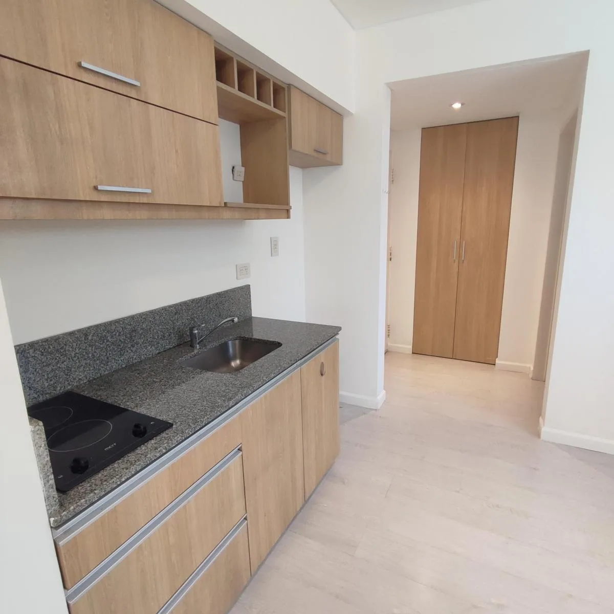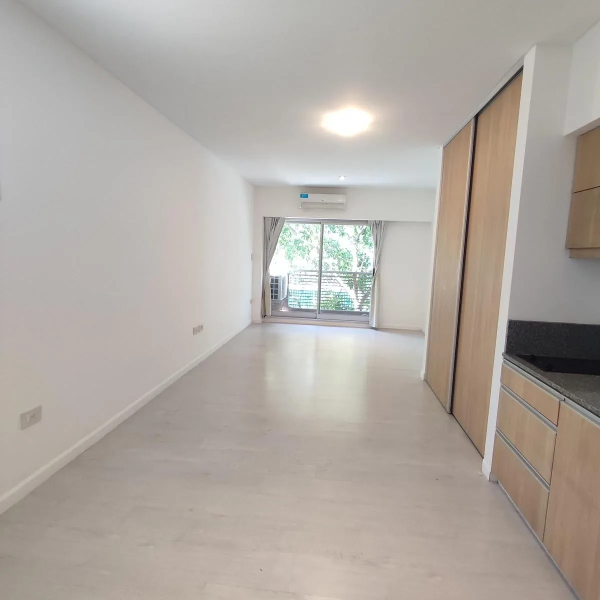 Studio apartment in Flores Norte on the 3rd floor, street-facing, with 30.79 m² total area. East-facing main window; kitchen and bathroom have glass bricks on the north side. Recently painted and well maintained, with double floor-to-ceiling wardrobe and mirror, plus a front balcony. Listing is direct by the owner and states no real-estate commission.