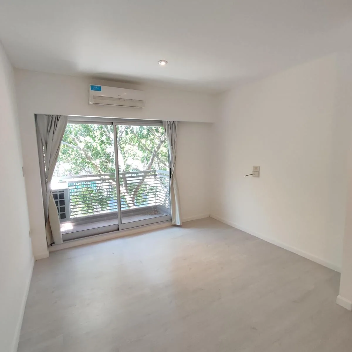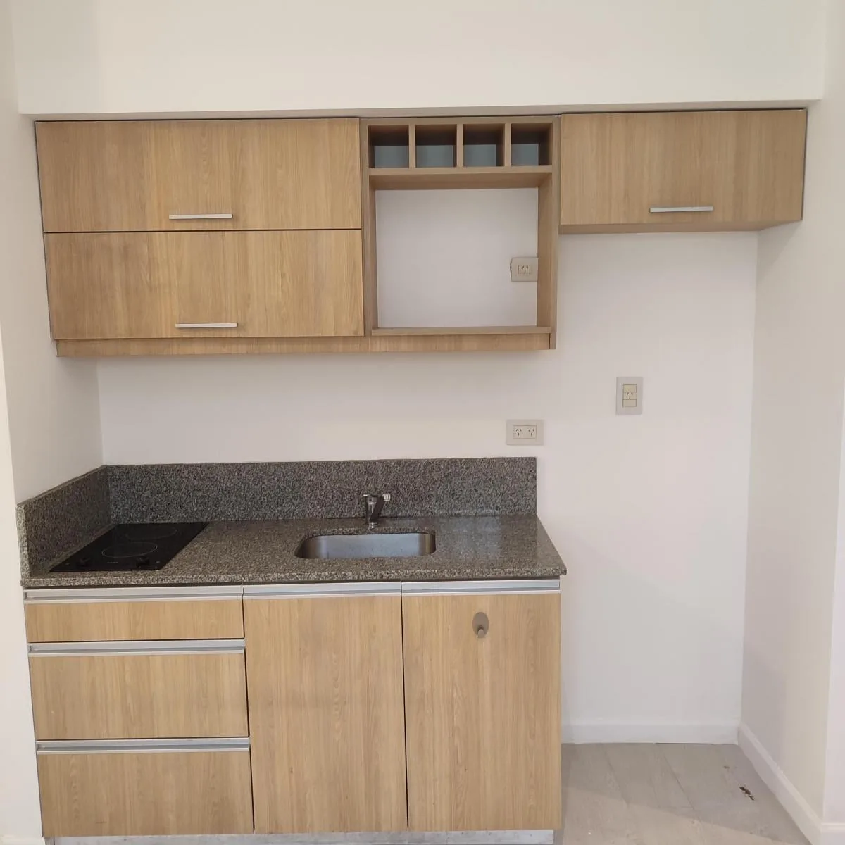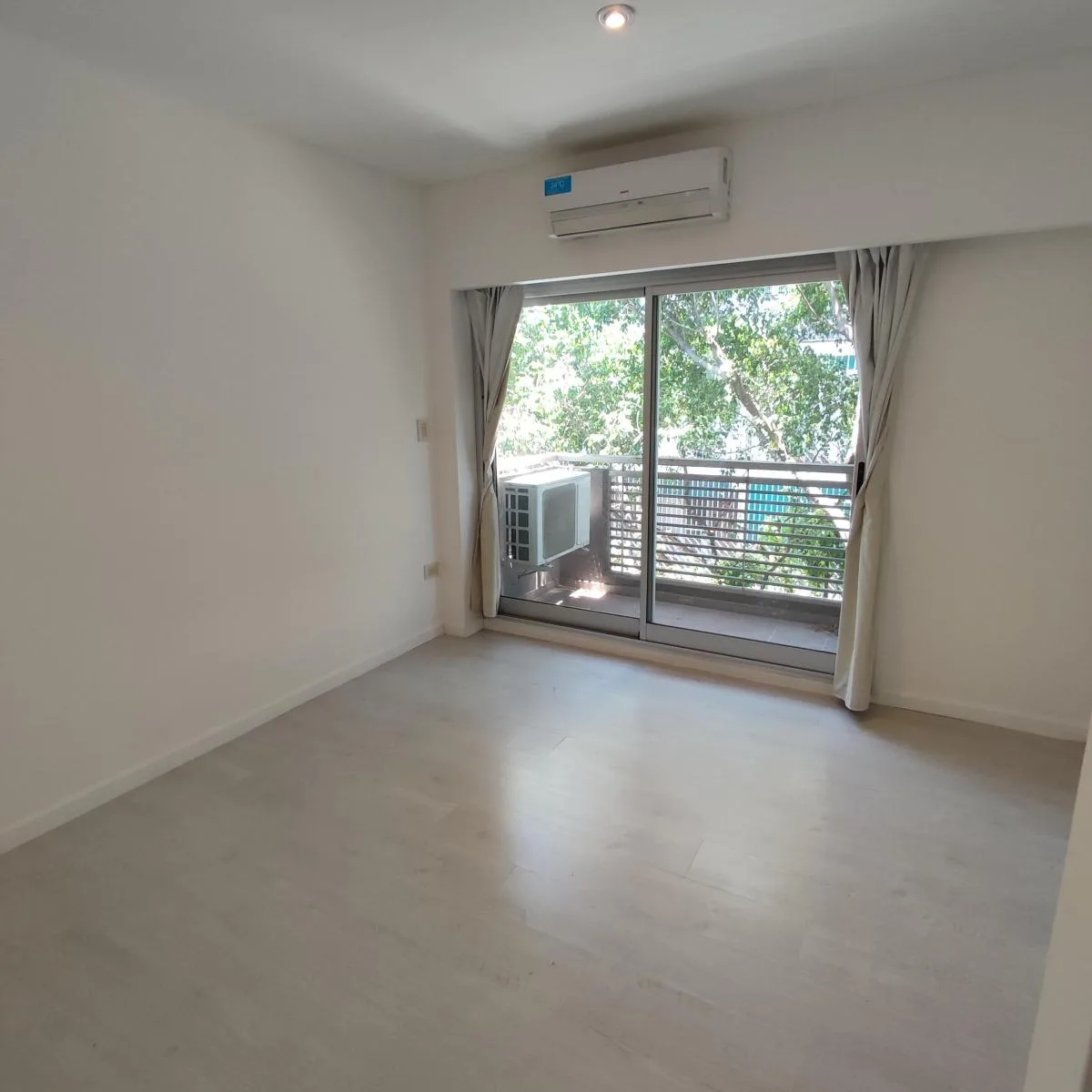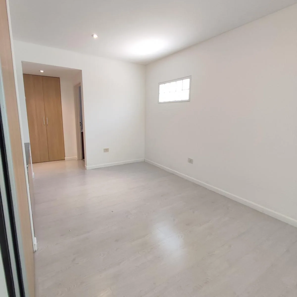 Studio apartment in Flores Norte on the 3rd floor, street-facing, with 30.79 m² total area. East-facing main window; kitchen and bathroom have glass bricks on the north side. Recently painted and well maintained, with double floor-to-ceiling wardrobe and mirror, plus a front balcony. Listing is direct by the owner and states no real-estate commission.