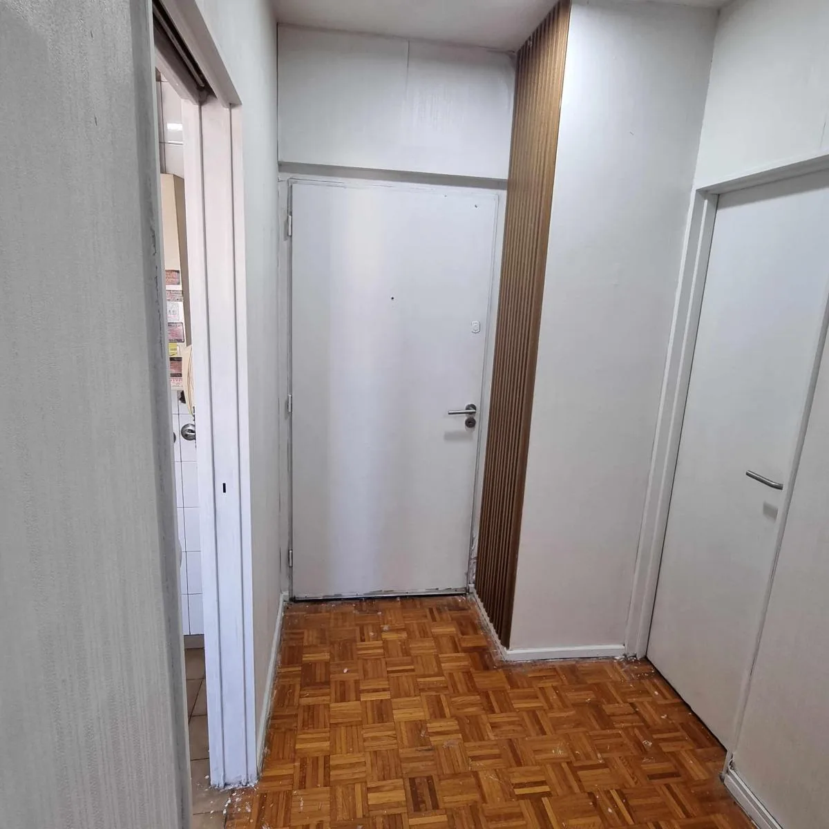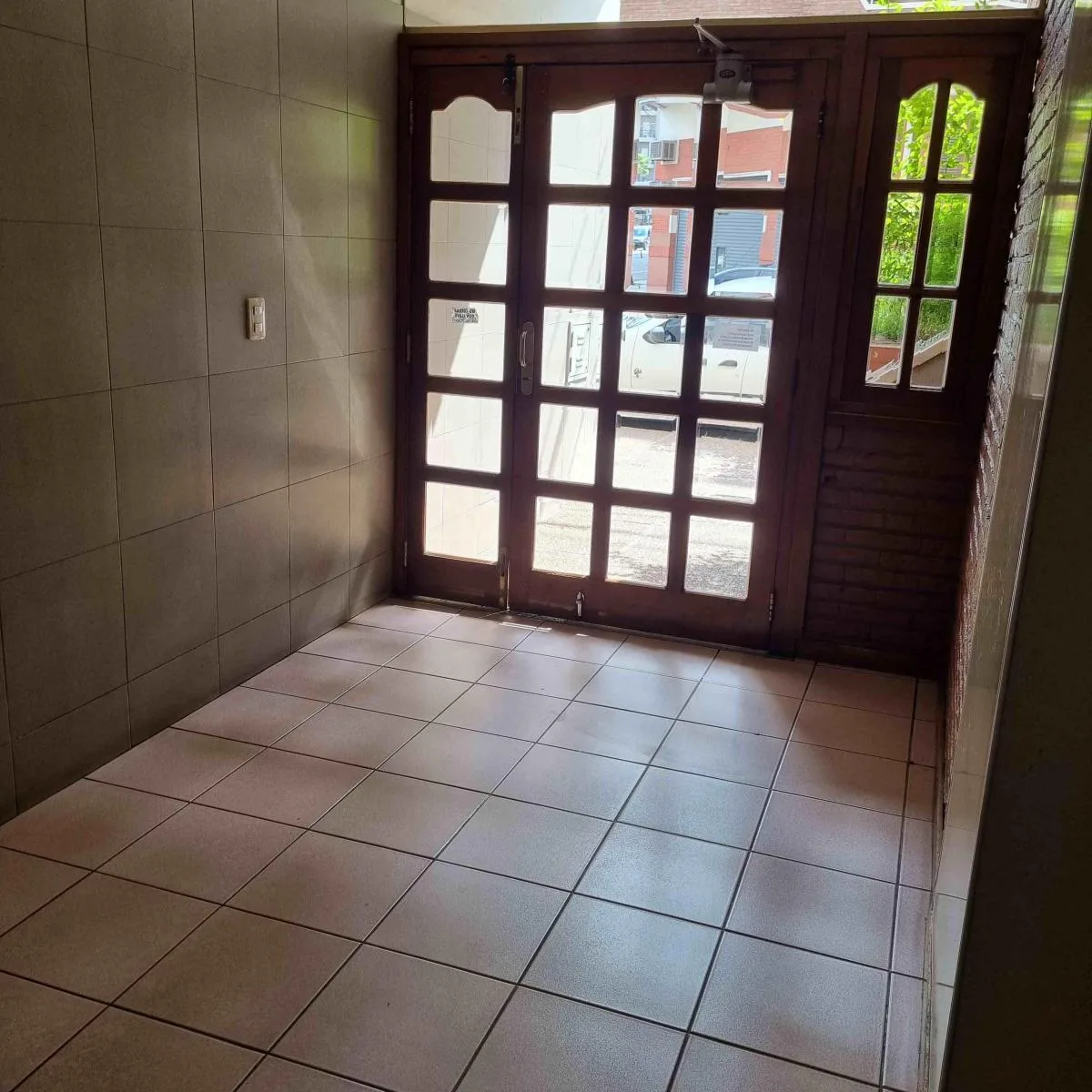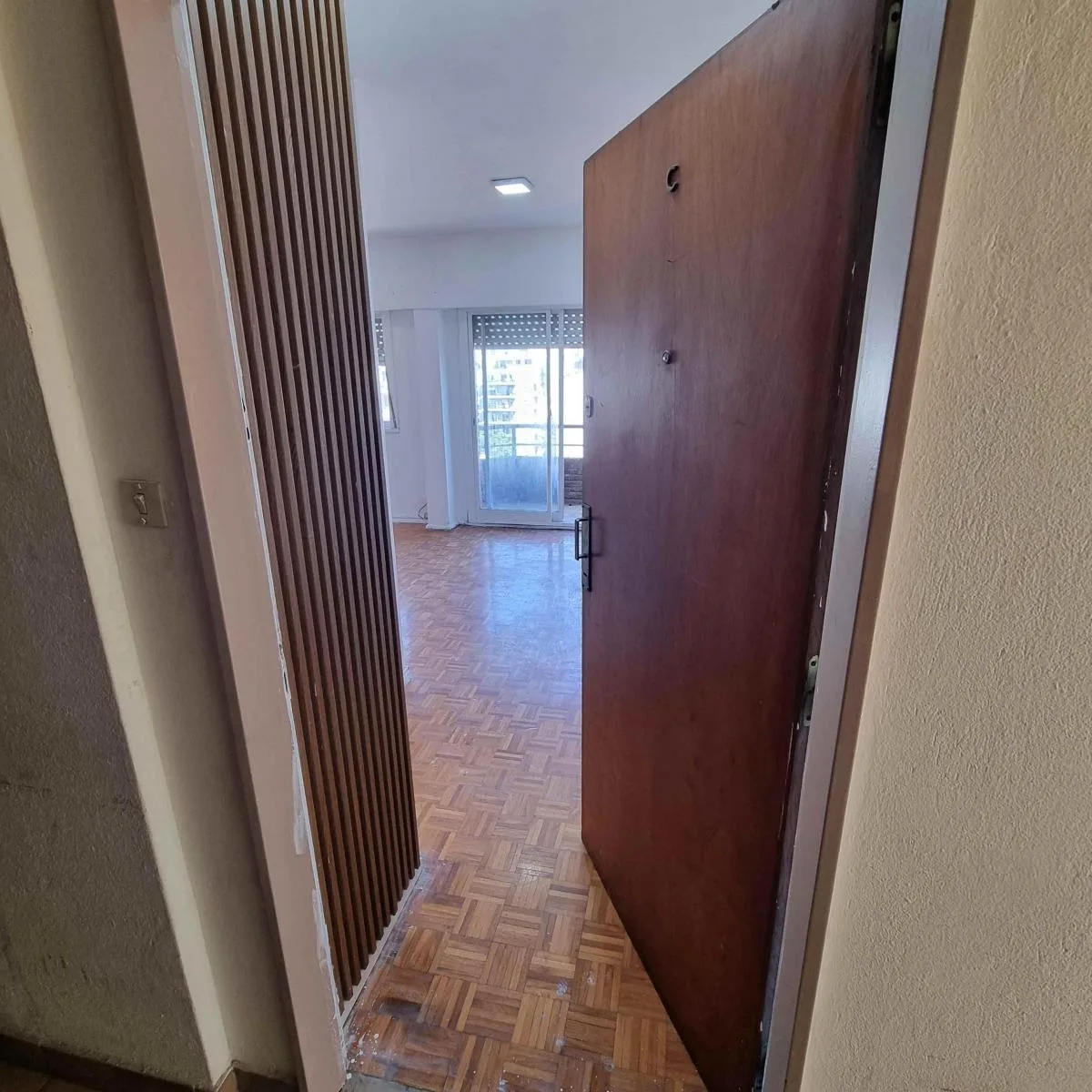 Studio apartment for rent in Flores, street-facing with a balcony. The unit is suitable for professional use and allows pets. It includes a separate kitchenette with renovated finishes, a full bathroom, and a laundry area.