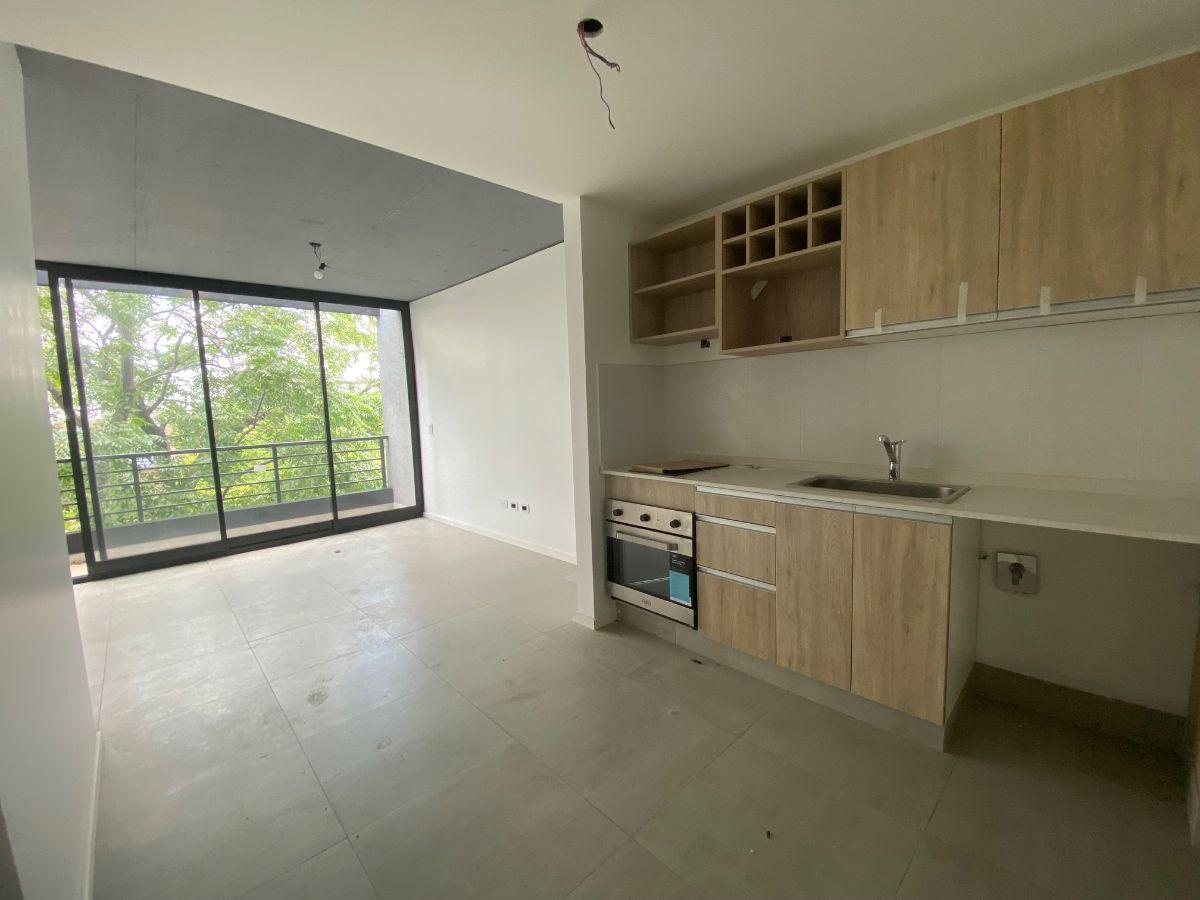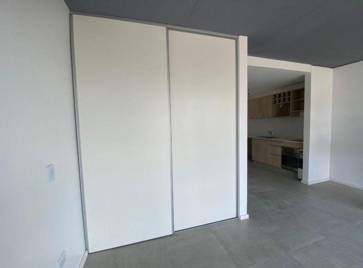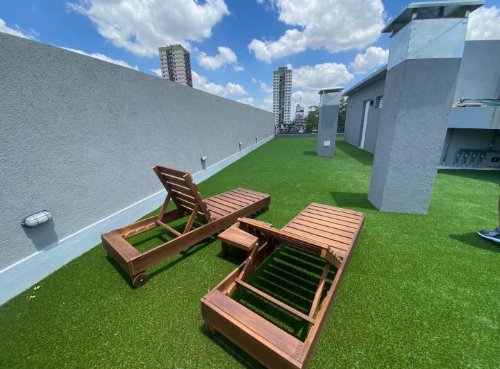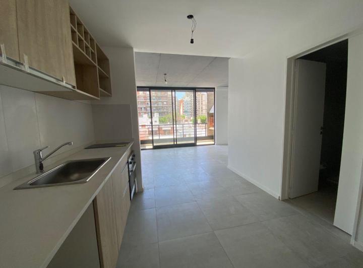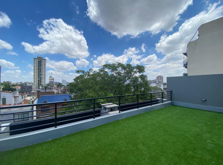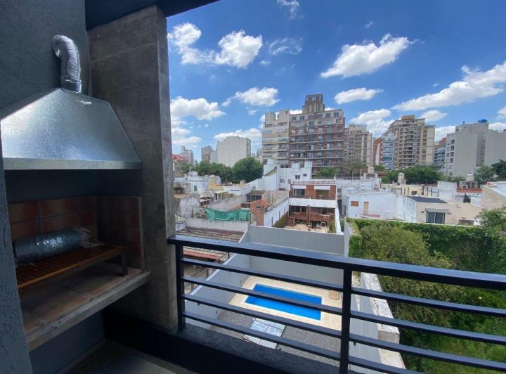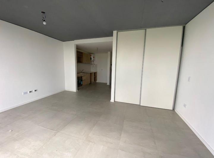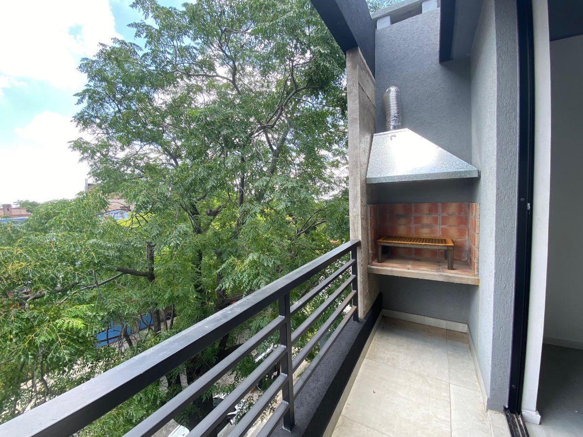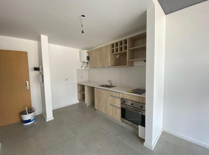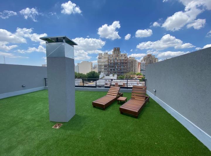 Studio apartment with a balcony courtyard-facing (contrafrente), with an individual BBQ grill. Covered bathroom, double-glazed windows (DVH), porcelain tiles and built-in storage. The kitchen has fitted cabinets and a breakfast bar. The building has a pool and a solarium. Optional parking space is available; location is on Calle Caracas at 800, near Av. Gaona and Av. Boyacá.