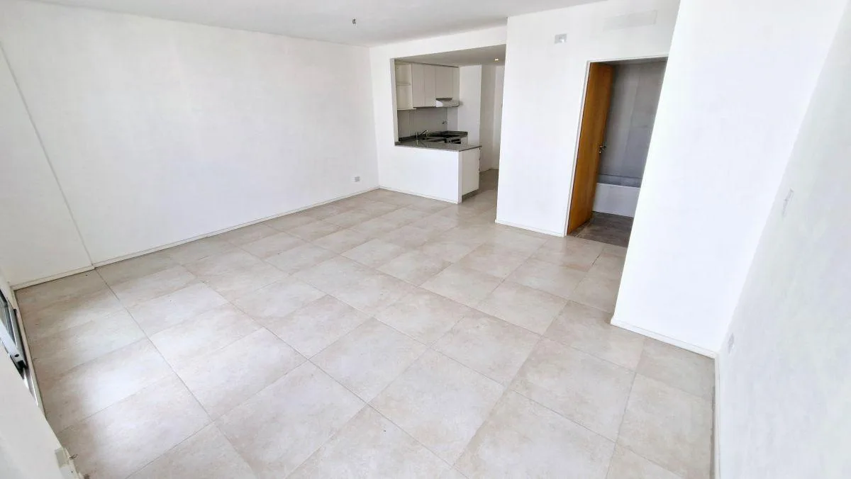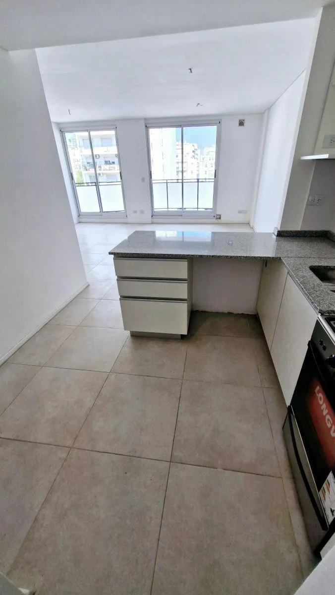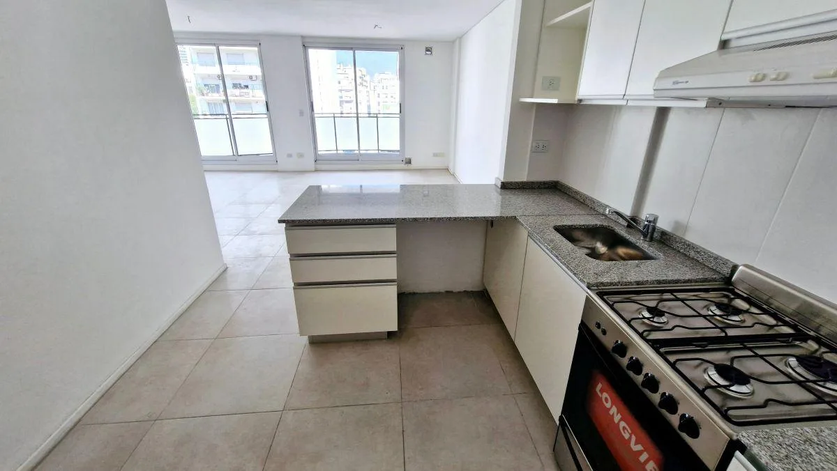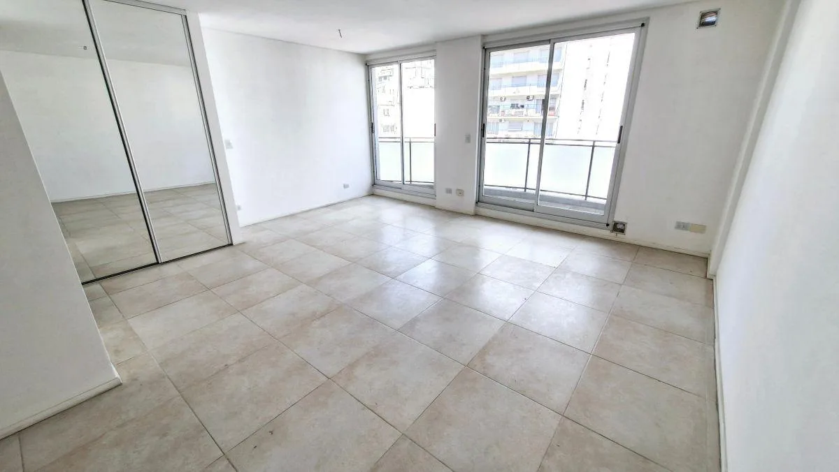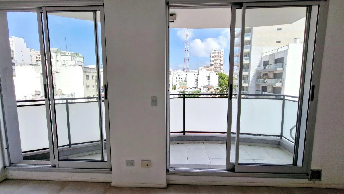 Studio apartment of 47 m², 3rd floor, courtyard-facing with a continuous balcony. The space measures 5.30 x 4.80 m and includes a mirrored wardrobe. Integrated kitchen (2.80 x 2.30 m) with base cabinets, wall cabinet, breakfast bar and a connection for a washing machine; full bathroom with vanity and bathtub, plus a toilet with vanity. Building amenities include a pool, equipped quincho, grill, solarium and lobby; building fees include AYSA. 150 metres from Av. Rivadavia and close to Subte Línea