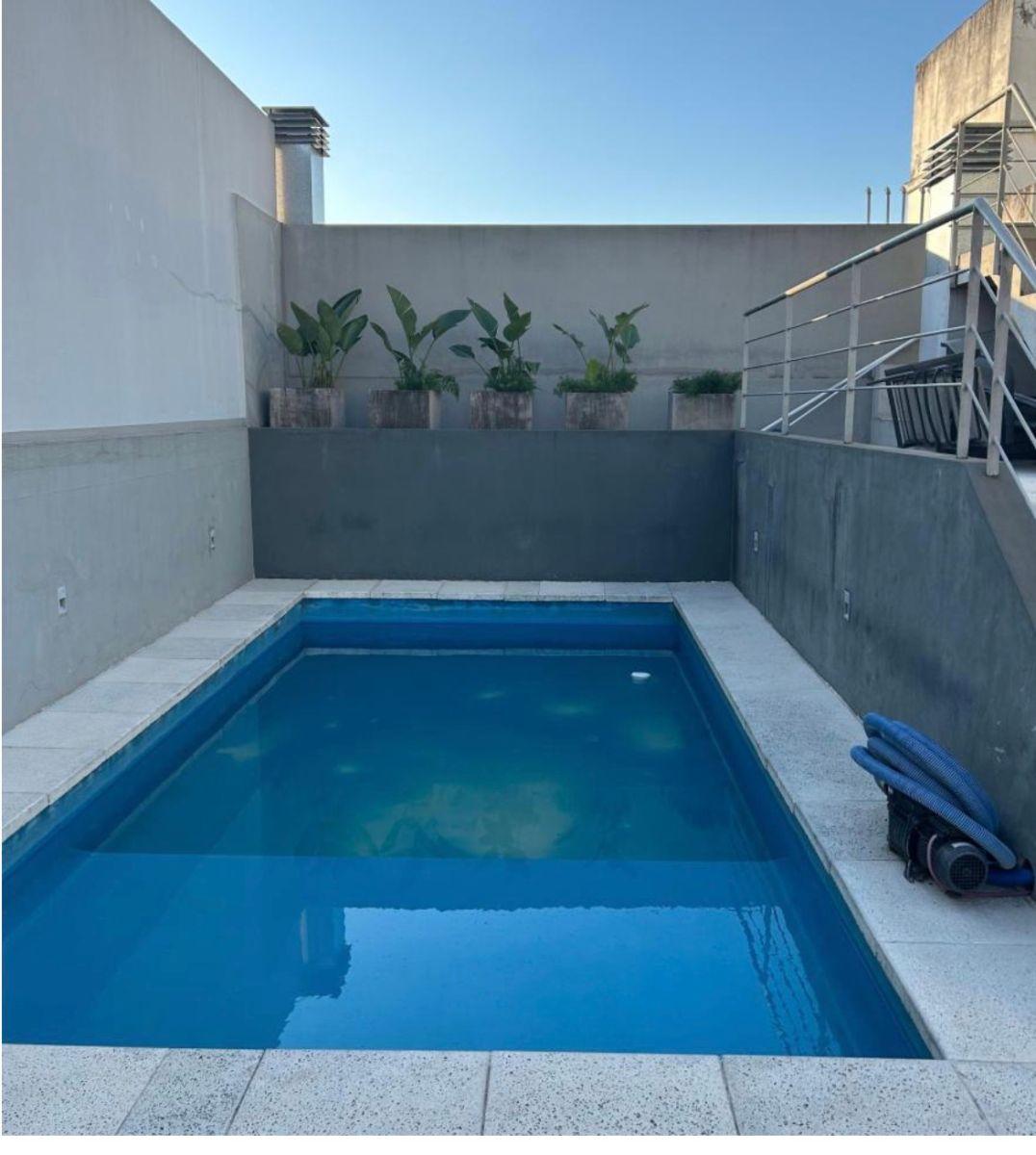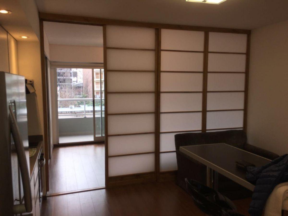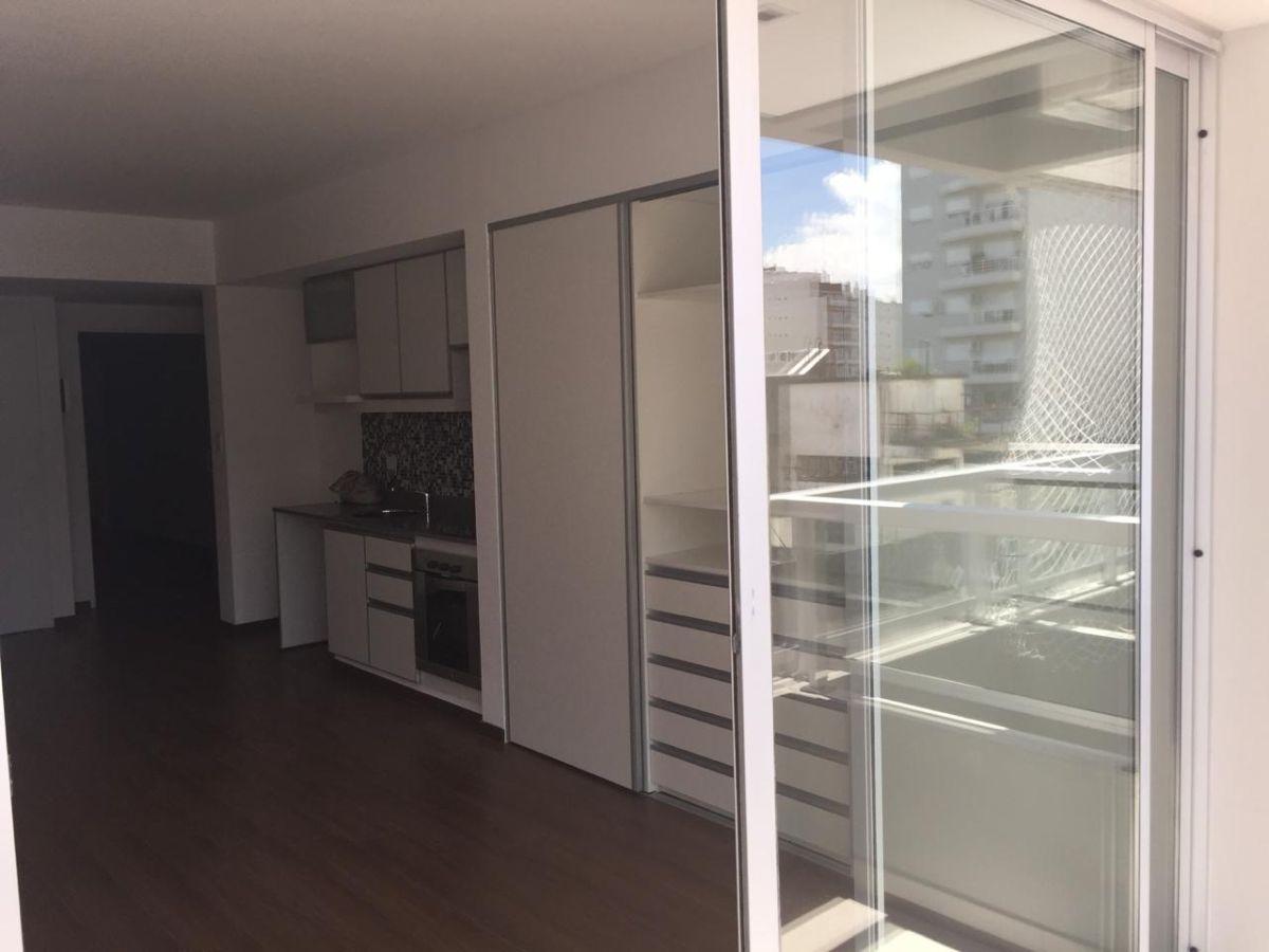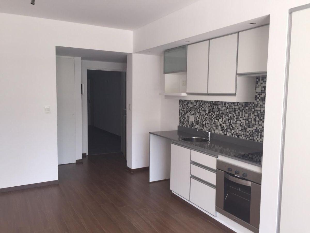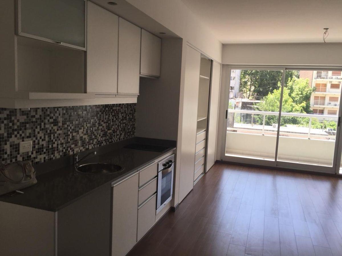 Split studio apartment with a balcony on the courtyard-facing side, with open views. Includes blackout curtains, light fixtures, a full bathroom with mirror, shower screen and vanity, and a built-in wardrobe. Heating and cooling via cold/heat air conditioning; electric-only appliances. Full electric kitchen with an oven. The building has a communal room (SUM), pool and solarium. Three blocks from Subte Line A, estación Carabobo.