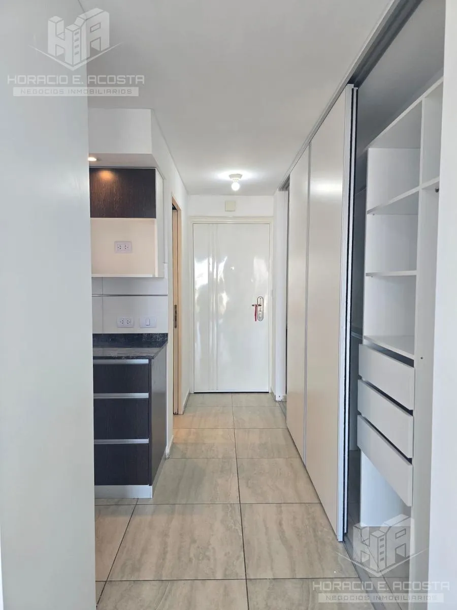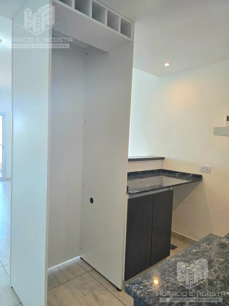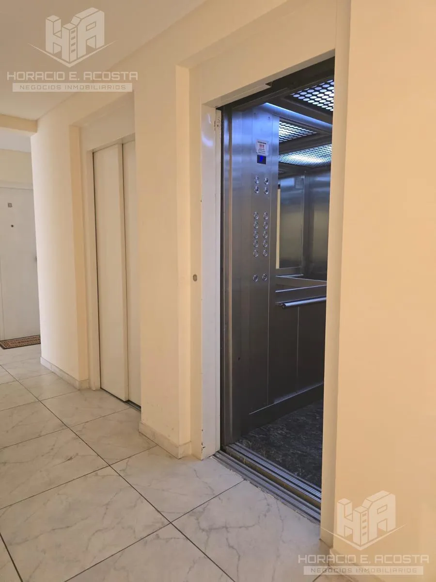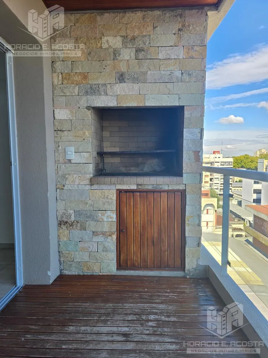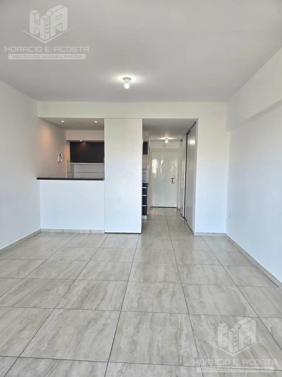Studio apartment in the centre of General San Martín, on Calle Rivadavia between Salguero and Carrillo, courtyard-facing with a balcony. The unit has a lateral 4-door sliding closet with complete interior, an electric water heater, and a bathroom with tub and full fixtures. The semi-integrated kitchen includes a pantry and lower cabinets and has a connection for a washing machine; the balcony has a deck and a private grill. The building has an outdoor pool and double lifts; utilities are electri