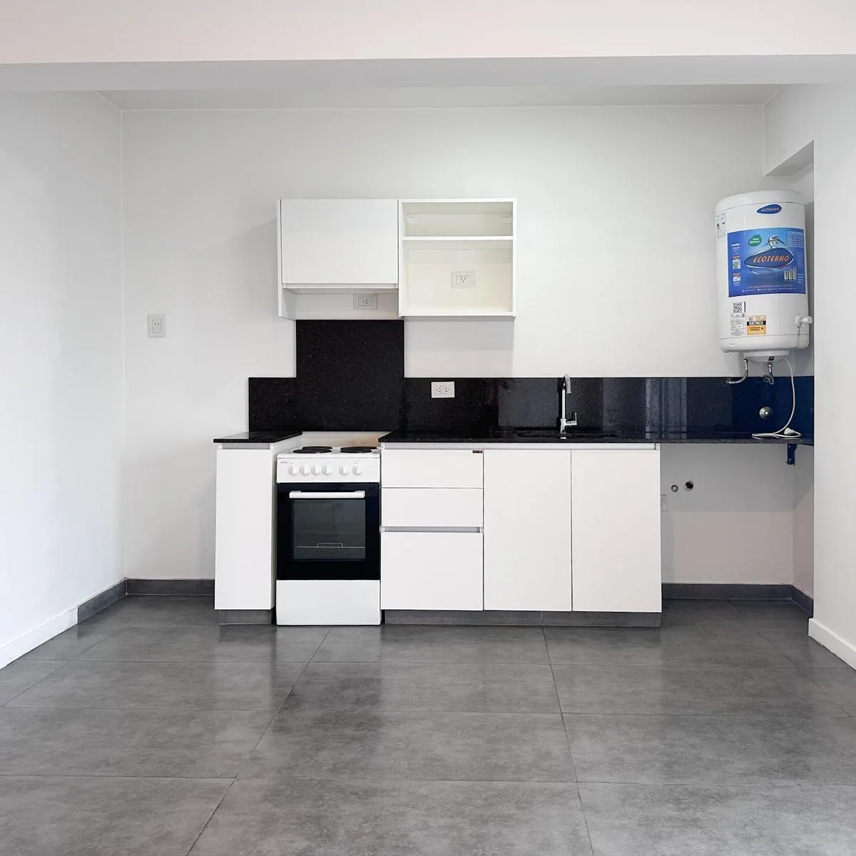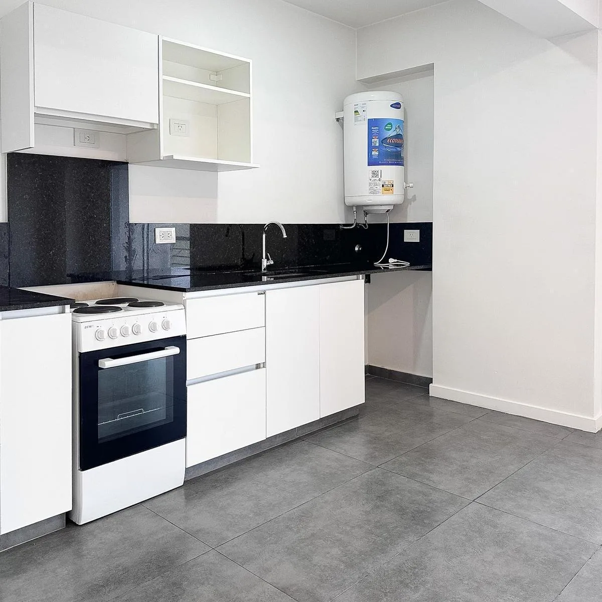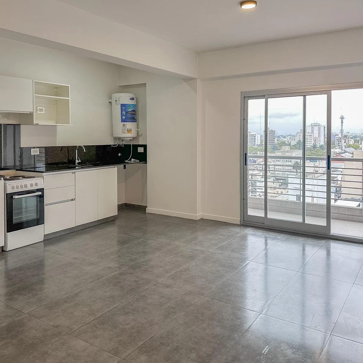 Studio apartment for rent with integrated kitchen, under-counter cabinets and an upper pantry, complete bathroom and a balcony with open views. The building has a BBQ area, gym and pool. Pets are not accepted.